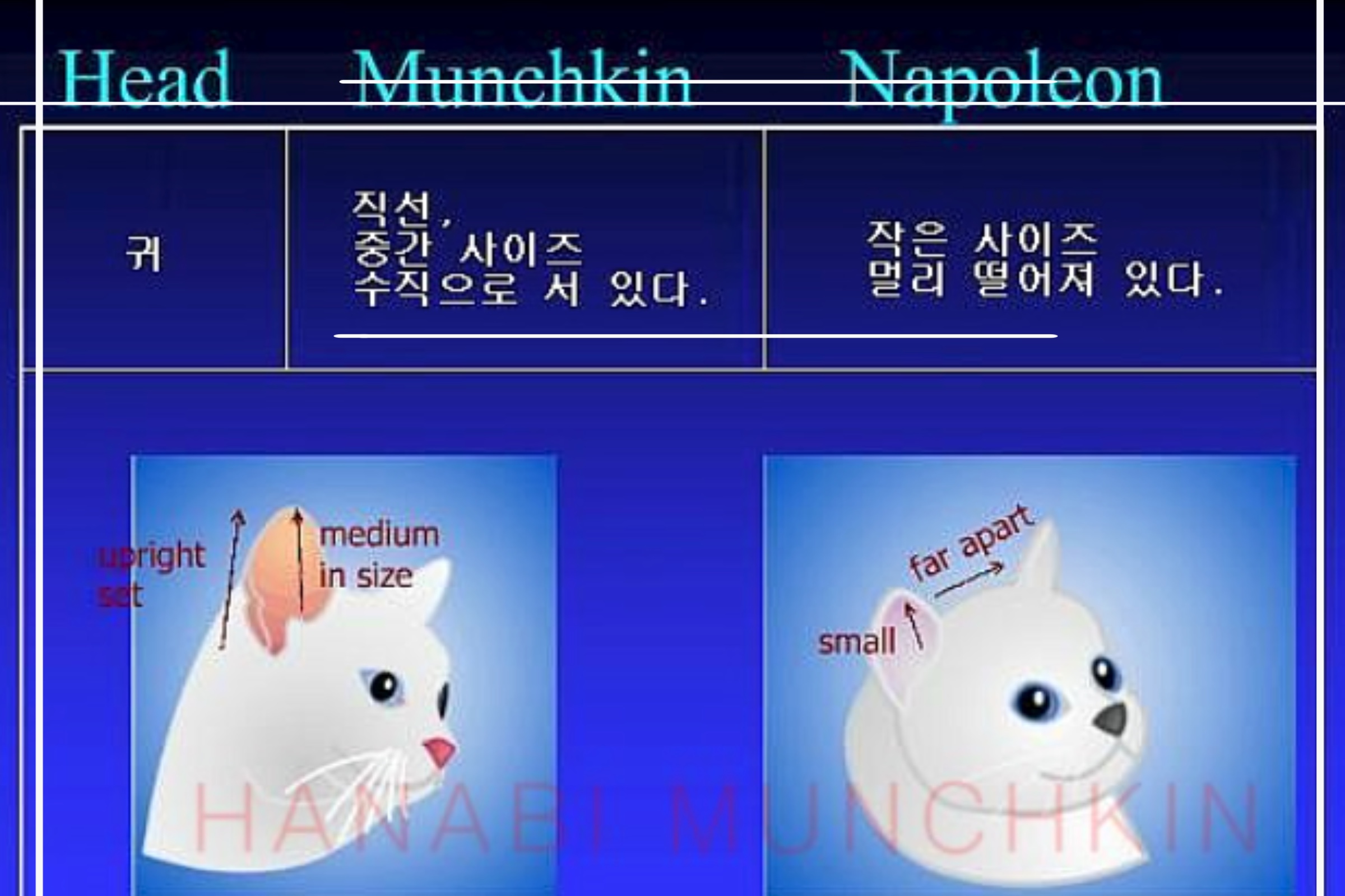 양쪽 귀의 사이가 멀게 멀어져 있으며 먼치킨의 중간 사이즈 크기보다 작은 사이즈의 귀를 가지고 있습니다. |