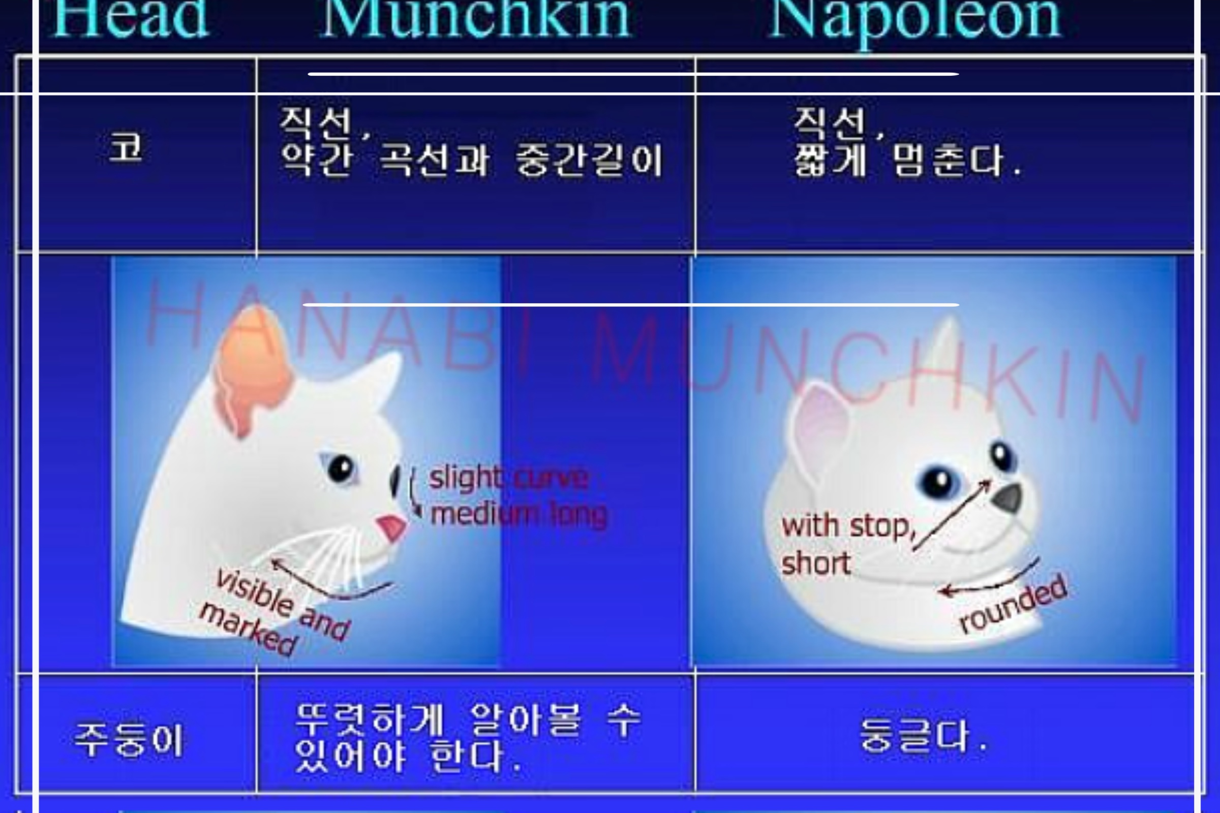 먼치킨의 주둥이는 날렵한게 뚜렷하게 알아볼 수 있어야 합니다. |