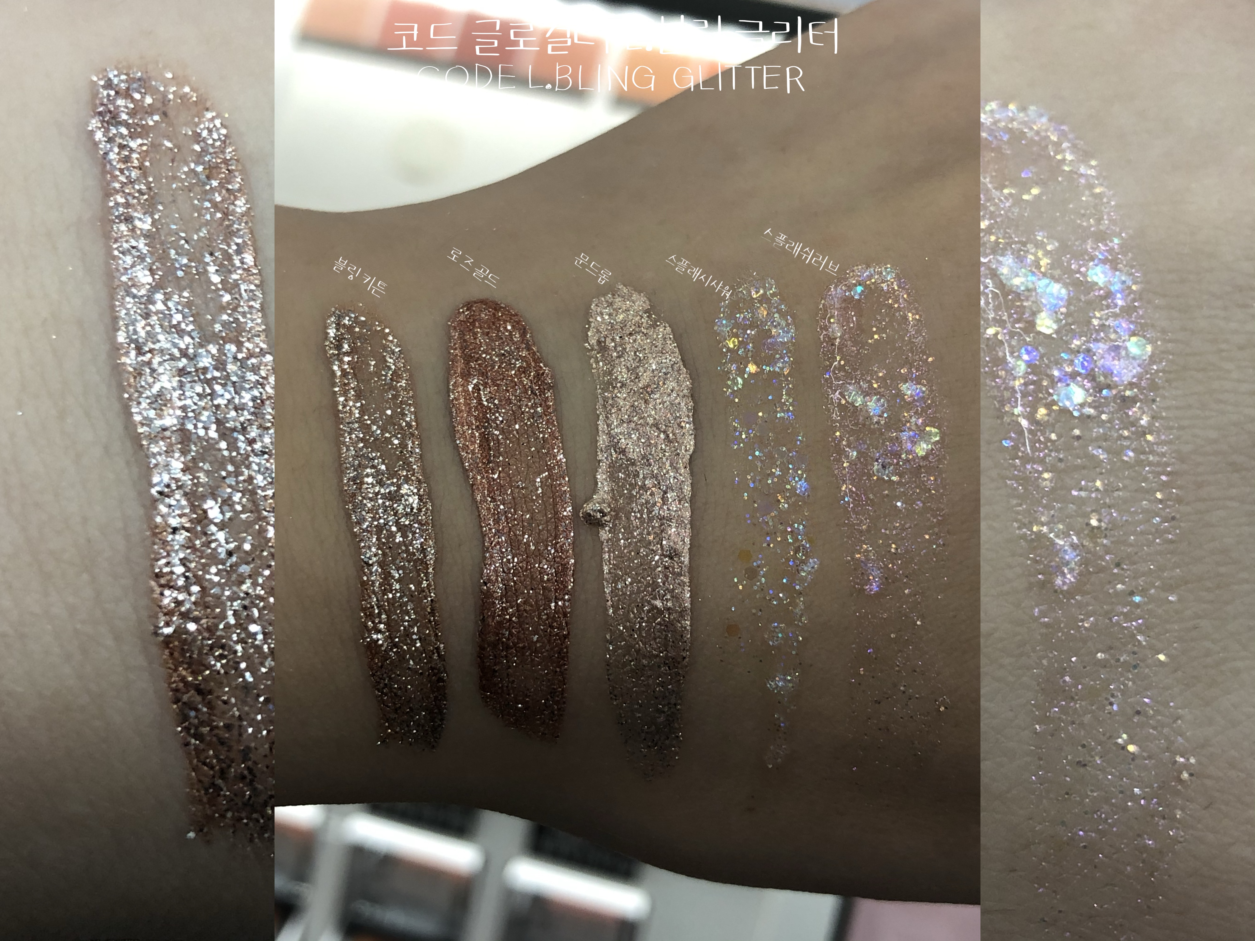 코드글로컬러 L.블링 글리터는 화려한 글리터와 자잘한 펄이 영롱하게 또는 쉬머하게 빛나는 글리터 리퀴드 섀도우로 다이아몬드를 갈아 넣은 듯 차르르 빛나는 미세 펄들의 반짝임부터 파워풀한 빅사이즈의 오로라 글리터가 들어있는 감각적인 리퀴드 글리터 섀도우 입니다.
