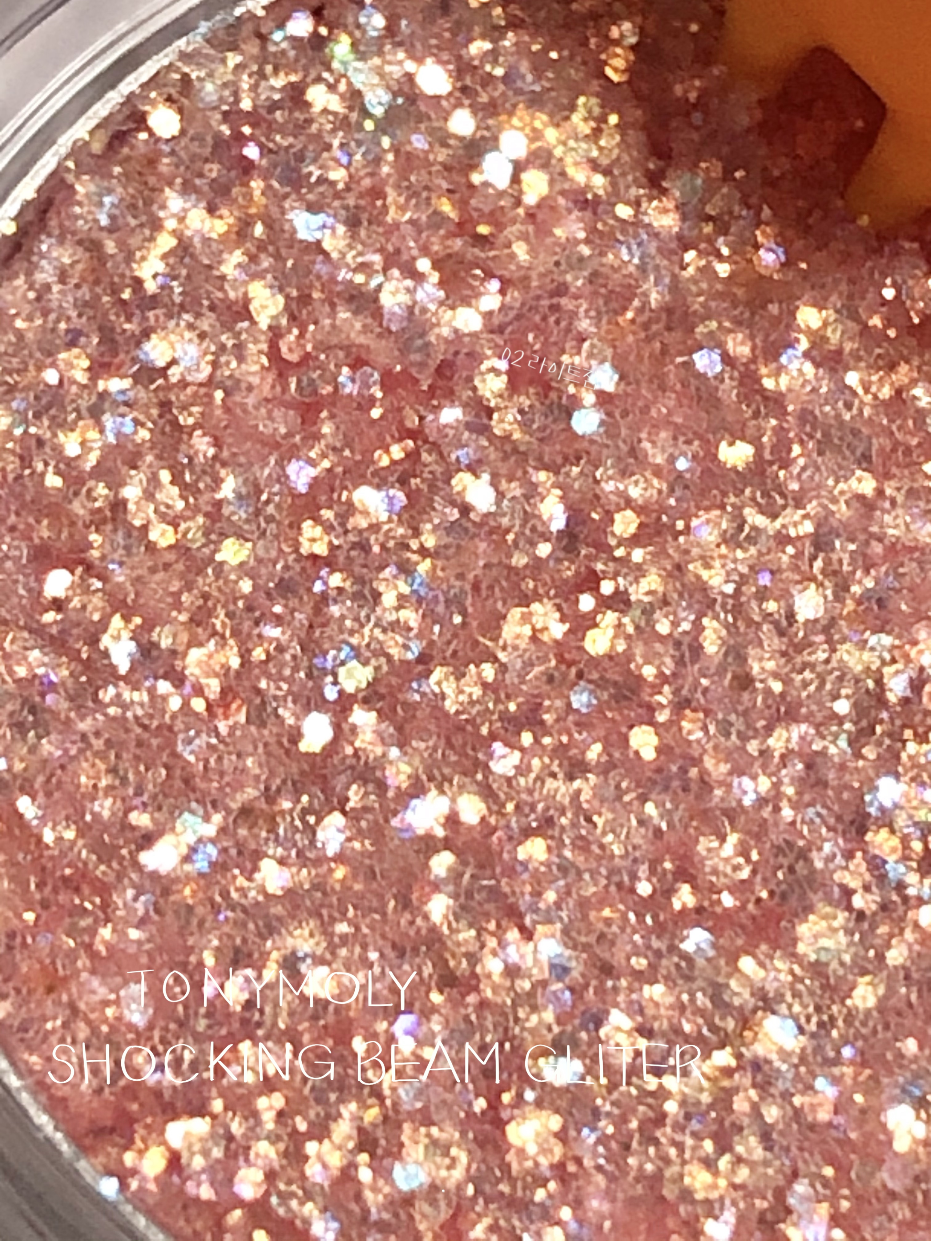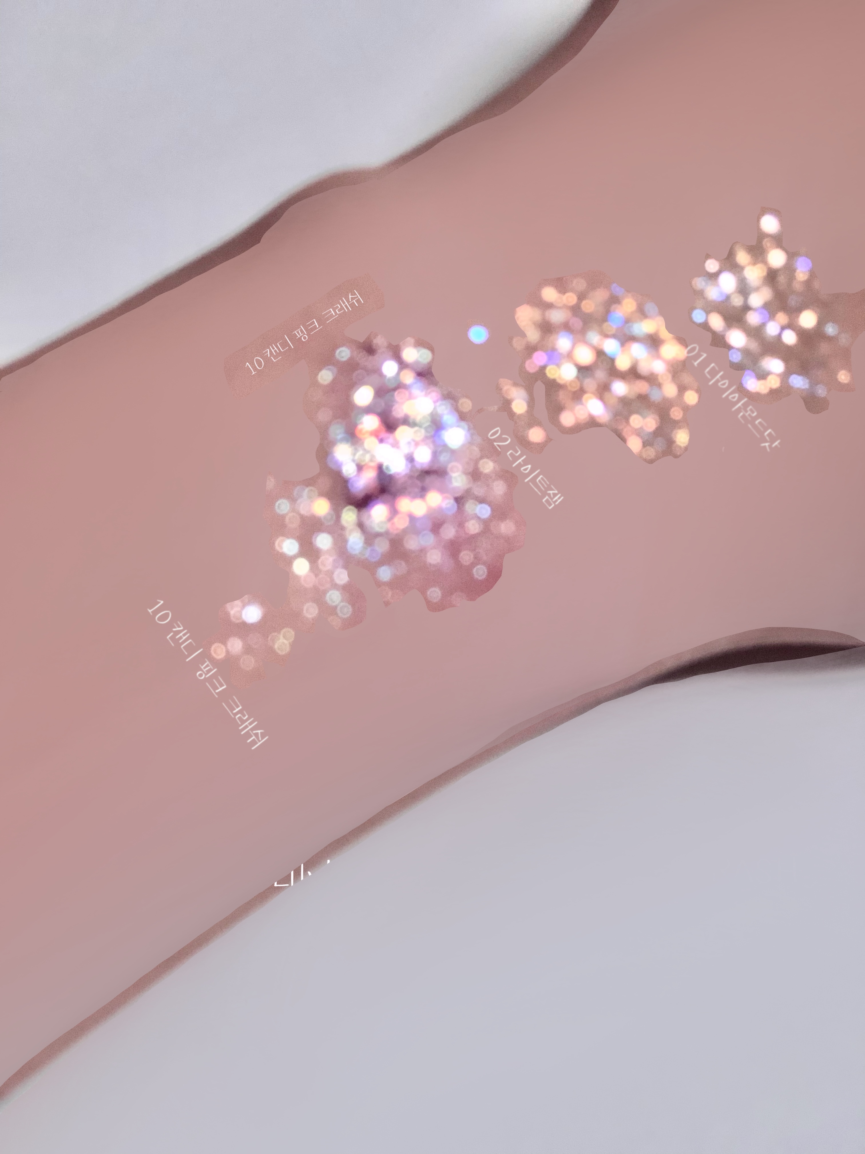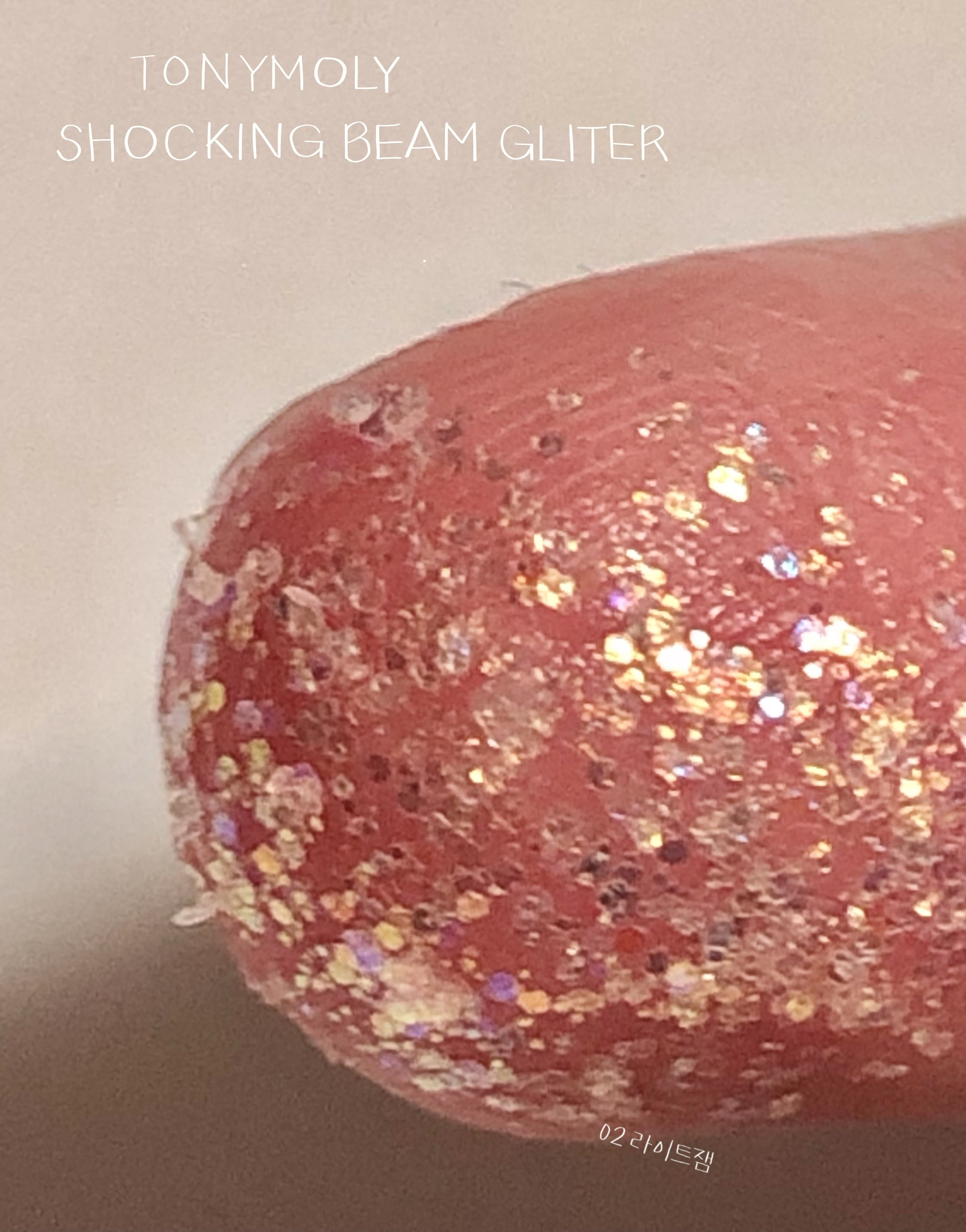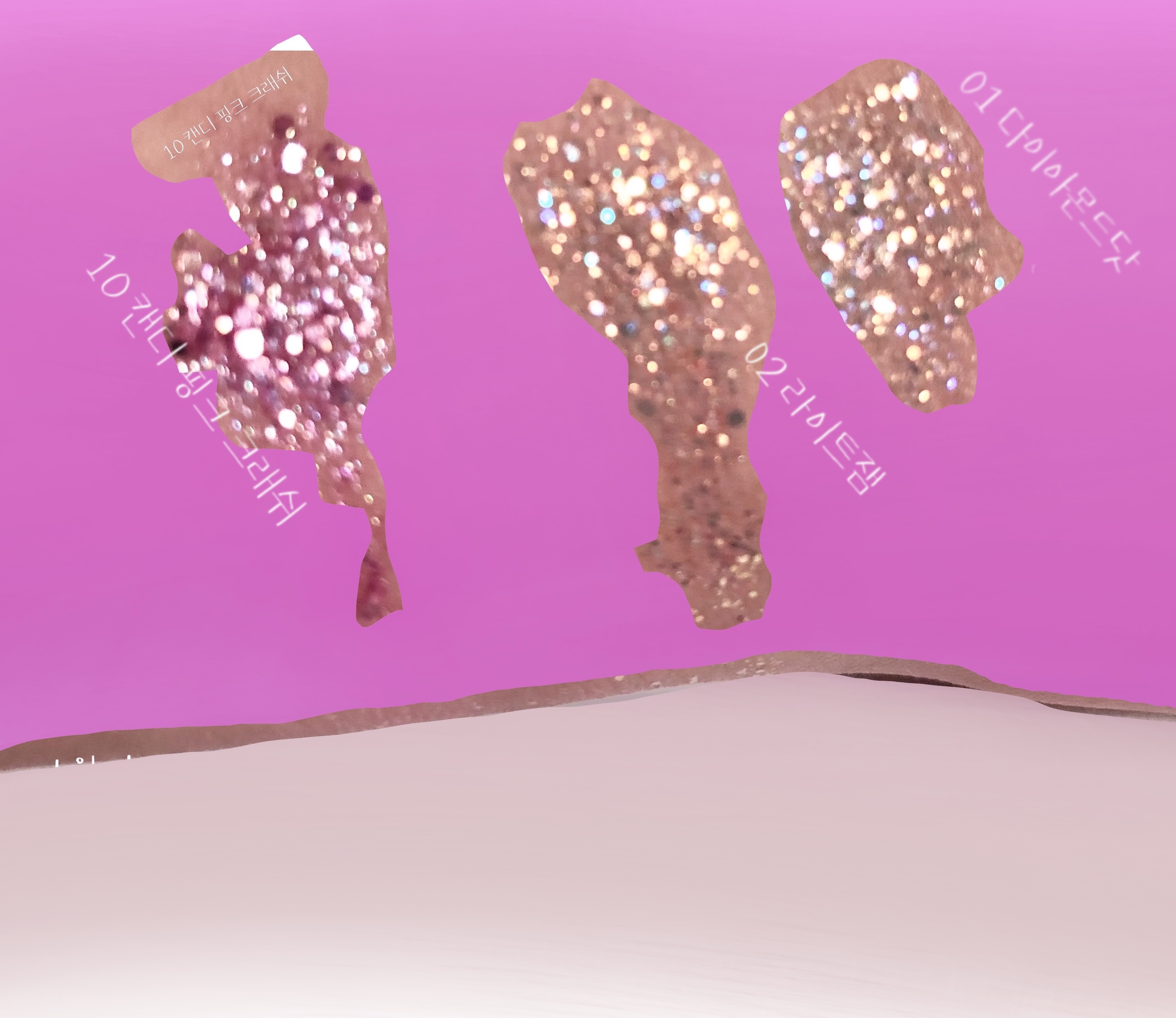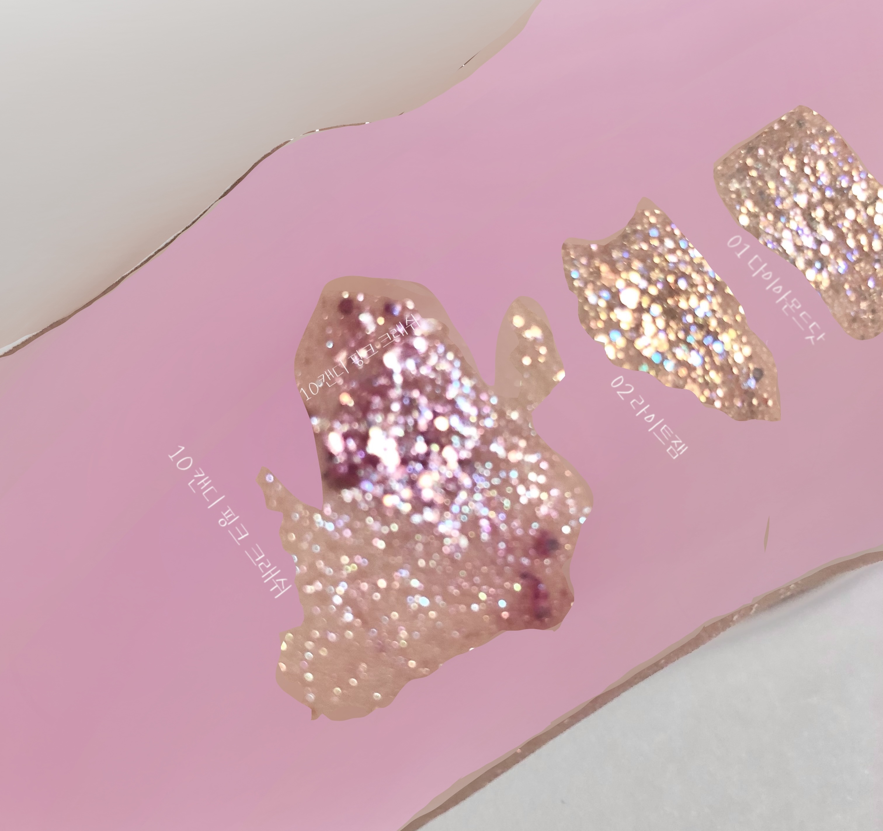 피치 펄 속에 각글리터가 숨어있어요. 나머지는 그 보다 작은 글리터가 블링블링을 돕습니다.