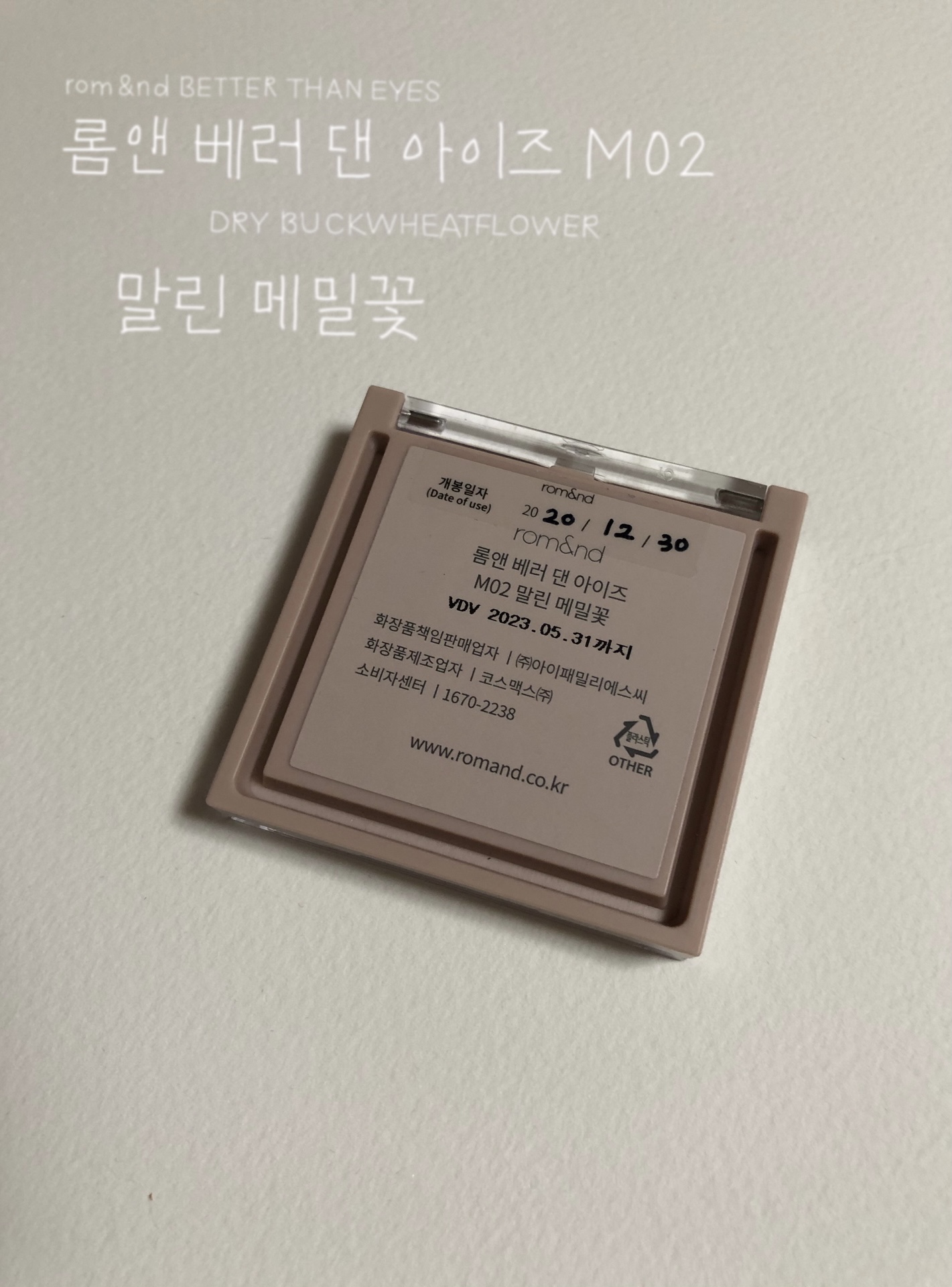 롬앤 베러 댄 아이즈 M02 말린 메밀꽃 rom&nd BETTER THAN EYES DRY BUCKWHEATFLOWER 가격 : 14,000원 가격 : 16,000원 용량 : 6.5g 쉐이드 : 부들부들 완전 밀가루같은 질감으로 피부에 착착 감기는 섀도우 입..
