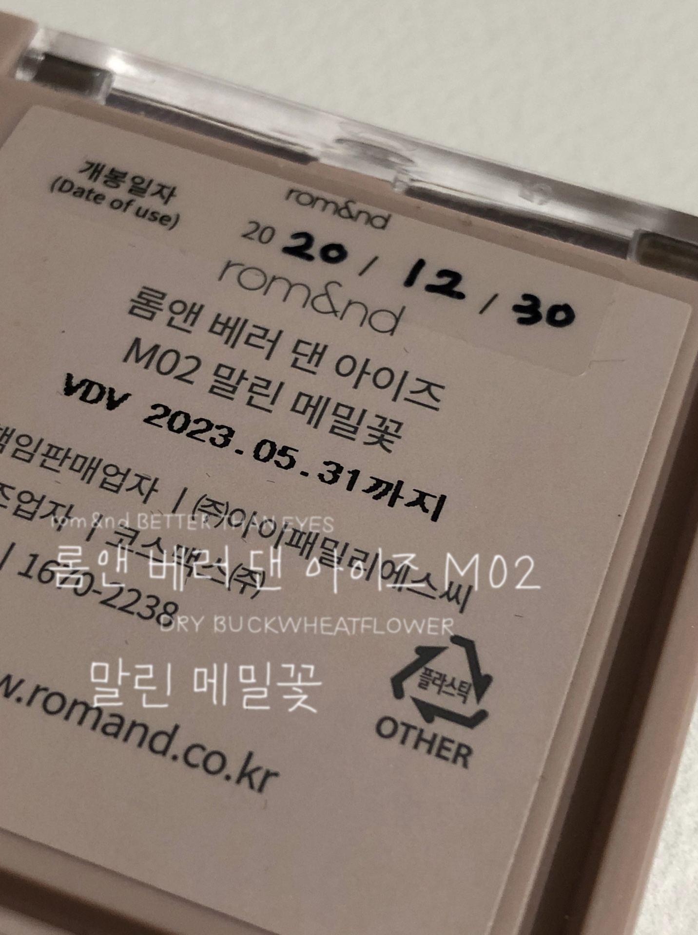 롬앤 제품은 전부 유통기한 스티커가 있어요. 개봉일자랑 비어있는 칸이 적힌 스티커를 원하는 곳에 찾아 붙일 수 있어요.