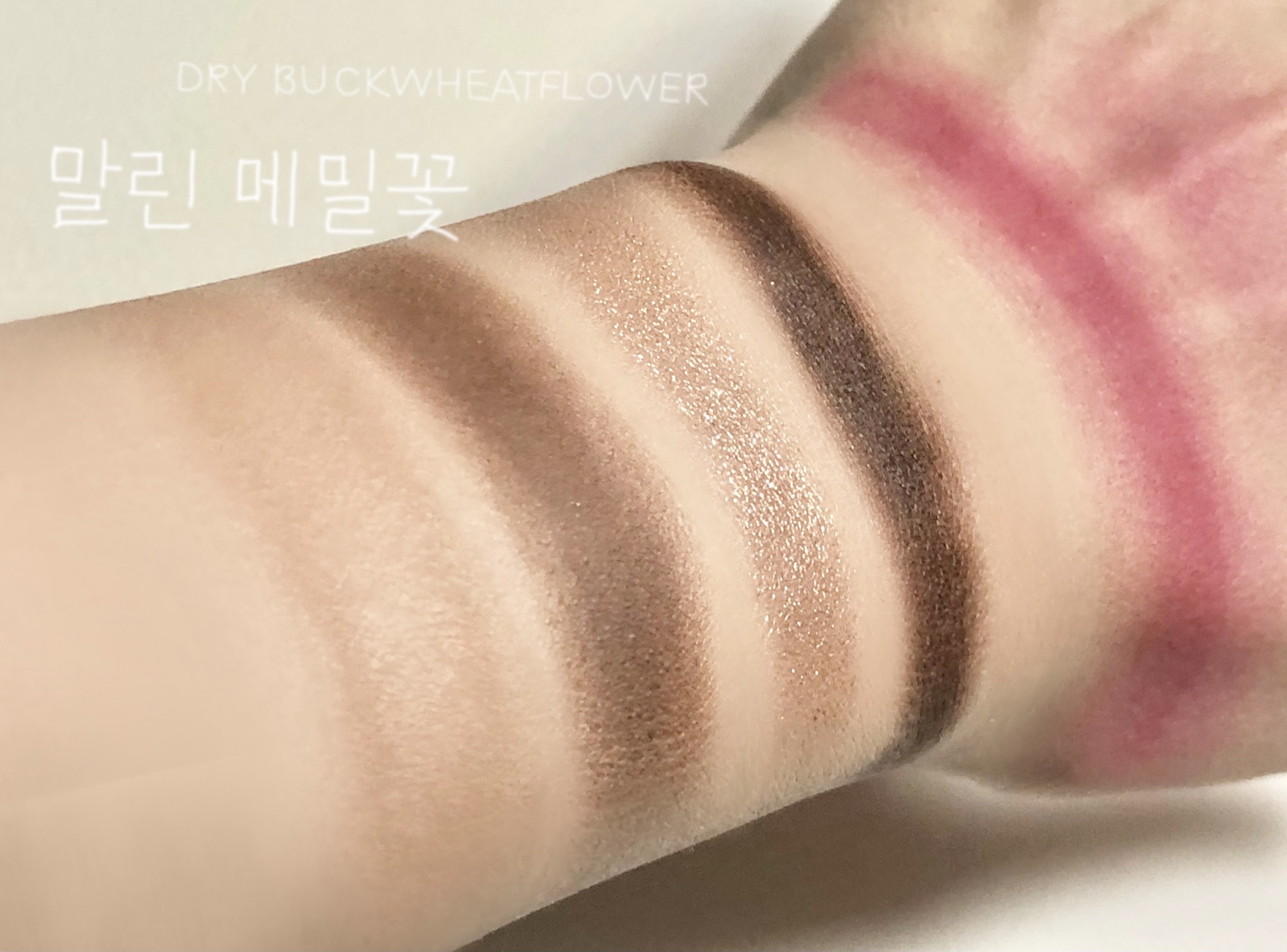 원래라면 쿨톤에 맞는 밝은 색상의 펄을 넣는 것이 기본인데 말린 메밀꽃에 하나 있는 펄은 쿨하지 않은 레몬옐로 위주에 핑크 색상의 펄입니다.