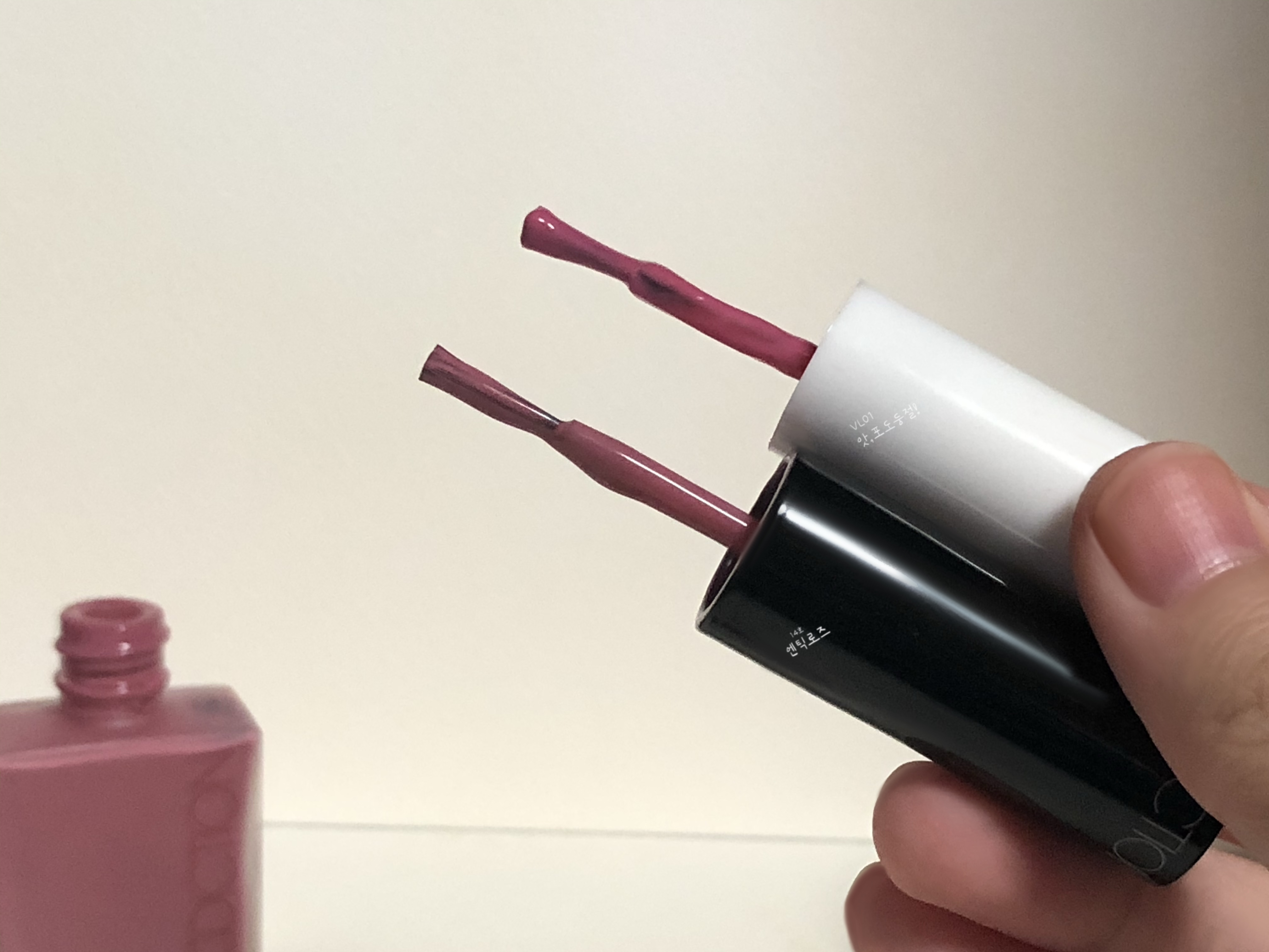 내장 브러시가 달려있어 따로 어플리케이터를 준비할 필요가 없어요. 길죽하고 모량이 적은, 모에 힘이 없이 탄성 없는 인조모가 달려있습니다.
