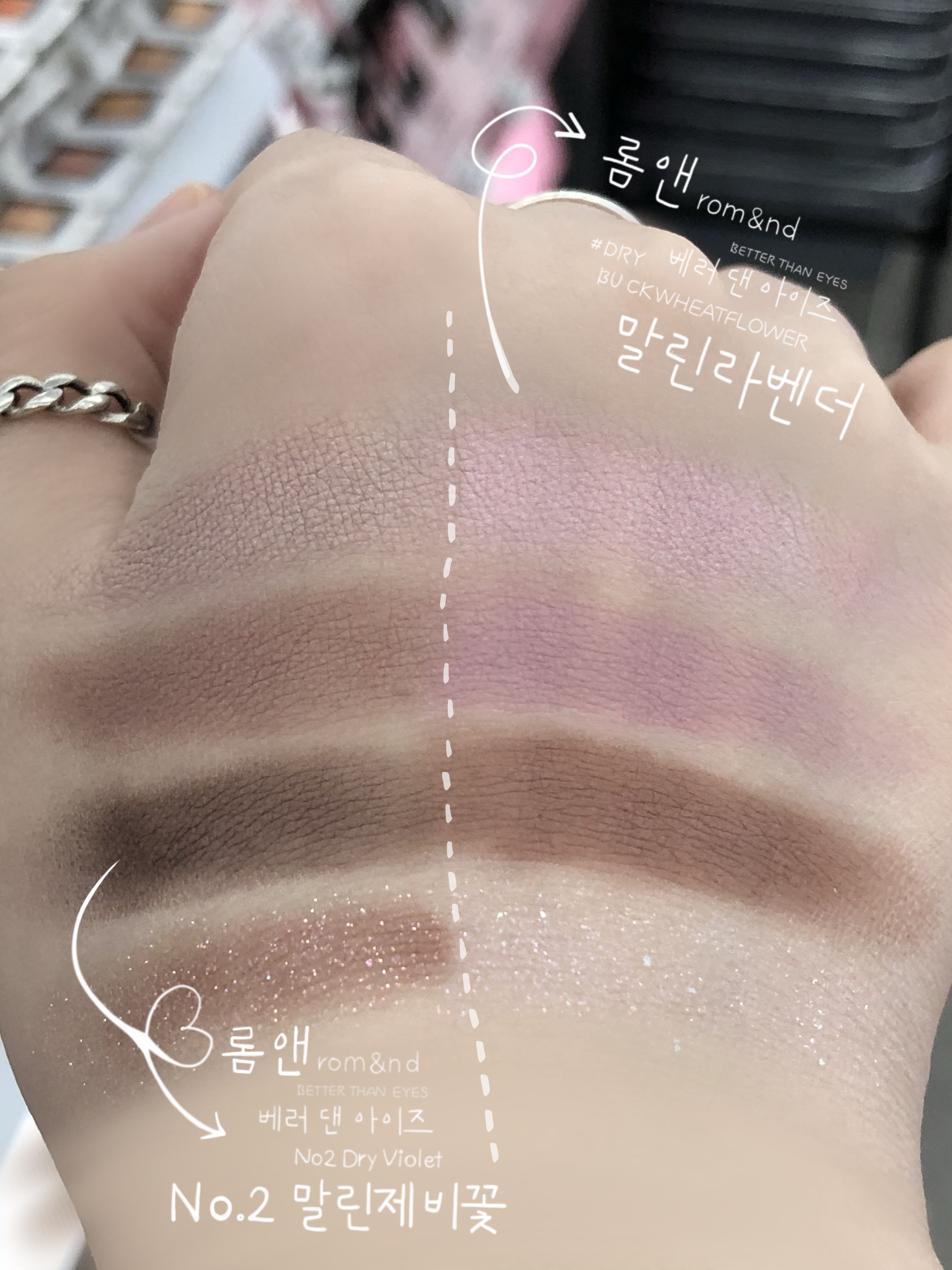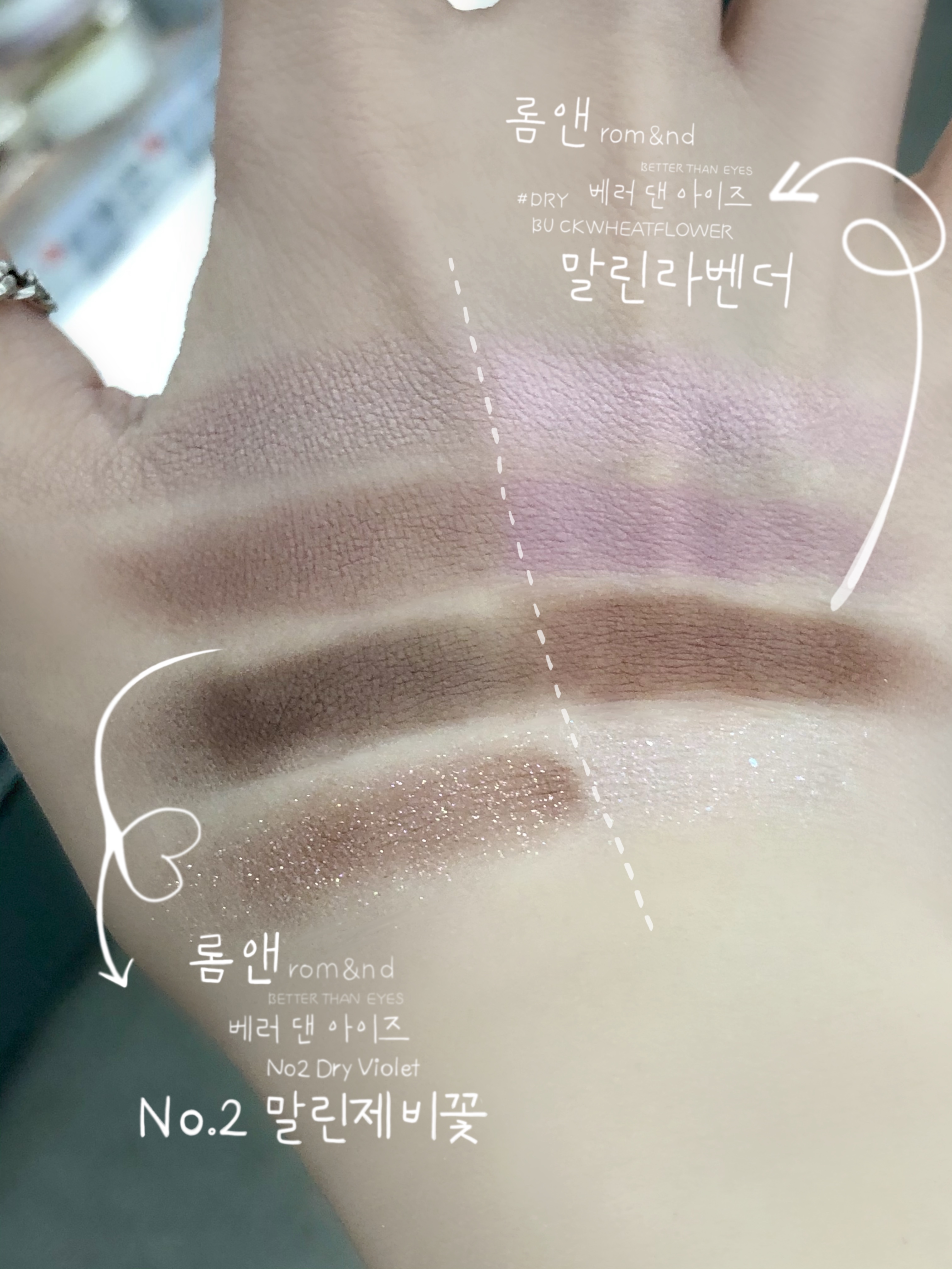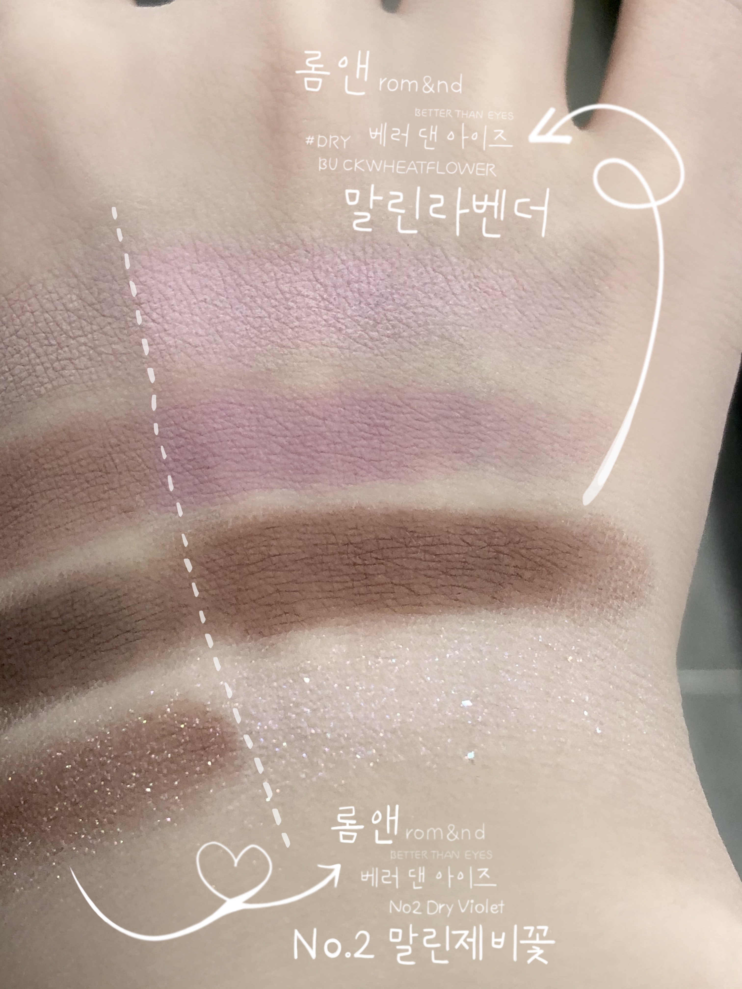 특히 손등 하나 위에 말린 라벤더와 같이 쿨톤이 쓰기 좋은 아이 팔레트♥ 롬앤 베러 댄 아이즈 한복 시리즈 No. 02 말린 제비꽃(#No.02 Dry Violet)의 발색도 나란히 있으니 참고해주세요.
