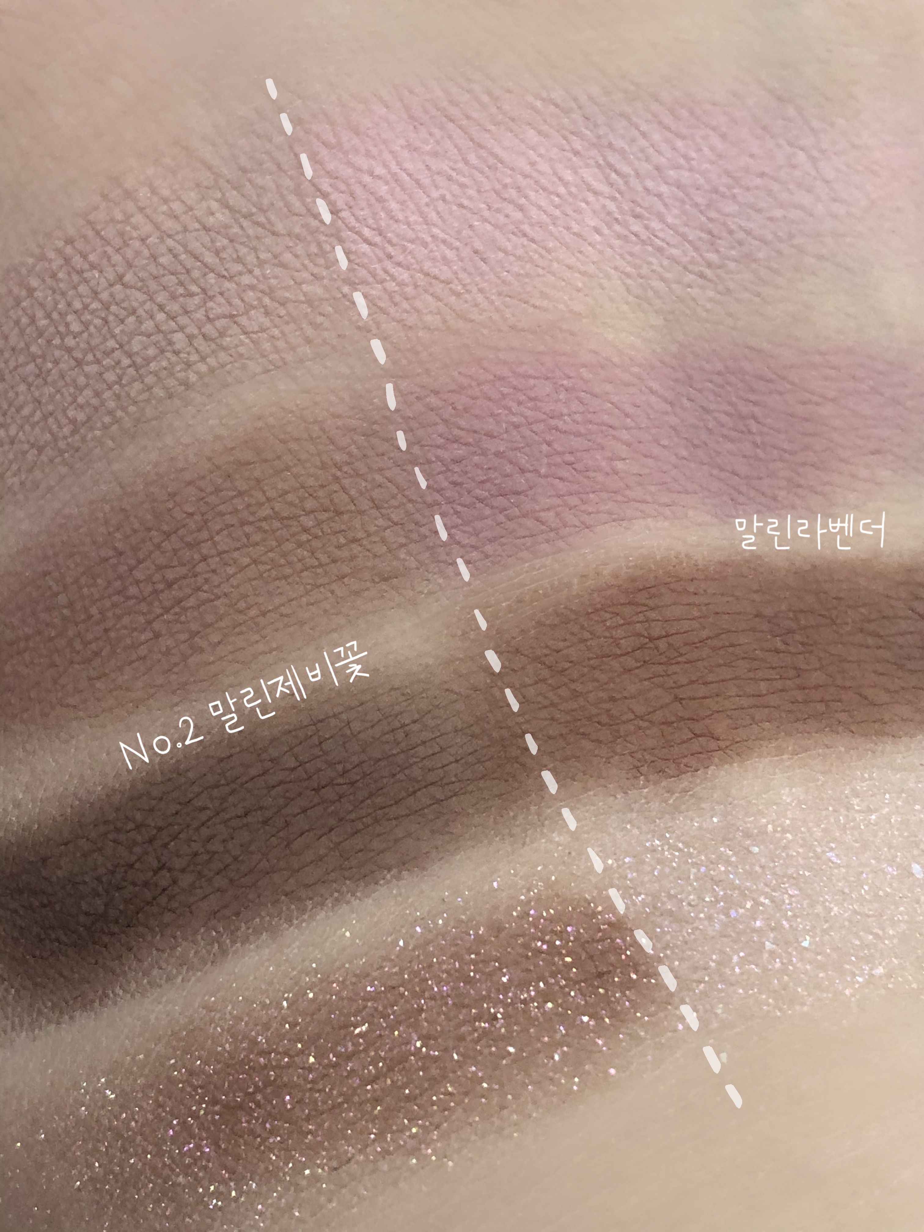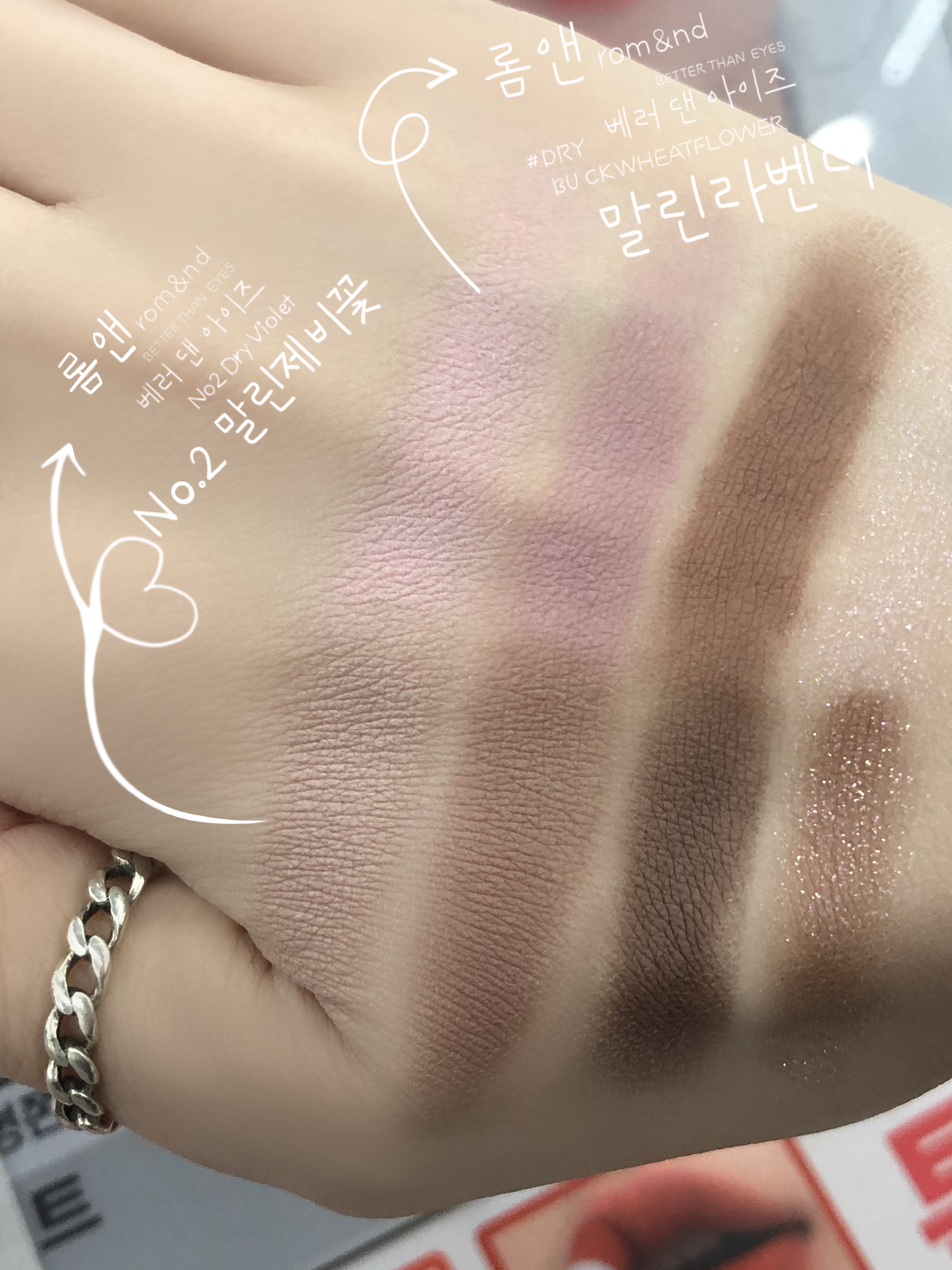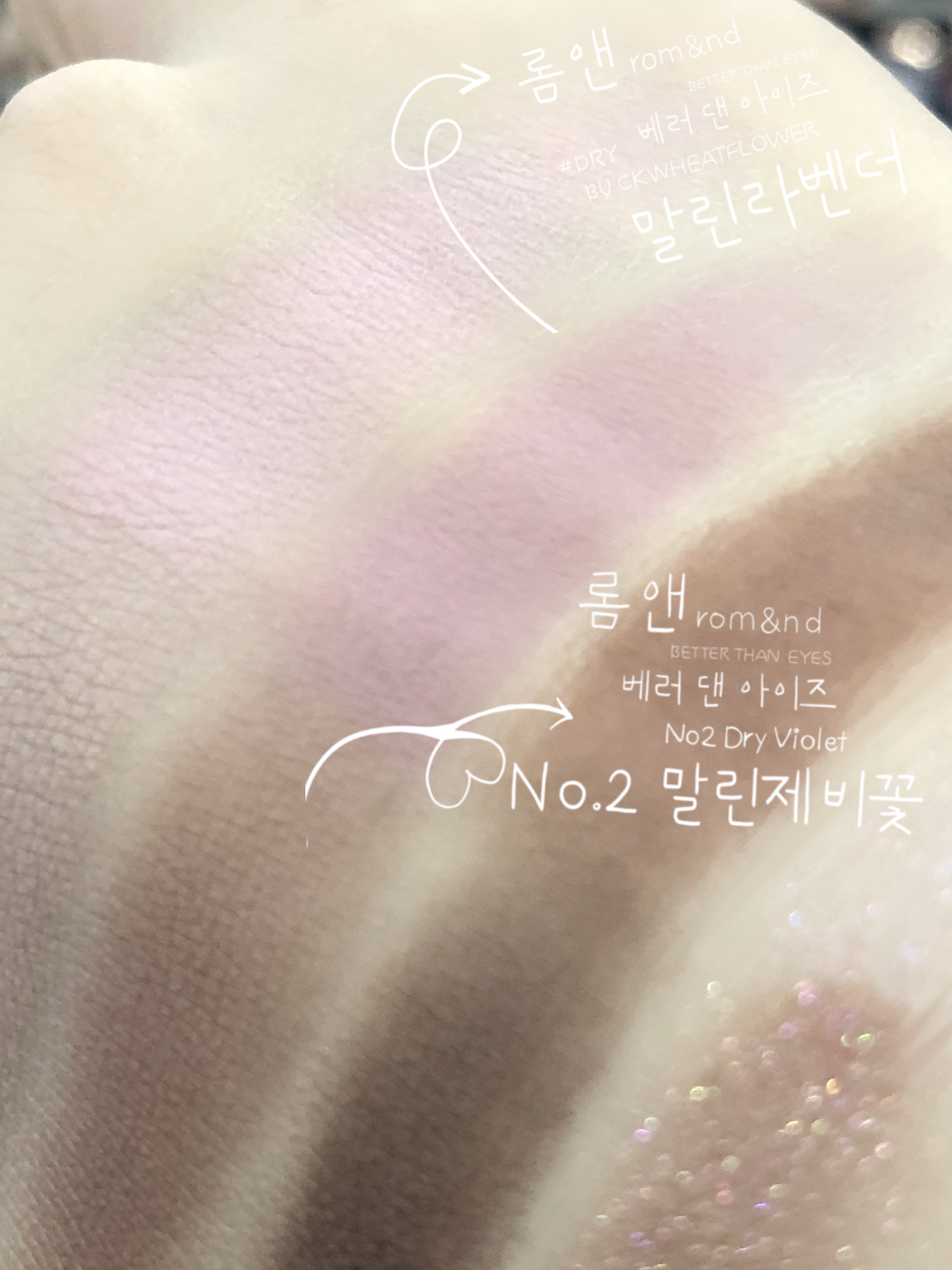 특히 손등 하나 위에 말린 라벤더와 같이 쿨톤이 쓰기 좋은 아이 팔레트♥ 롬앤 베러 댄 아이즈 한복 시리즈 No. 02 말린 제비꽃(#No.02 Dry Violet)의 발색도 나란히 있으니 참고해주세요.