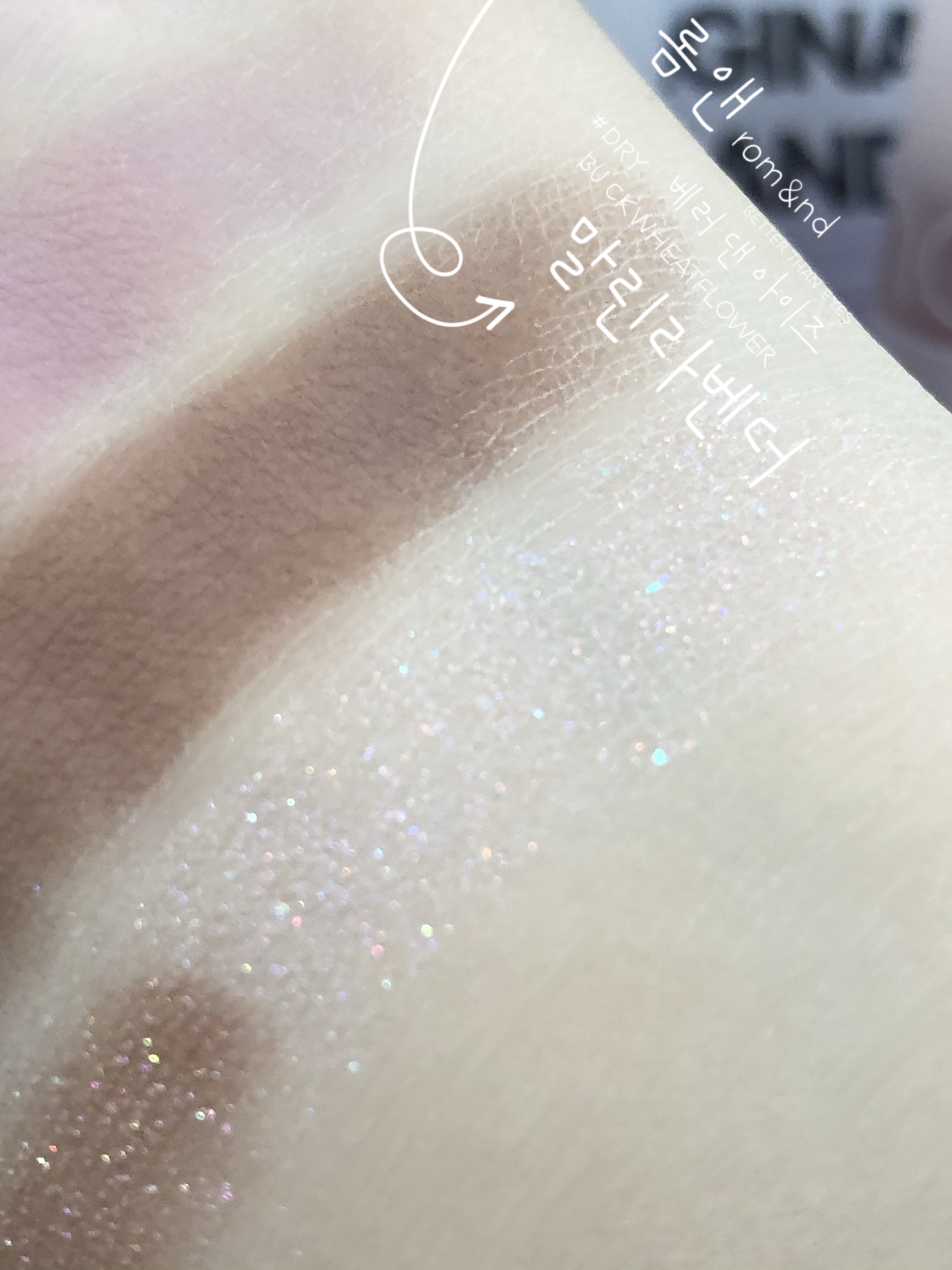 손등에 한 발색과 아이홀 위에서 한 발색은 원래 차이가 많이 나기 마련이지만 오른쪽 사진 속 손등 발색은 아이홀 위한 하는 발색과 거의 차이가 없이 비슷합니다.