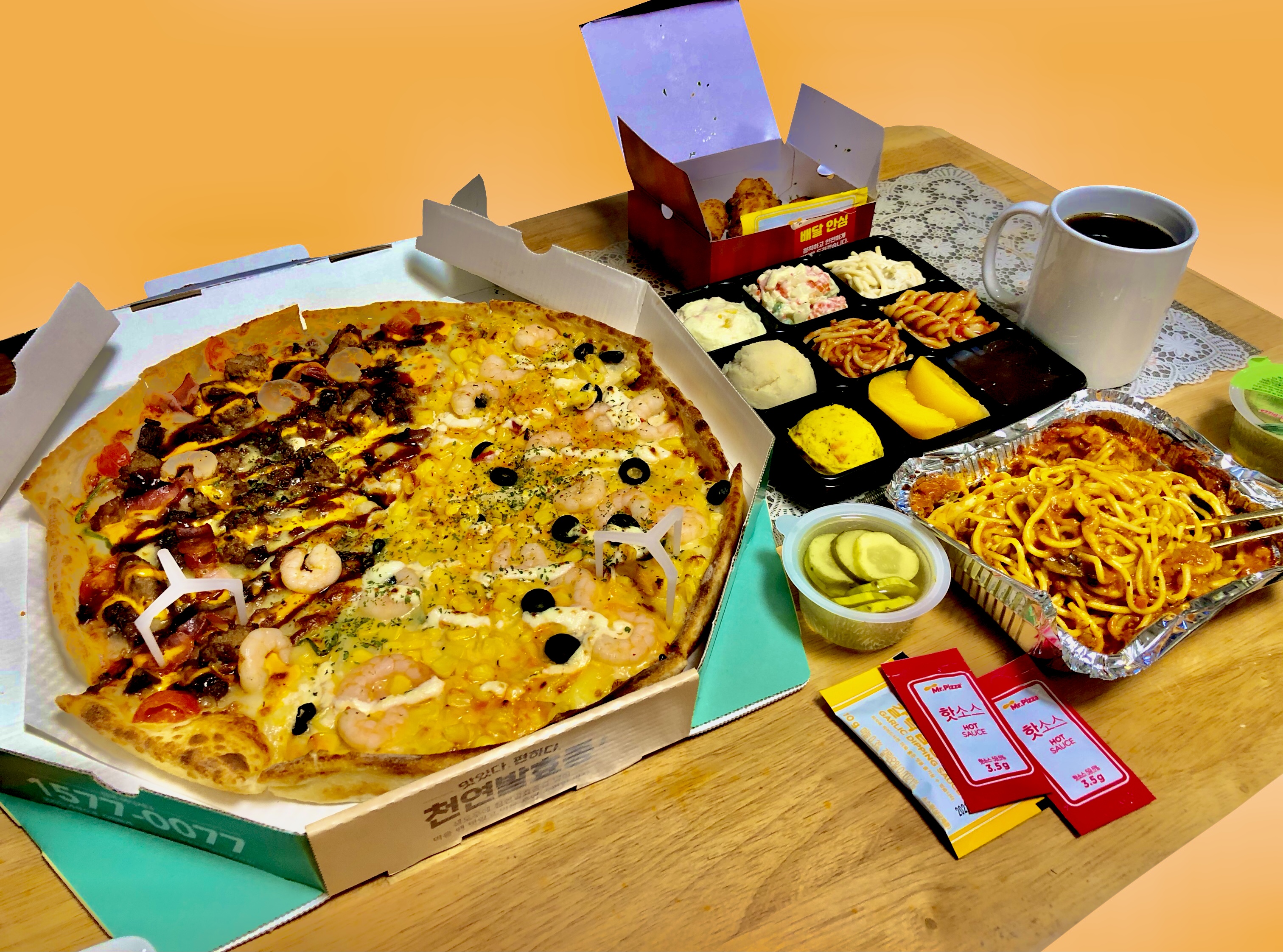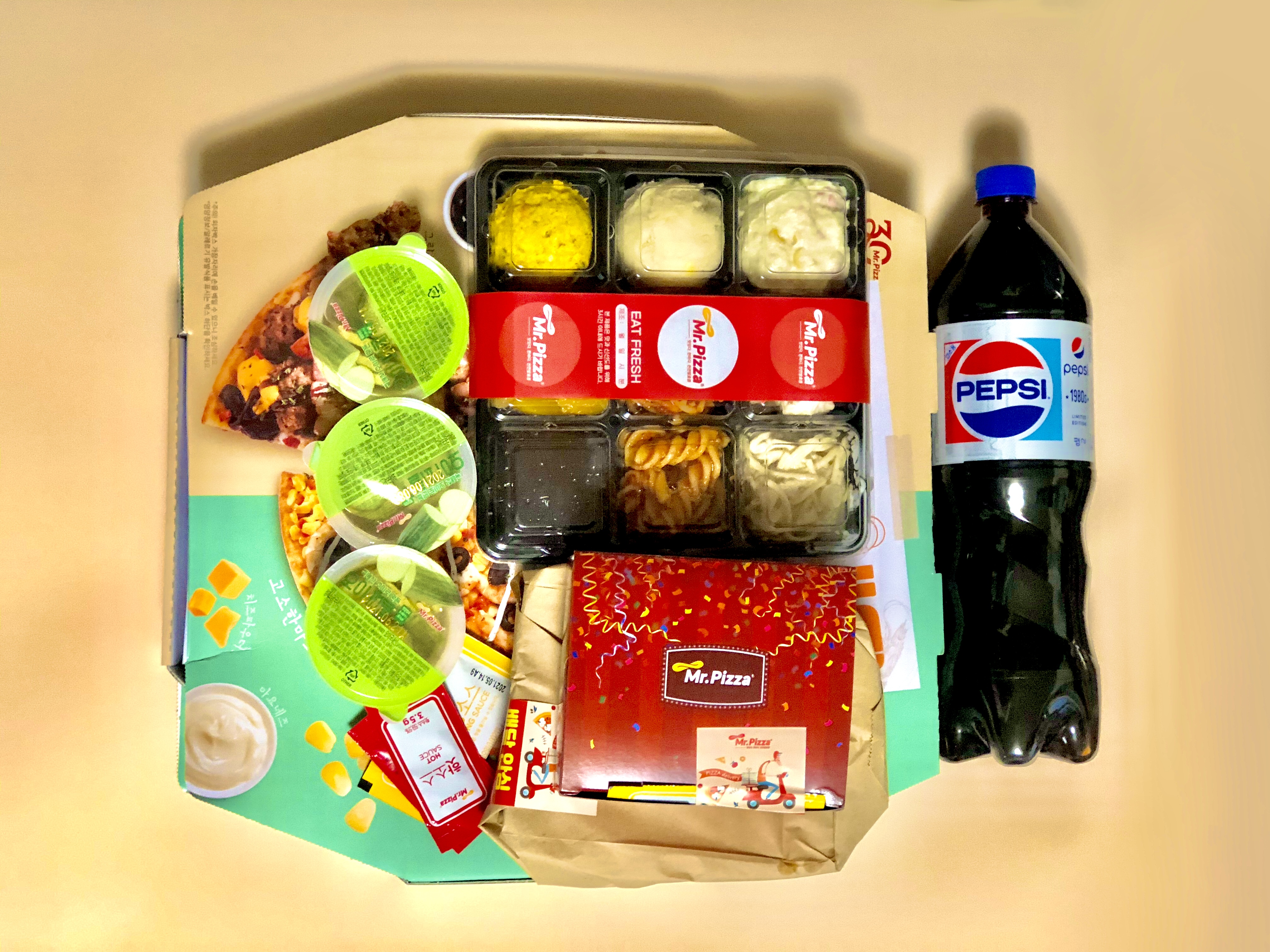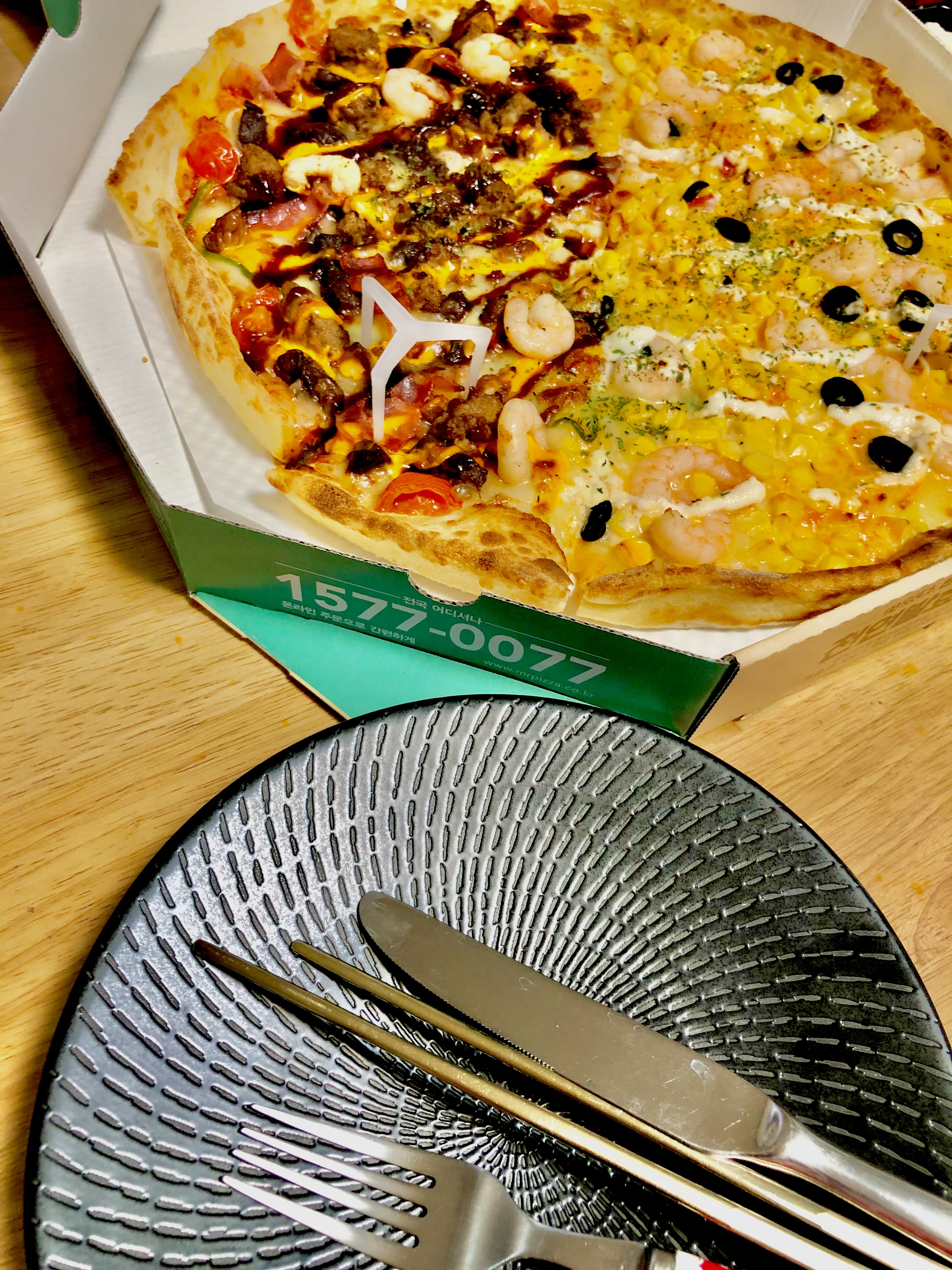오랜만에 시키는 미스터 피자에서는 풍미가 뚝뚝 흘러 씹는 맛이 살아있는 육즙 피프와 프레시한 바다의 슬림한 맛 씨푸드 쉬림프의 맛있는 반반 세트를 시켜보았어요!!