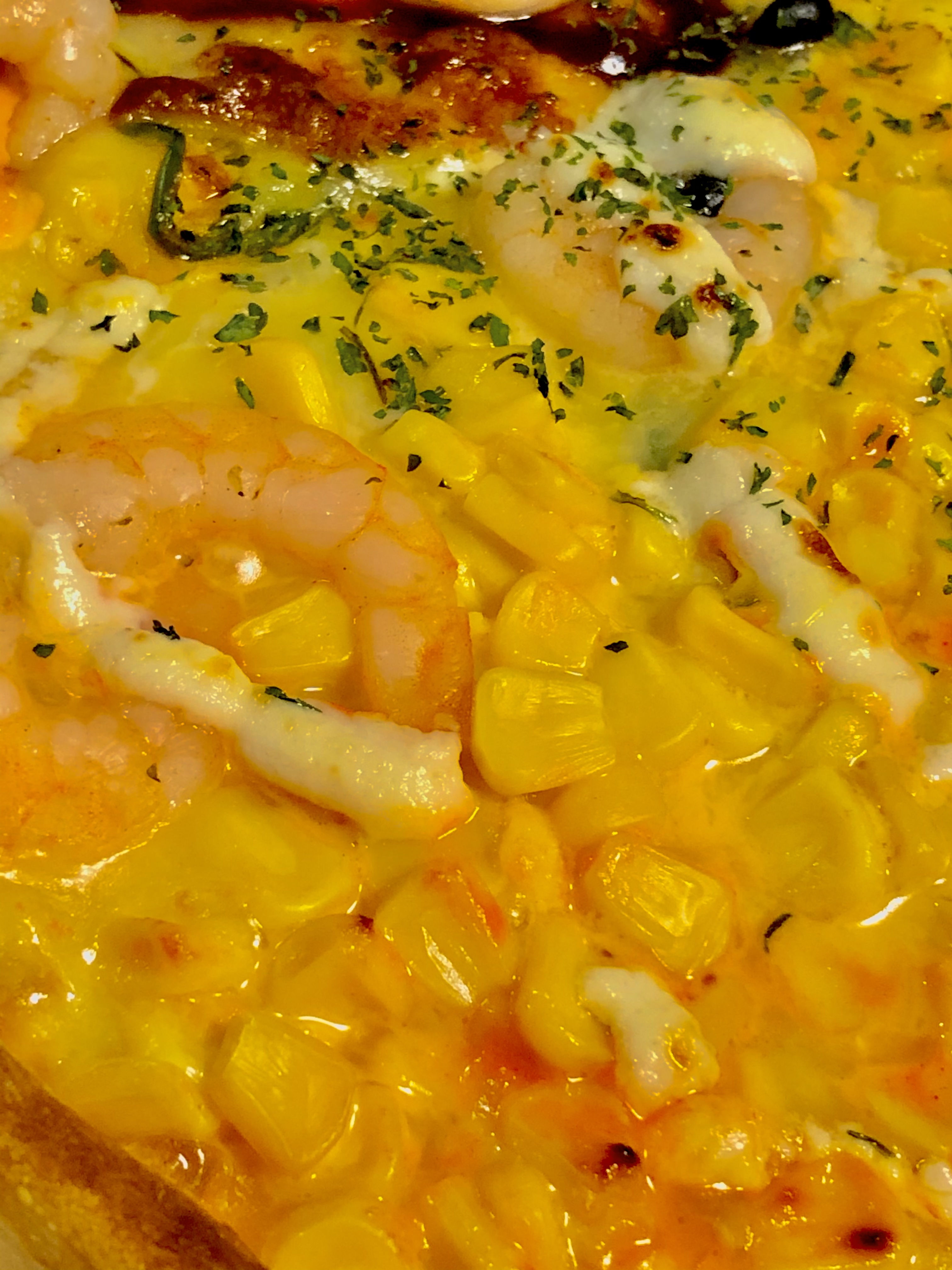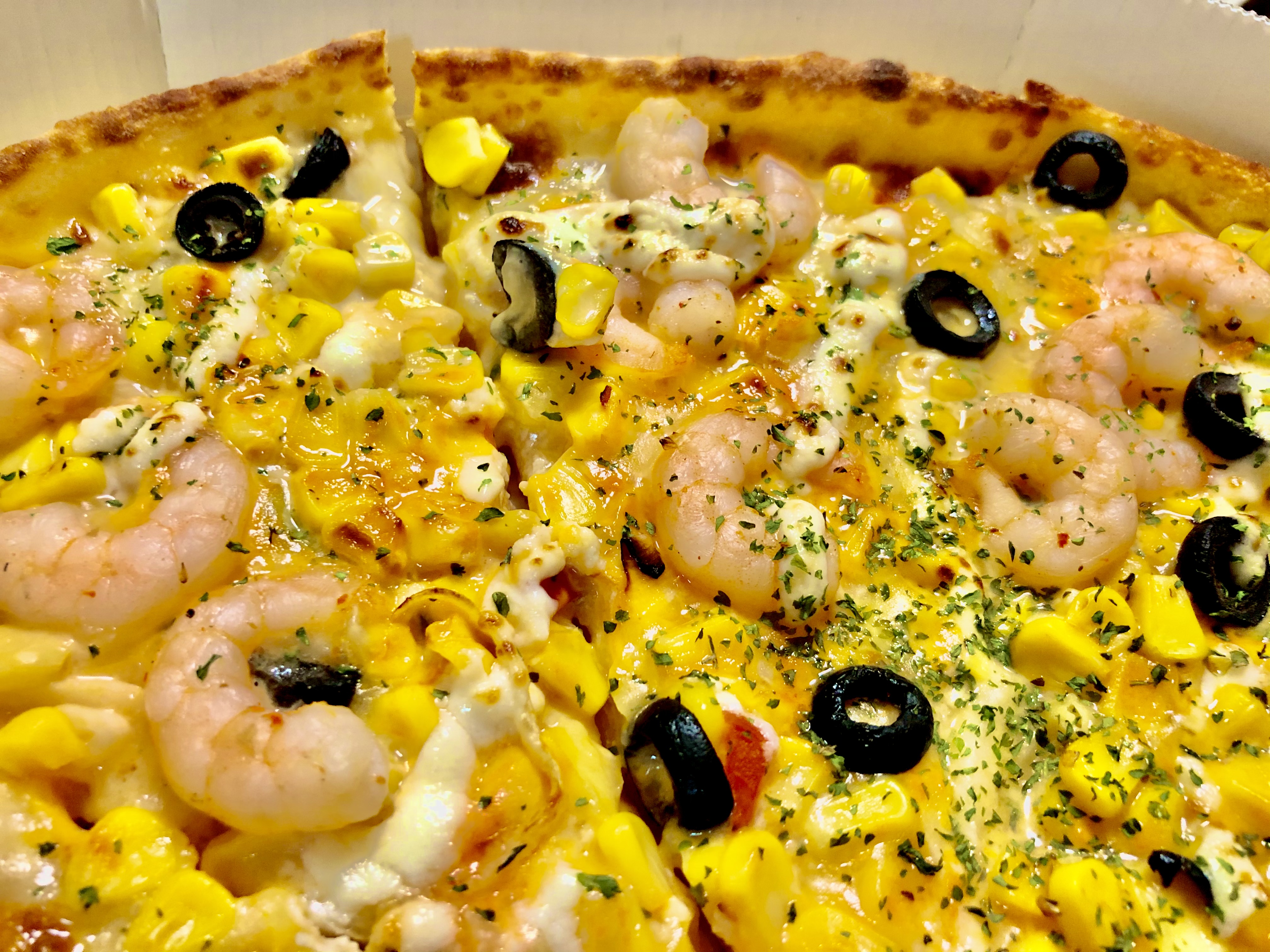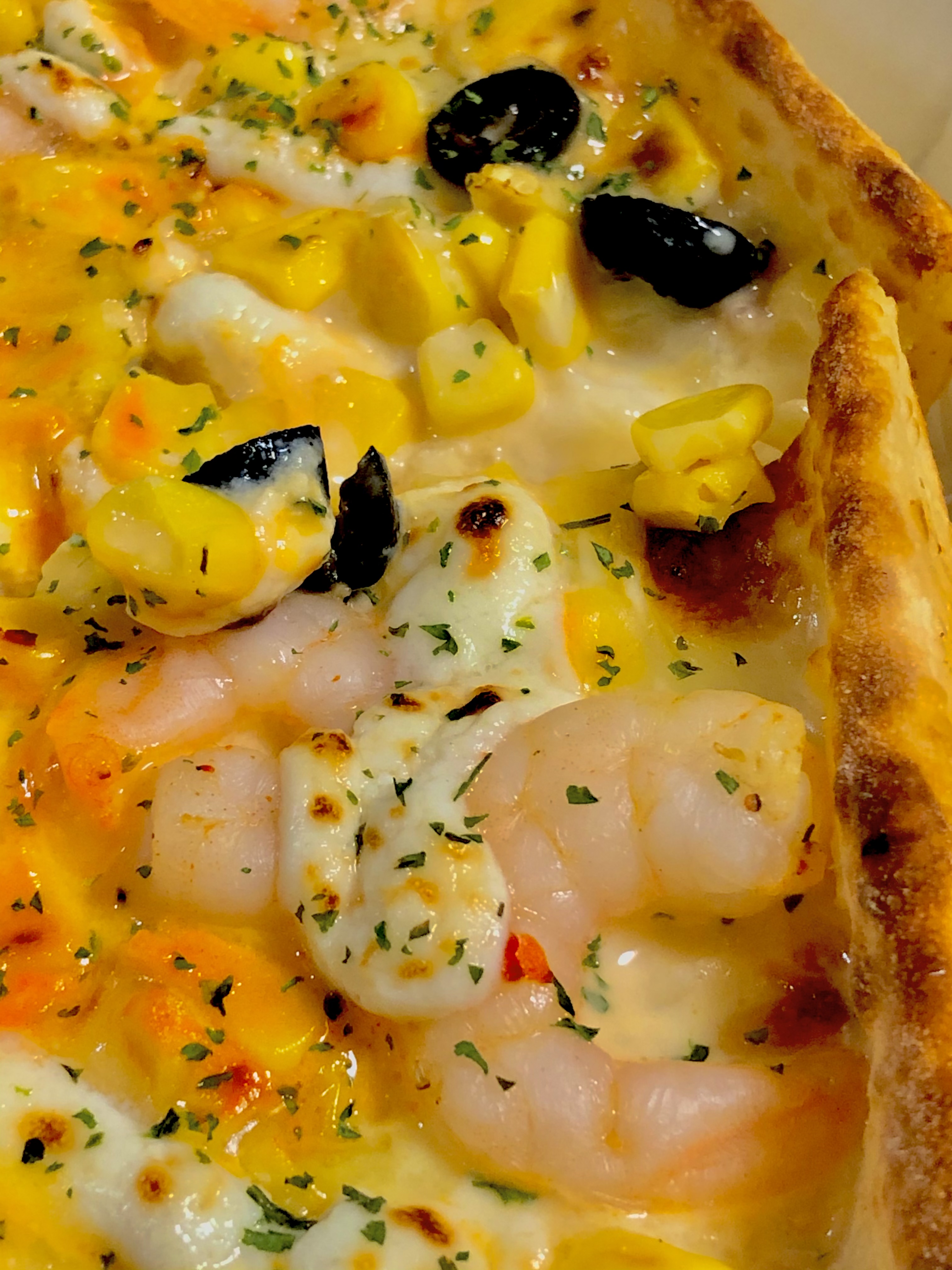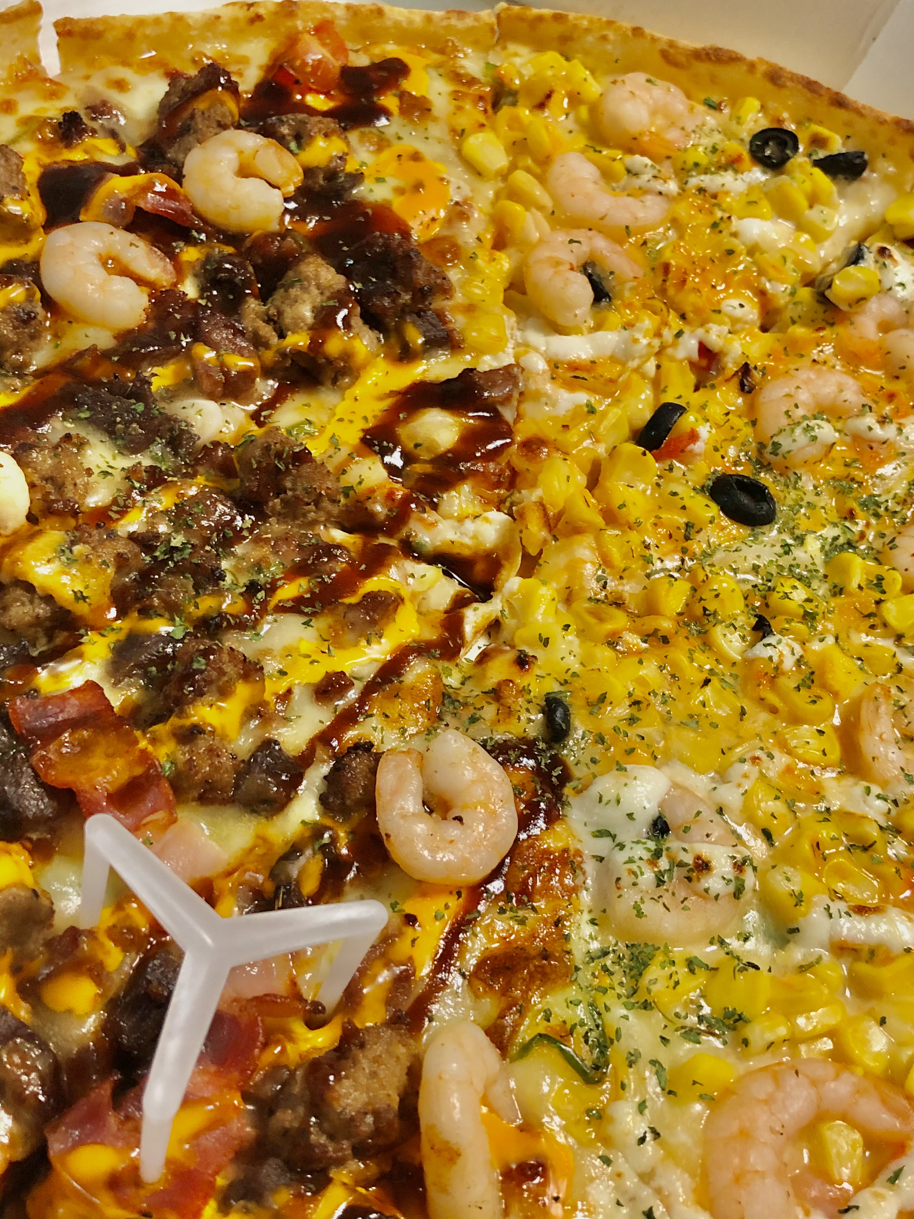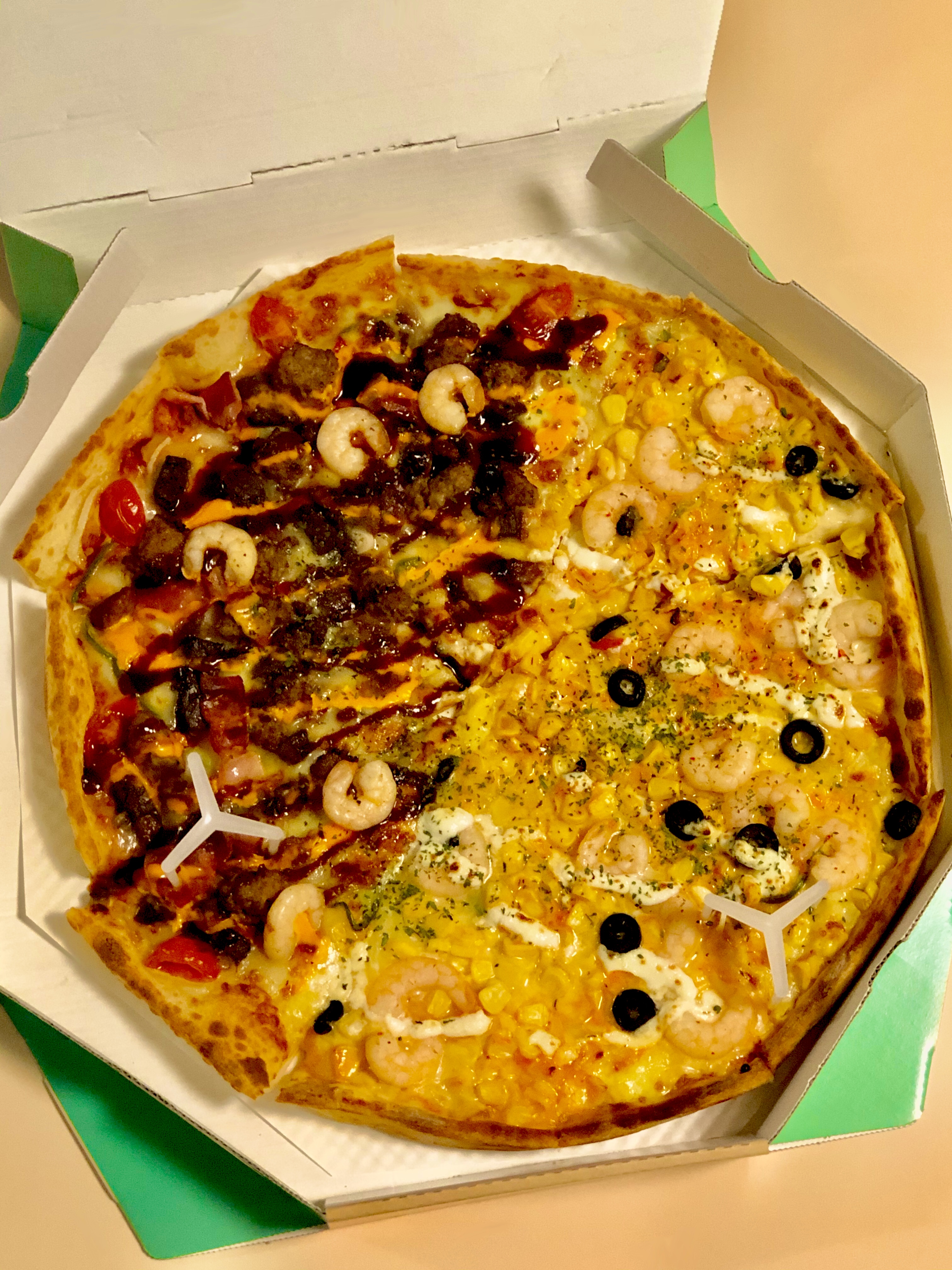 다이어터들이 선택할 새우와 다이어트를 방해하는 옥수수를 주재료로 만든 피자와 햄버거 패티를 주재료로 만든 피자의 반반 조화는 전혀 입맛이 다른 사람끼리도 함께 먹을 수 있는 하프 앤 하프 피자입니다.