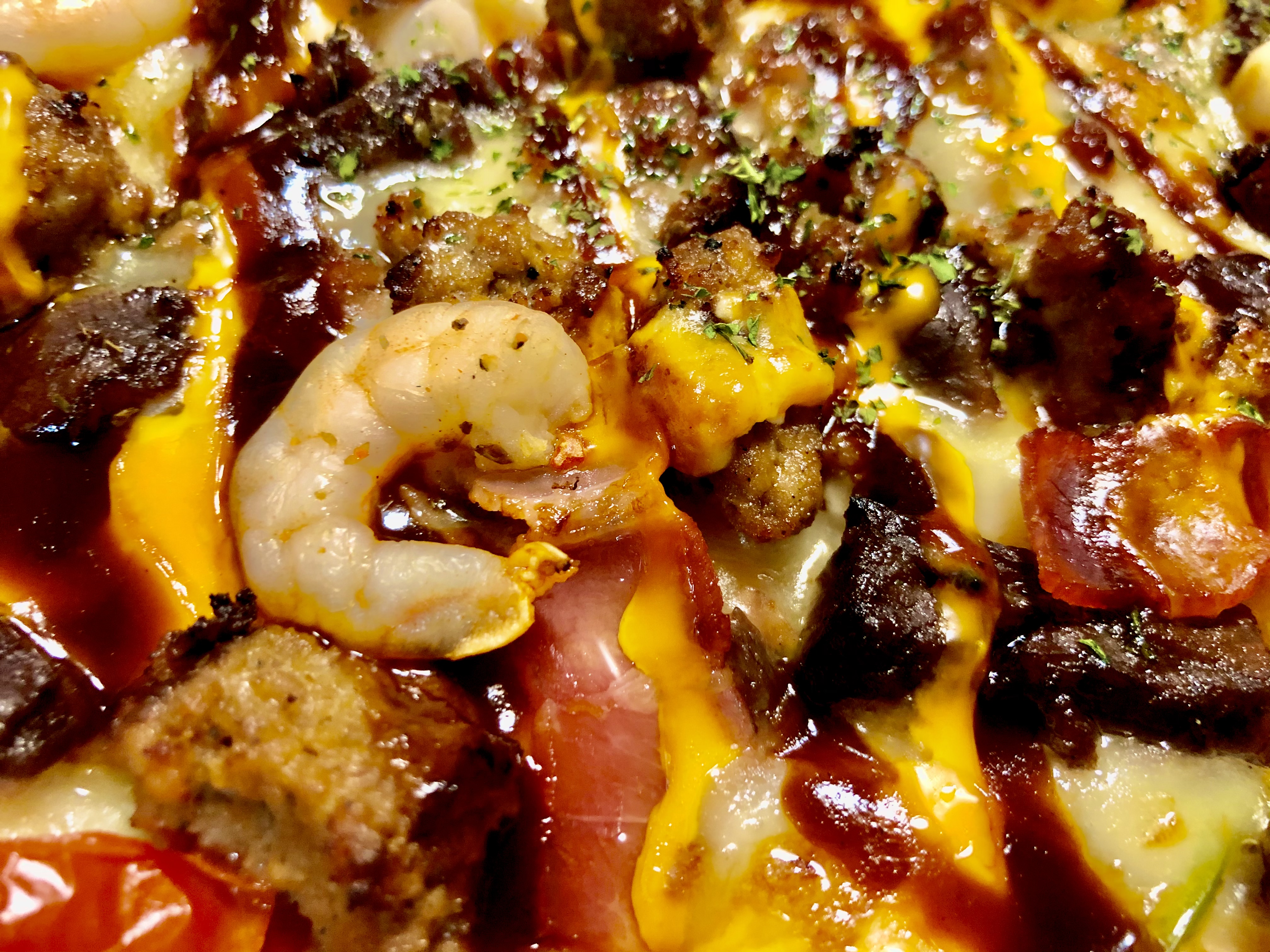 호주청정우 레드와인 스테이크, 그릴 비프, 케이준 쉬림프, 스위트 리코타 치즈, 베이컨, 미트 토핑, 스위트콘, 방울토마토, 파프리카, 히코리 BBQ 소스, 트리플 치즈 스프레드, 치즈 시즈닝, 마요네요 등