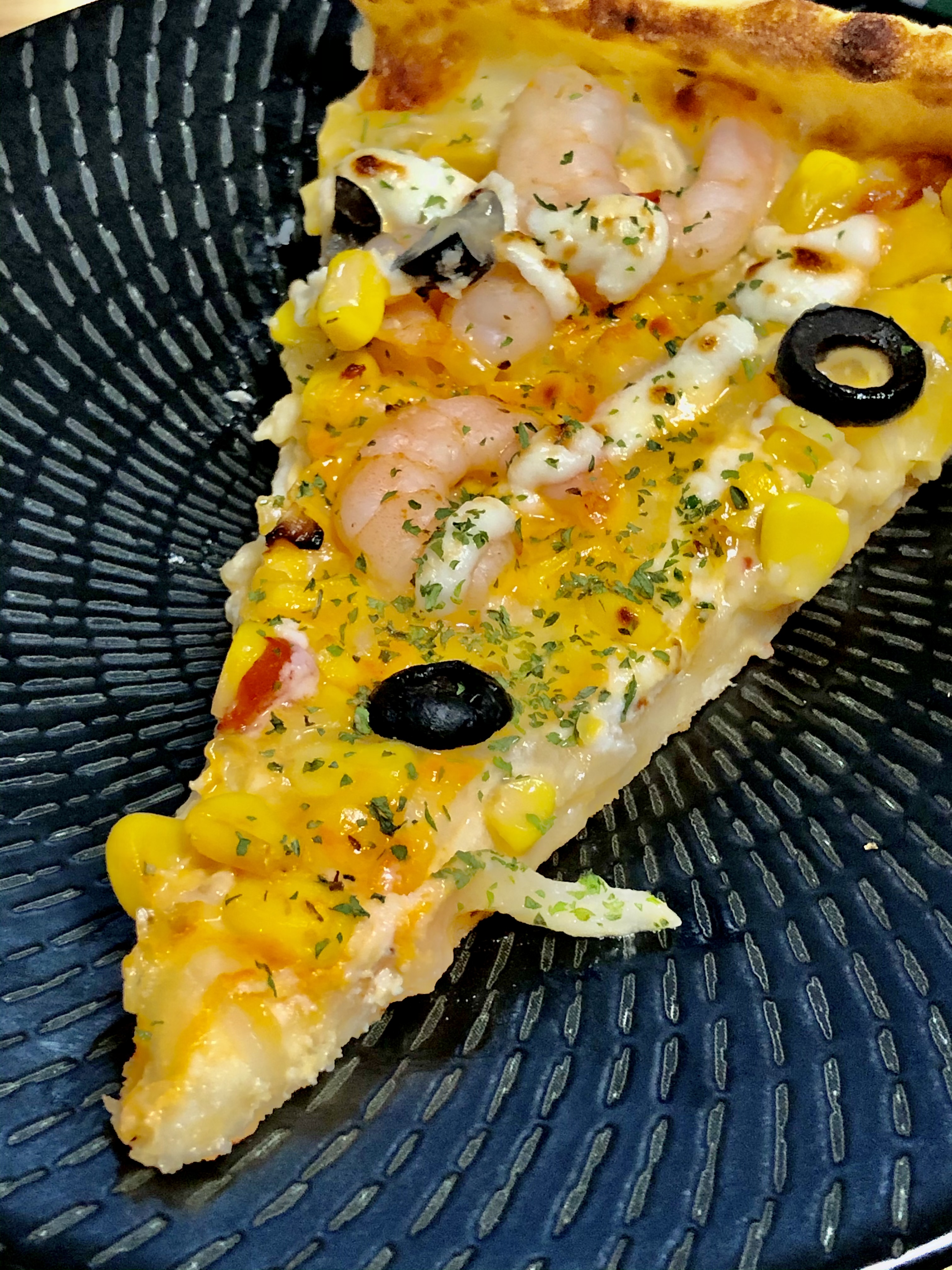 다이어터들이 선택할 새우와 다이어트를 방해하는 옥수수를 주재료로 만든 피자와 햄버거 패티를 주재료로 만든 피자의 반반 조화는 전혀 입맛이 다른 사람끼리도 함께 먹을 수 있는 하프 앤 하프 피자입니다.