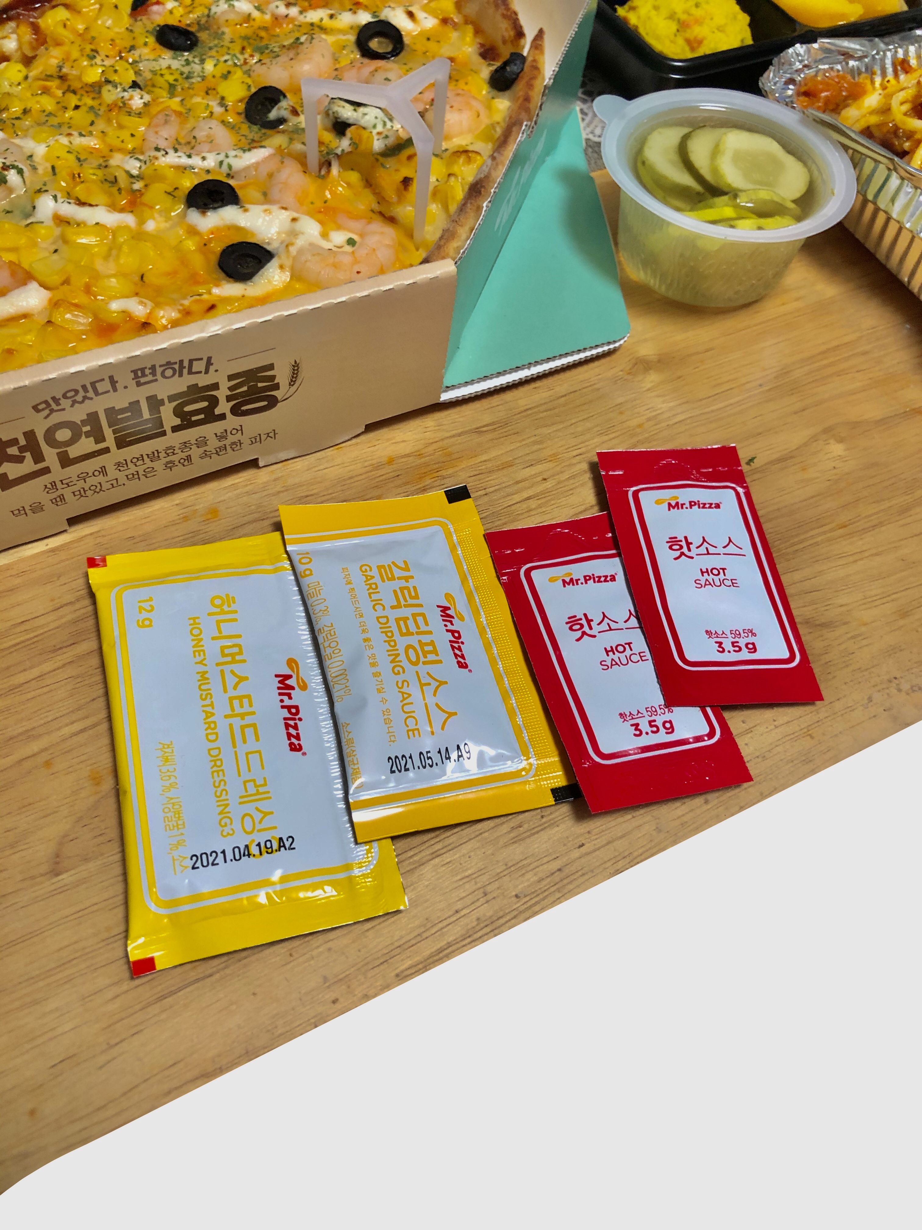 오랜만에 시키는 미스터 피자에서는 풍미가 뚝뚝 흘러 씹는 맛이 살아있는 육즙 피프와 프레시한 바다의 슬림한 맛 씨푸드 쉬림프의 맛있는 반반 세트를 시켜보았어요!!