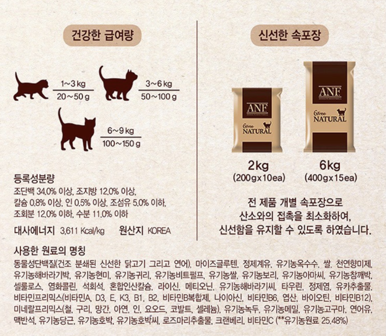 ANF 유기농 식스 프리 인도어 어덜트 고양이 사료(평점 3,585)