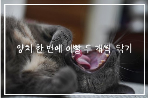 - 고양이가 한 번에 이빨 하나씩 닦기가 익숙해지면 이제 이빨을 하나씩 늘려 한 번에 이빨 두세 개로 늘려 닦습니다.