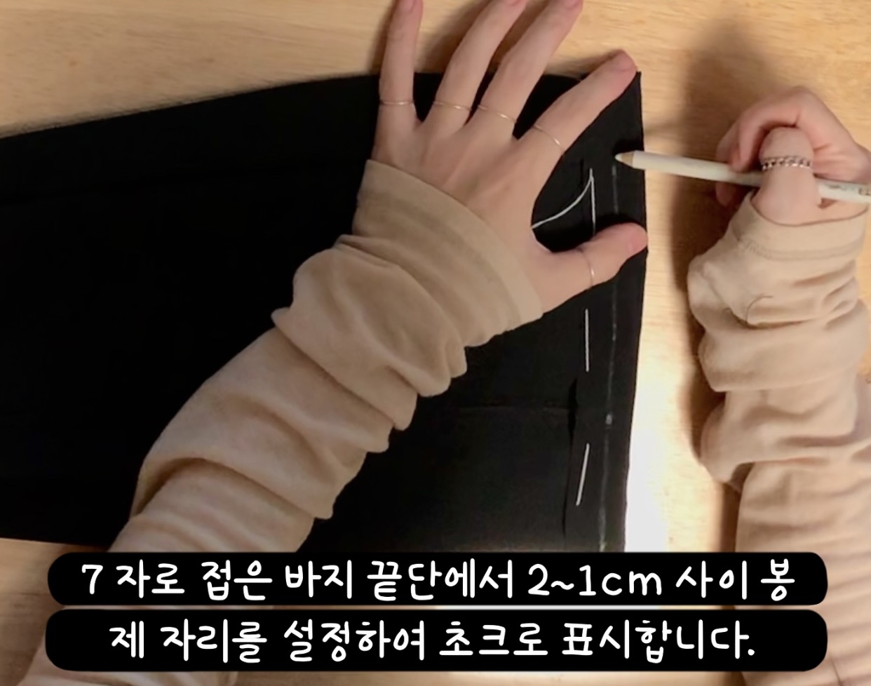 ▶자로 접은 바지 끝단에서 2~1cm 사이 봉제 자리를 설정하여 초크로 표시합니다.