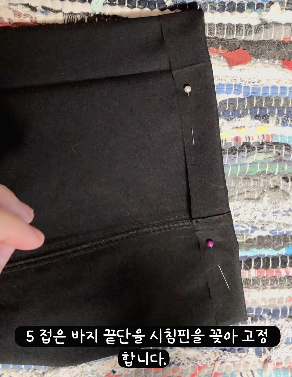 - 접은 바지 끝단을 시침핀을 꽂아 고정합니다.