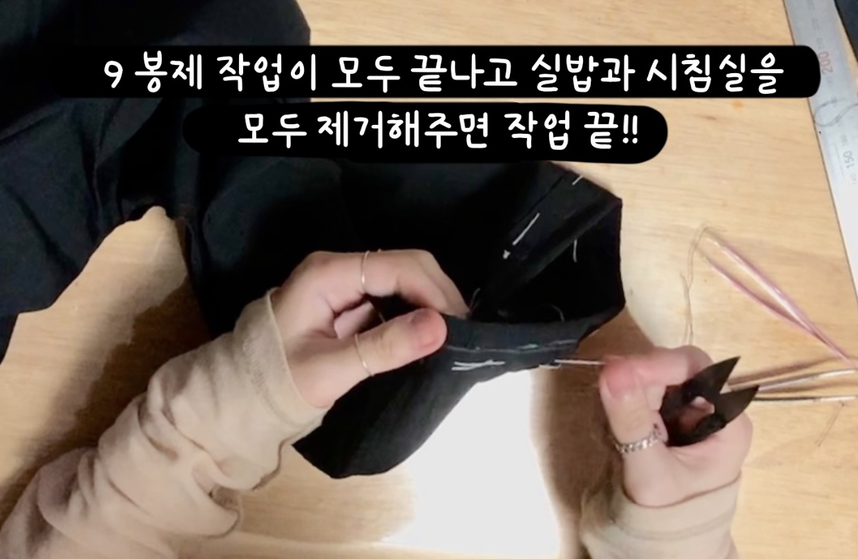 - 봉제 작업이 모두 끝나고 실밥과 시침실을 모두 제거해주면 작업 끝!!