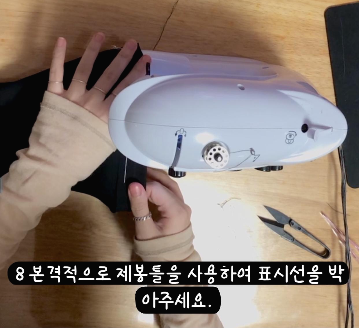- 본격적으로 제봉틀을 사용하여 표시선을 박아주세요.