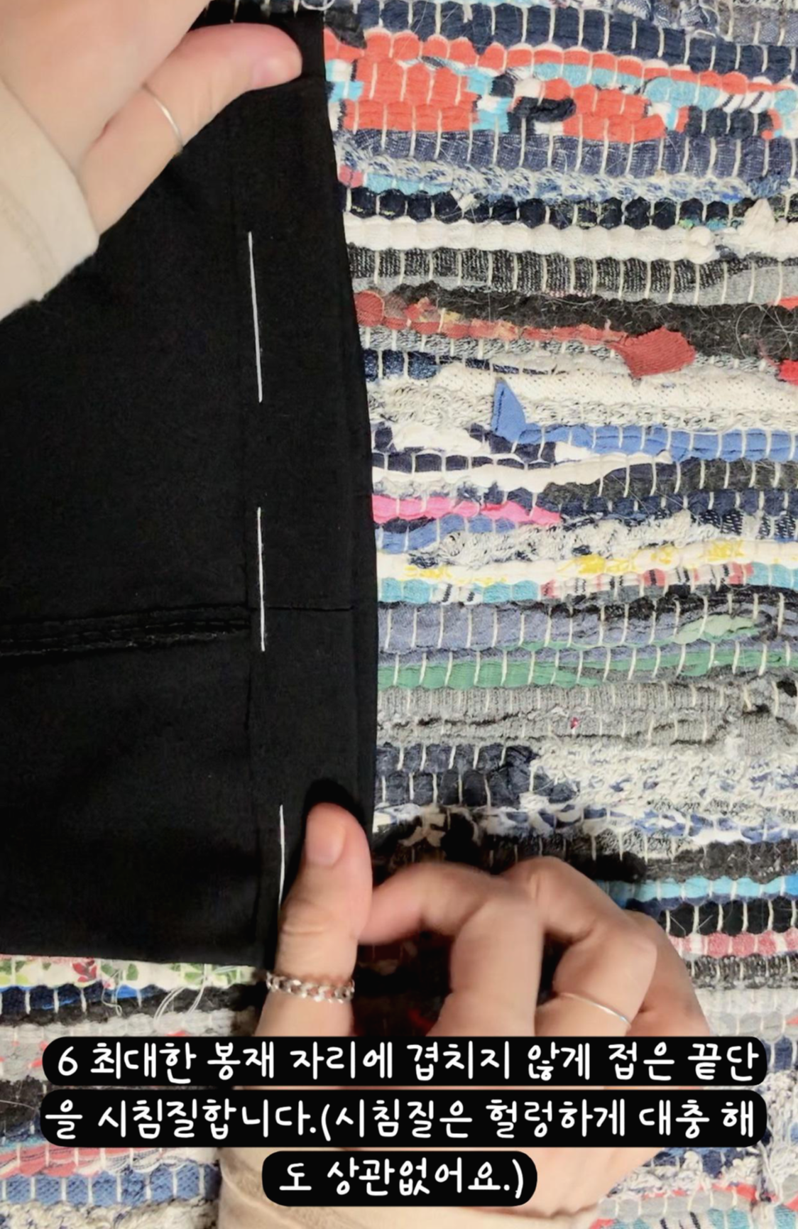 - 최대한 봉재 자리에 겹치지 않게 접은 끝단을 시침질합니다.(시침질은 헐렁하게 대충 해도 상관없어요.)