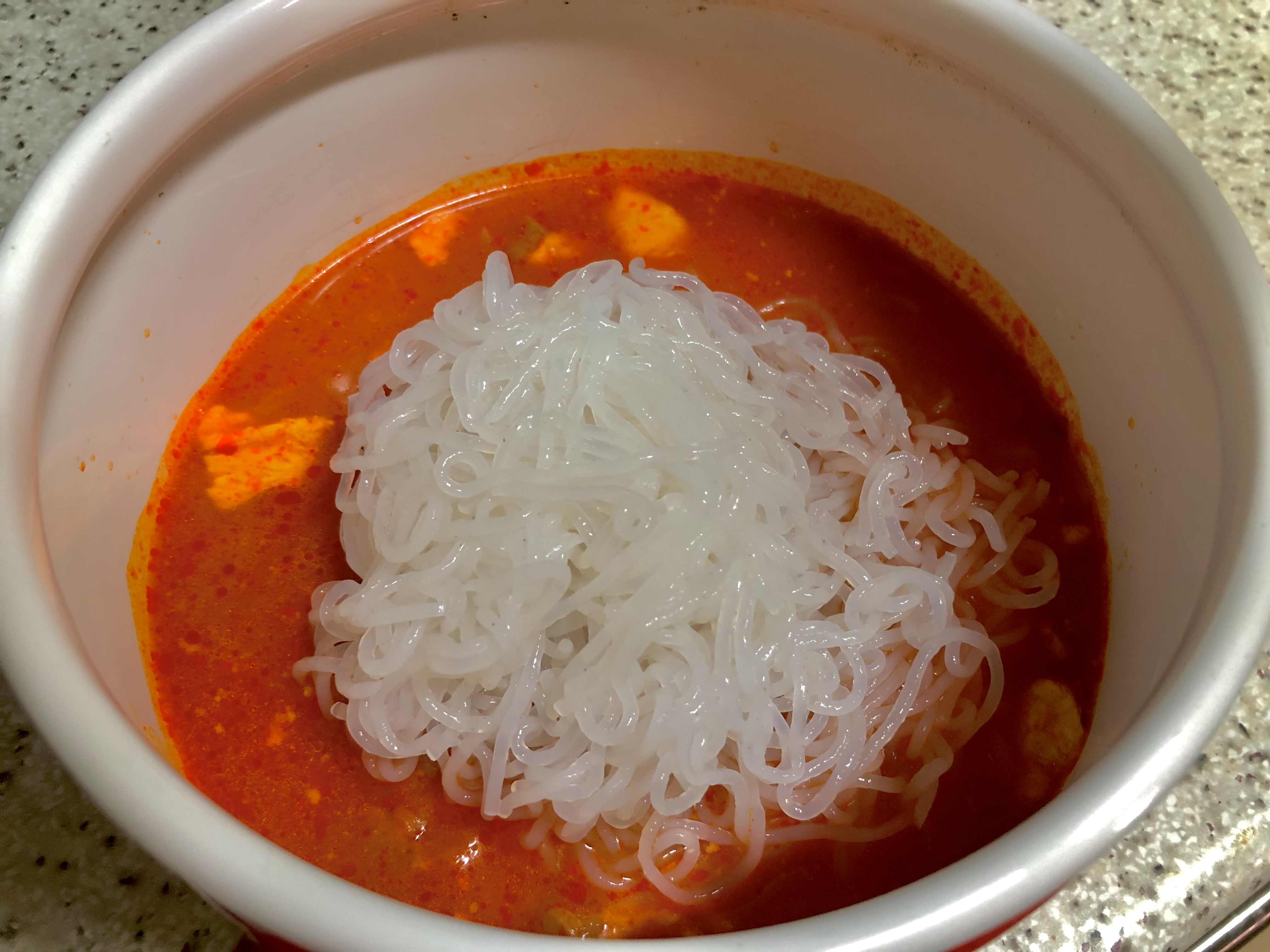 - 제품을 개봉하여 용기에 부은 후 랩을 씌워 전자레인지에 넣고 4분 동안 돌려 조리합니다.(1,000W 기준 3분)