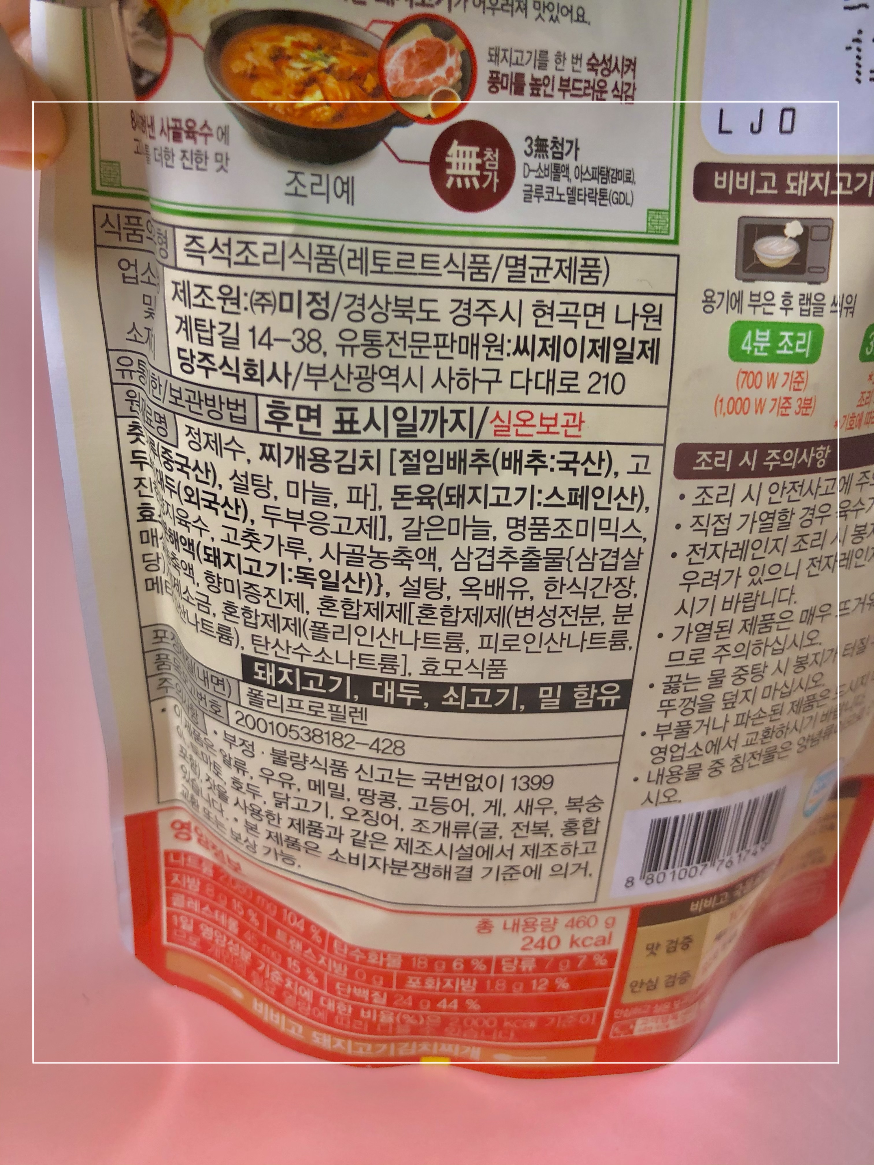 돼지고기 까지 들어간 김치찌개라면 분명 아주 높은 칼로리로 알고 있는데 비비고 돼지고기 김치찌개는 240kcal라고 하는데 왠지 믿음은 가지않아요. ㅎㅎ