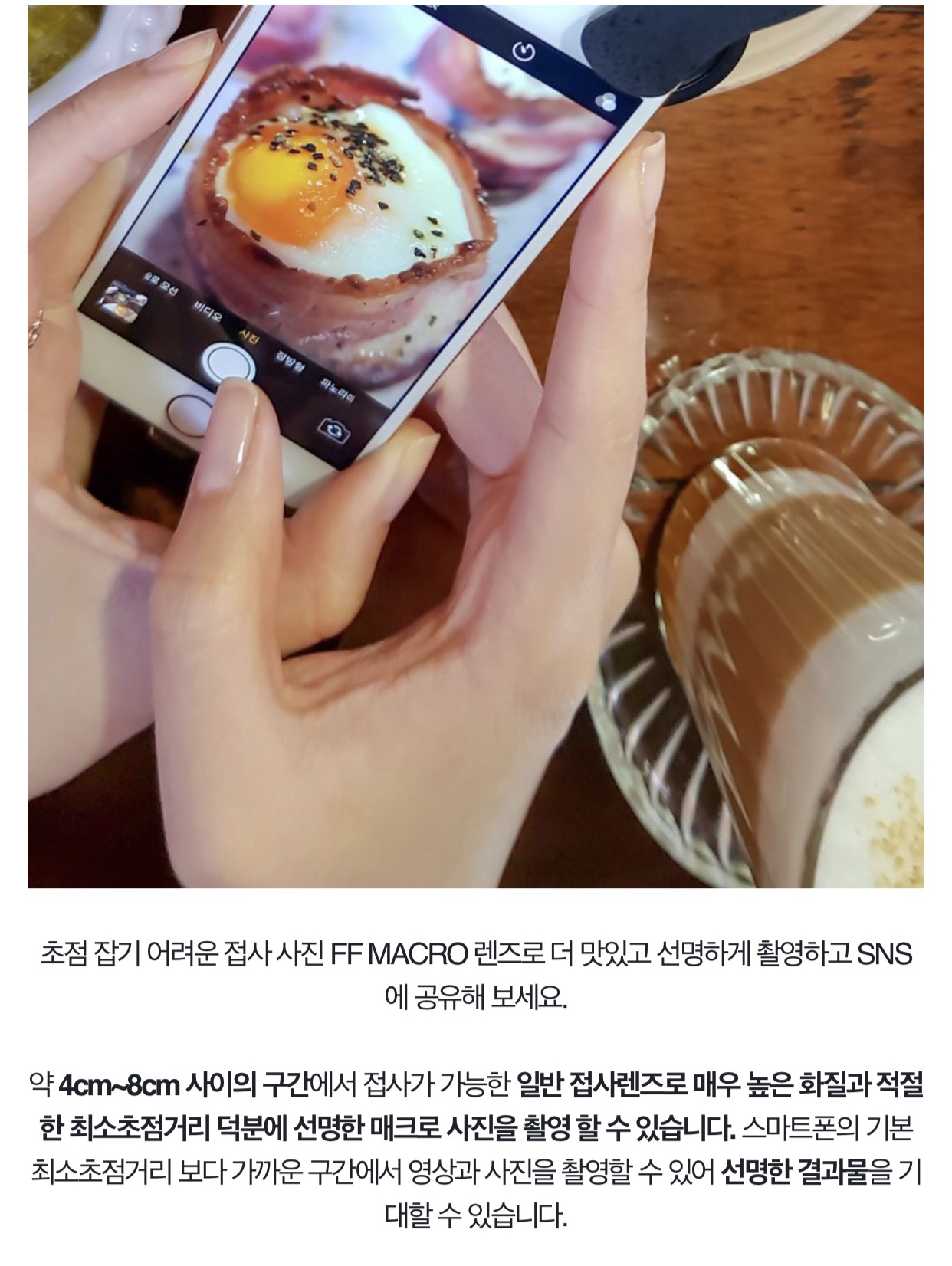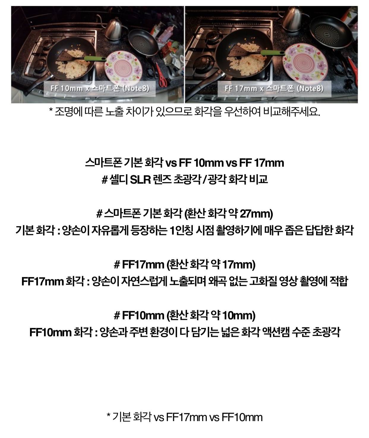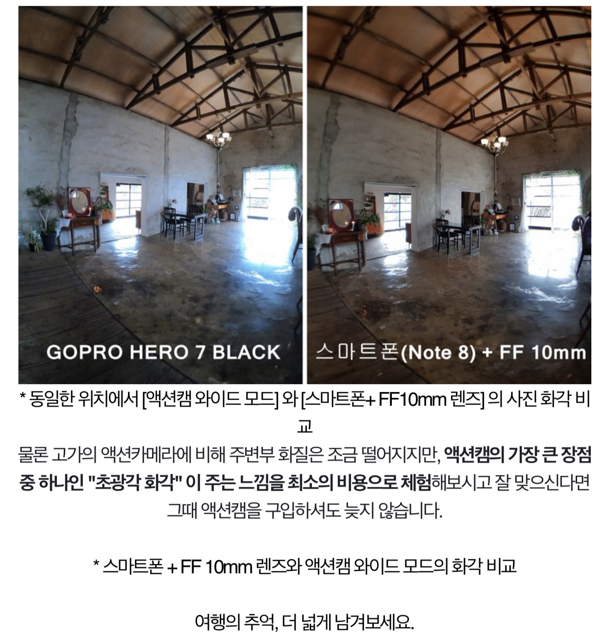 - 스마트폰 + FF 10mm 렌즈를 결합하여 촬영 시 액션캠같은 광활한 화각을 사용할 수 있습니다.