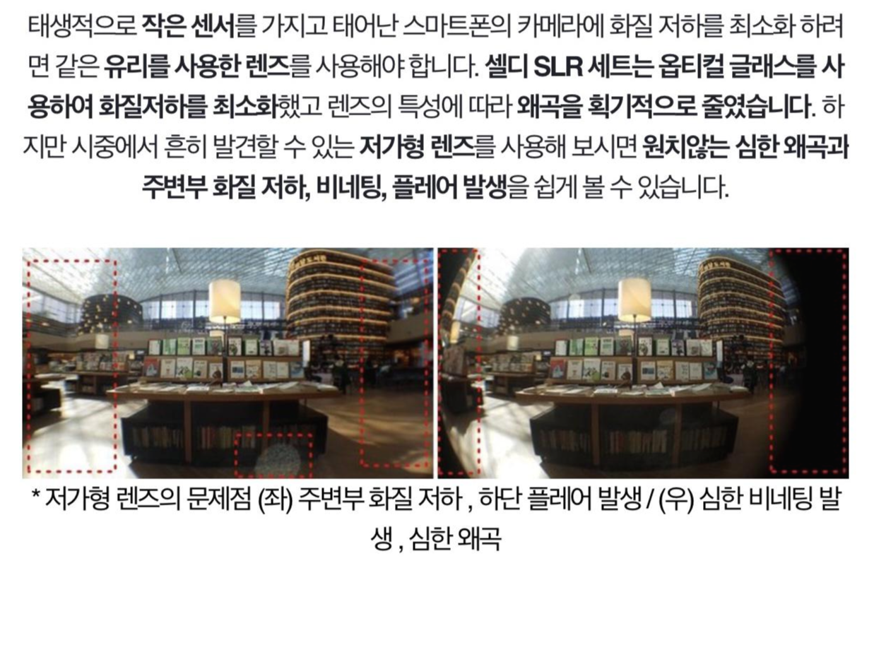 만들어질때부터 작은 센서를 가지고 태어난 폰카메라의 화질 저하를 최소화하기 위해서는 동일한 유리를 사용한 렌즈 사용이 필요합니다.