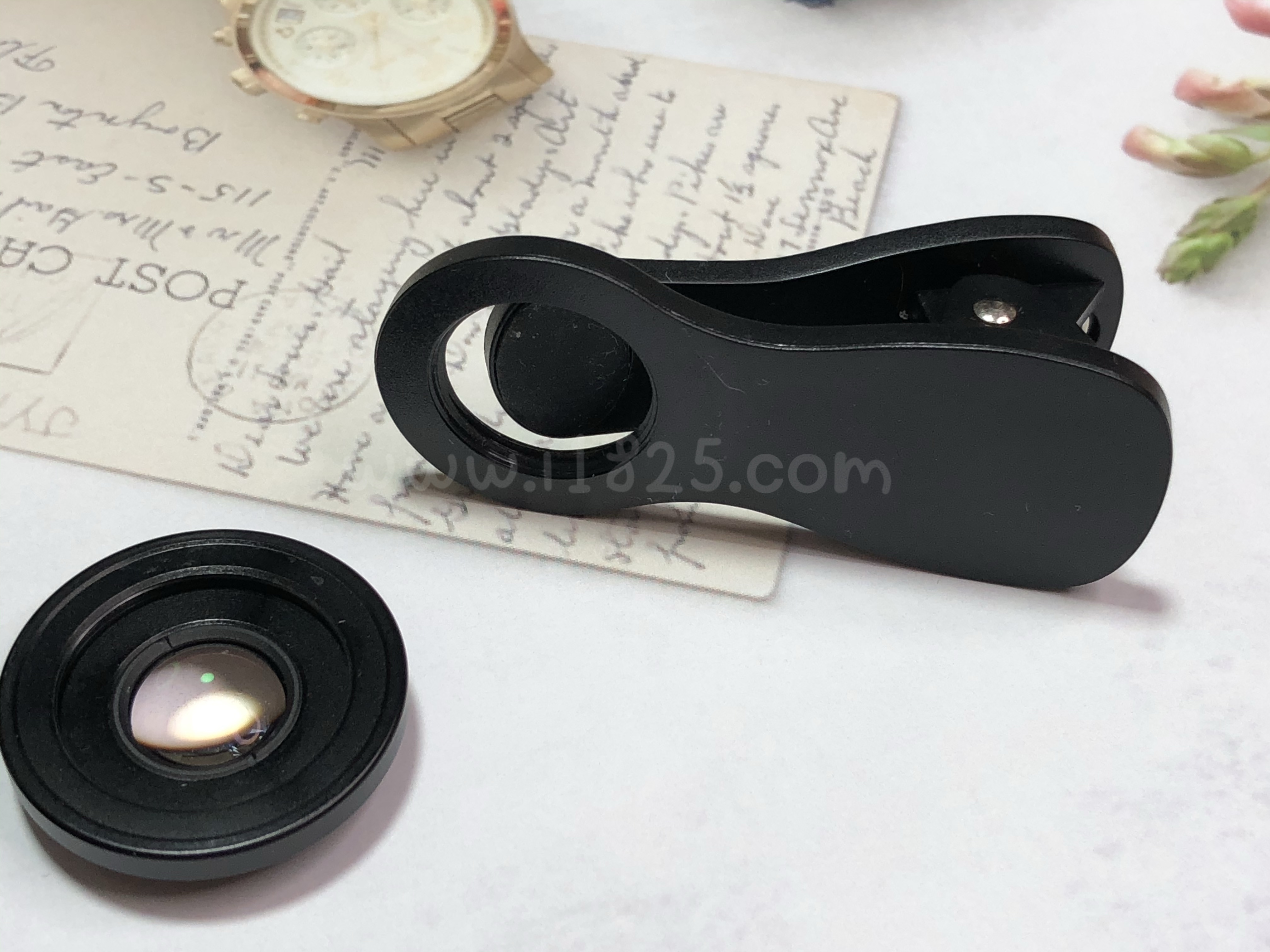 - 핸드폰 카메라 렌즈에 마이포브 FF 10mm 2in1 렌즈를 집게로 잡아끼워 결합합니다.