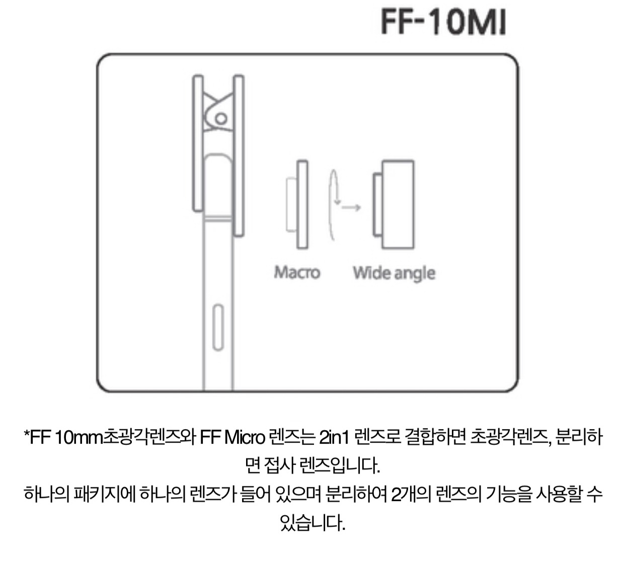 - FF 10mm 초광각 렌즈와 FF Micro 렌즈는 2in1 렌즈로 결합하면 초광각렌즈가 되며 분리하면 접사 렌즈로 사용할 수 있습니다.