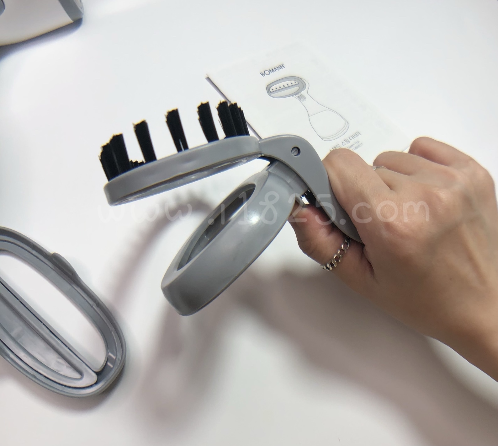 4. 스팀분사판에 쿠션 브러쉬 클립 혹은 먼지제거 브러쉬 등의 클립을 장착시킵니다. (스팀의 헤드 부분의 아래, 위 정 가운데 파져있는 홈 부분에 밀어넣어 "딸각" 소리가 날때까지 장착시켜주세요.)