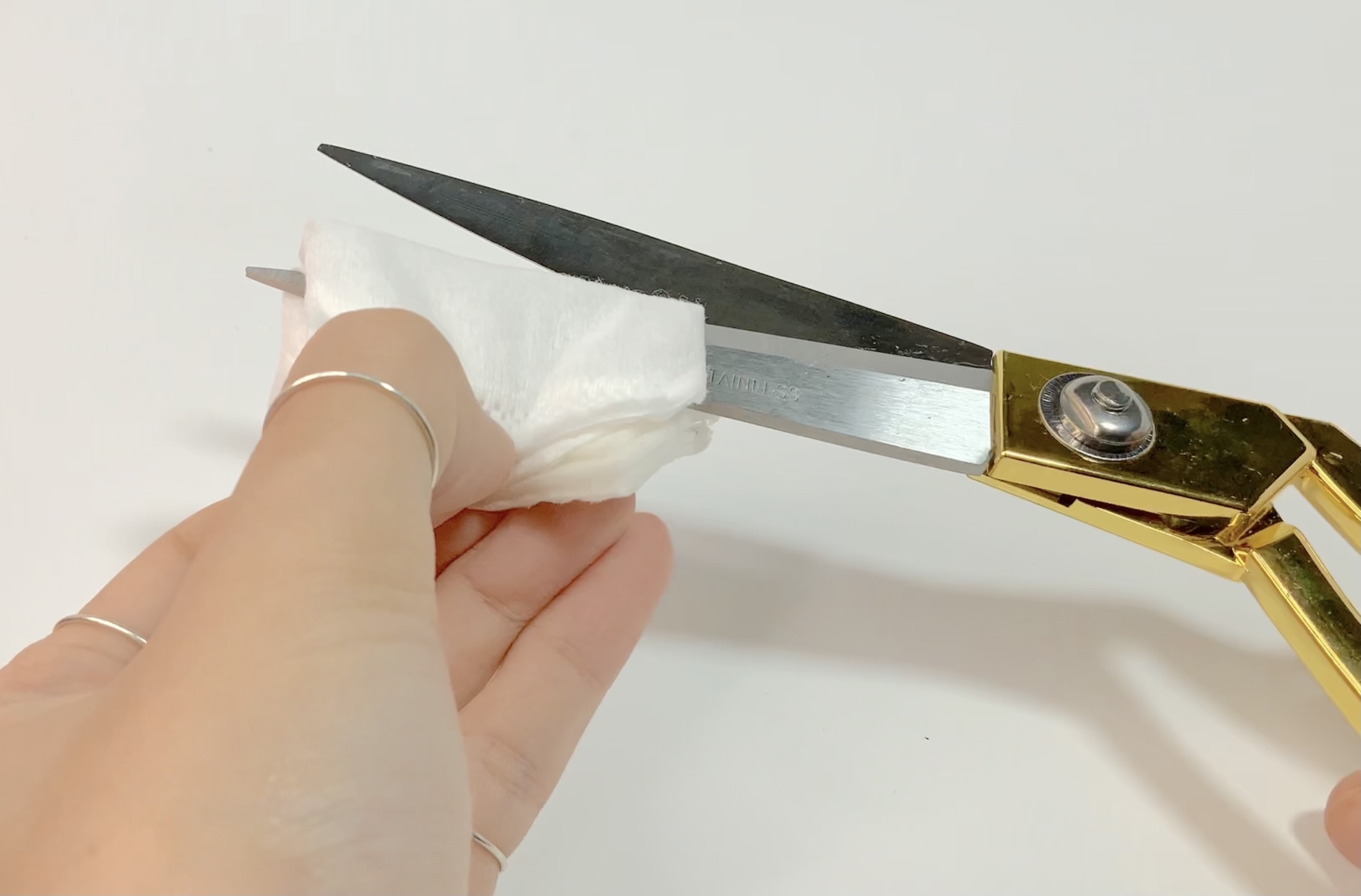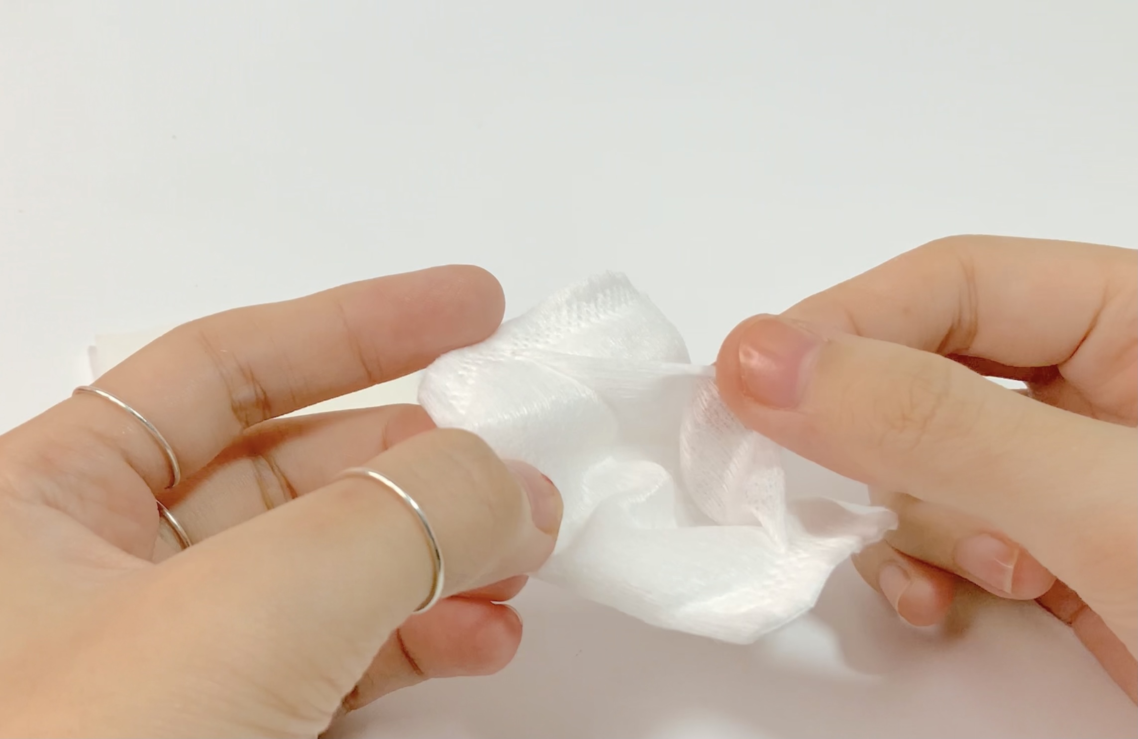- 가위를 이용하여 두 화장솜의 절반을 자릅니다.