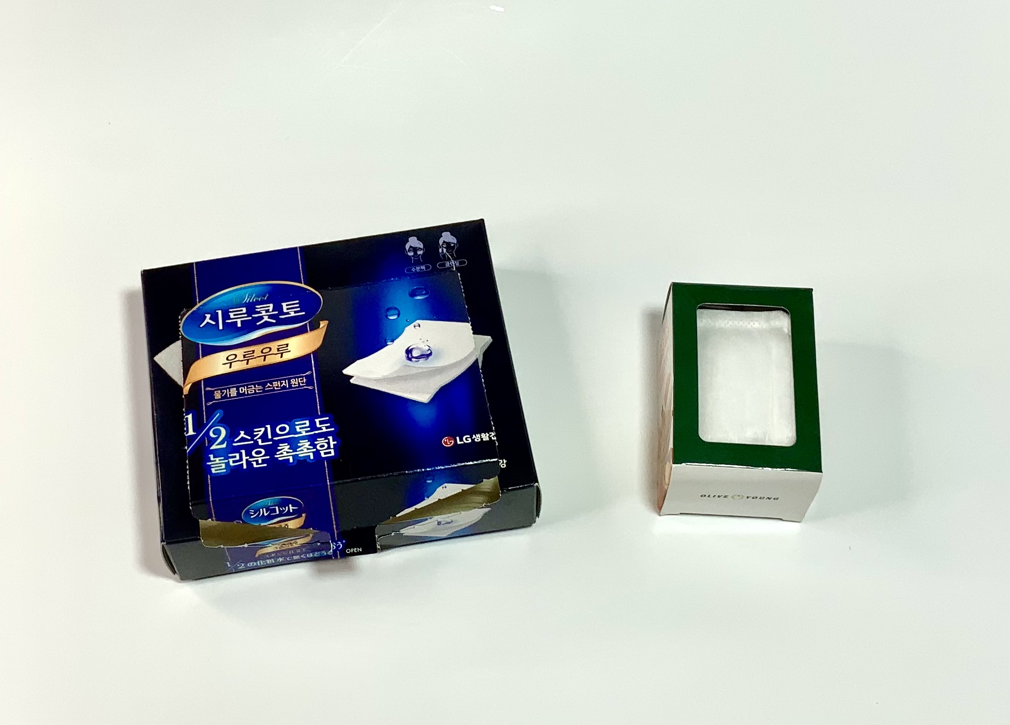 - 종류가 다른 시루콧토 우루우루 화장솜과 일반 타 브랜드의(샘플로 올리브영에서 받아 온) 화장솜을 준비합니다.