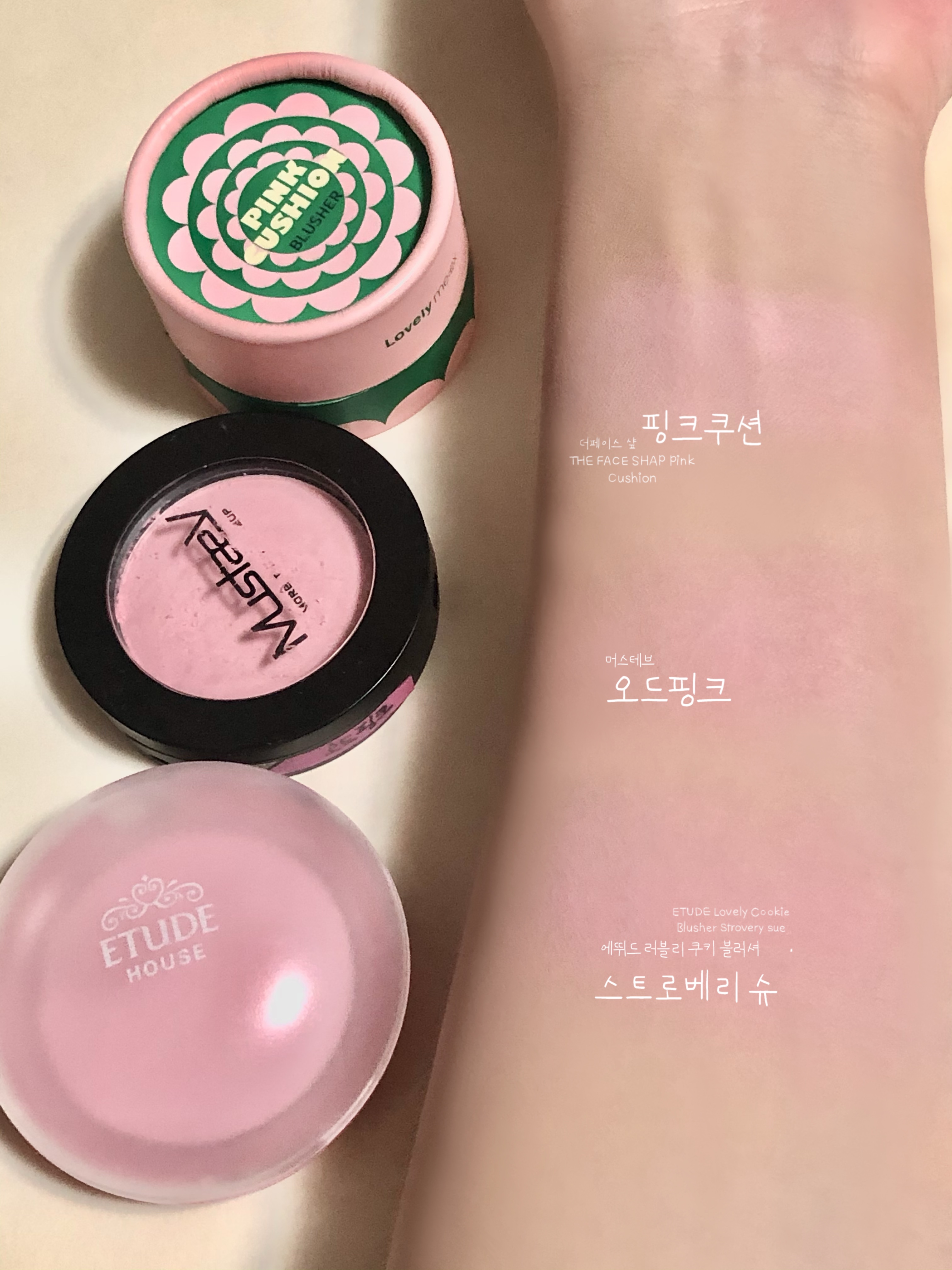 안녕하세요♥오늘은 k뷰티의 초석이 될 수 있는 블러셔!! 블러셔라 하면 기본 적으로 첫 타자가 되어 온 핑크 블러셔! 전통적인 방식으로 만들어 온 파우더 타입의 핑크 블러셔를 소개할게요.  유명무실한 로드샵 모두가 아는 더페이스 샾과 에뛰드 그리고 아는 사람만 아는 그 마력의 입소문 템을 가진 머스테브의 3가지 핑크 블러셔를 그 까이꺼 대~충 비교 발색!! 지금부터 시작합니다.