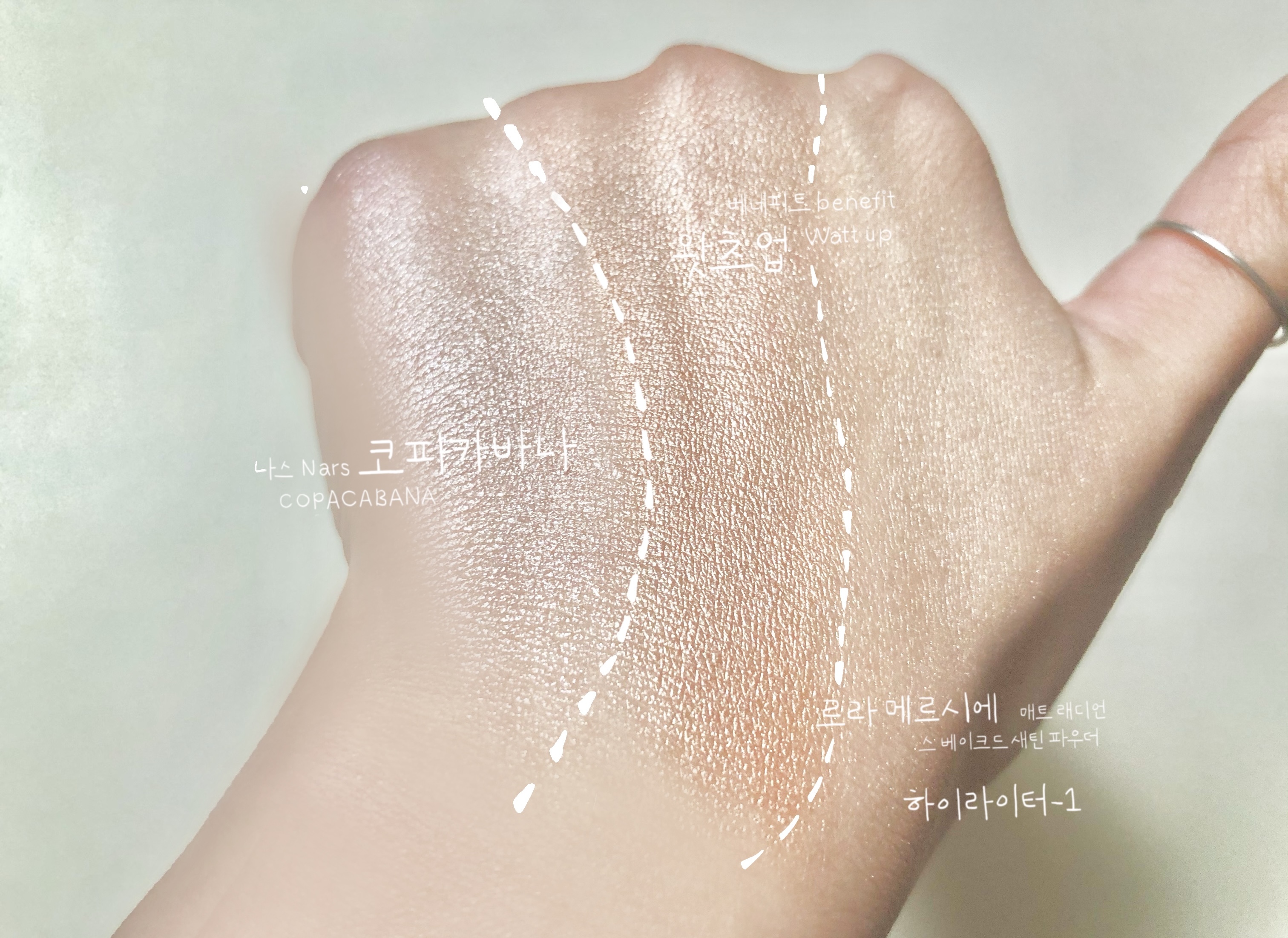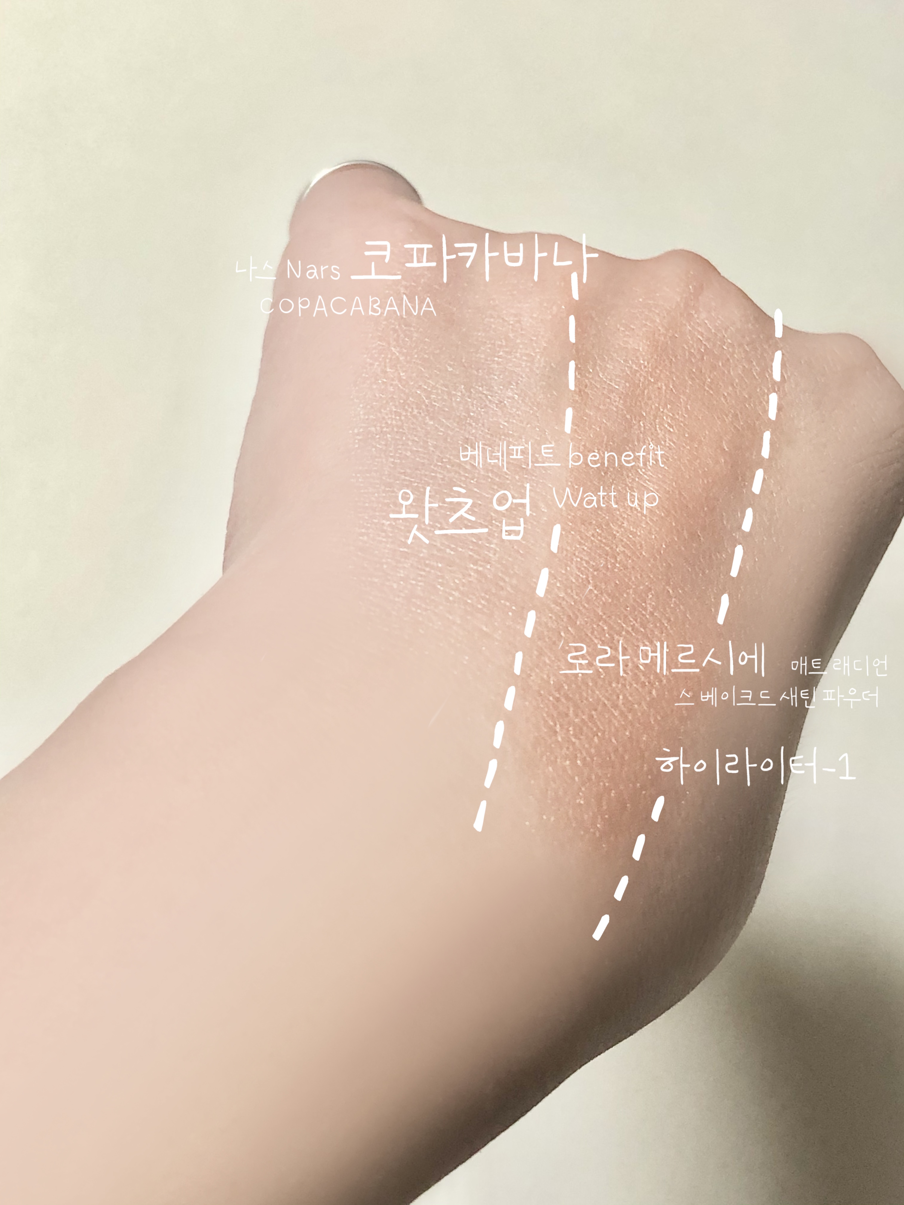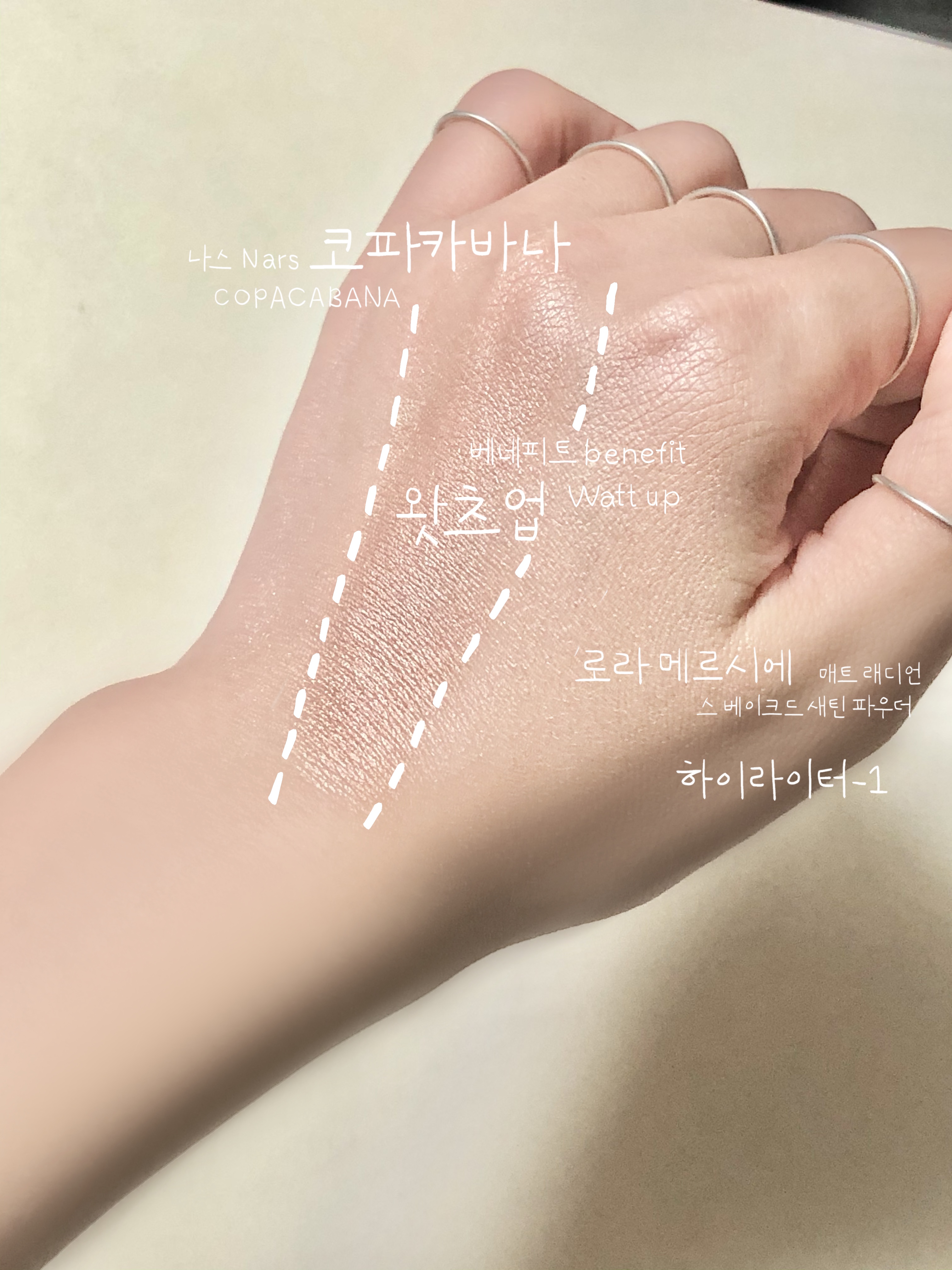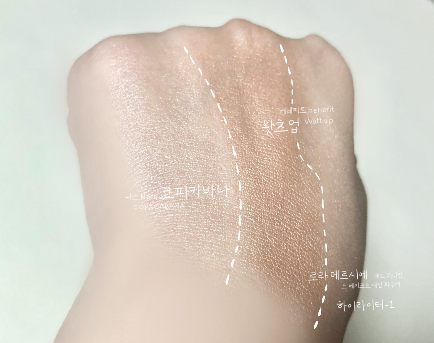스킨톤 하이라이터 3종 비교분석: 나스 코파카바나 & 베네피트 와츠업 ft.로라메르시에