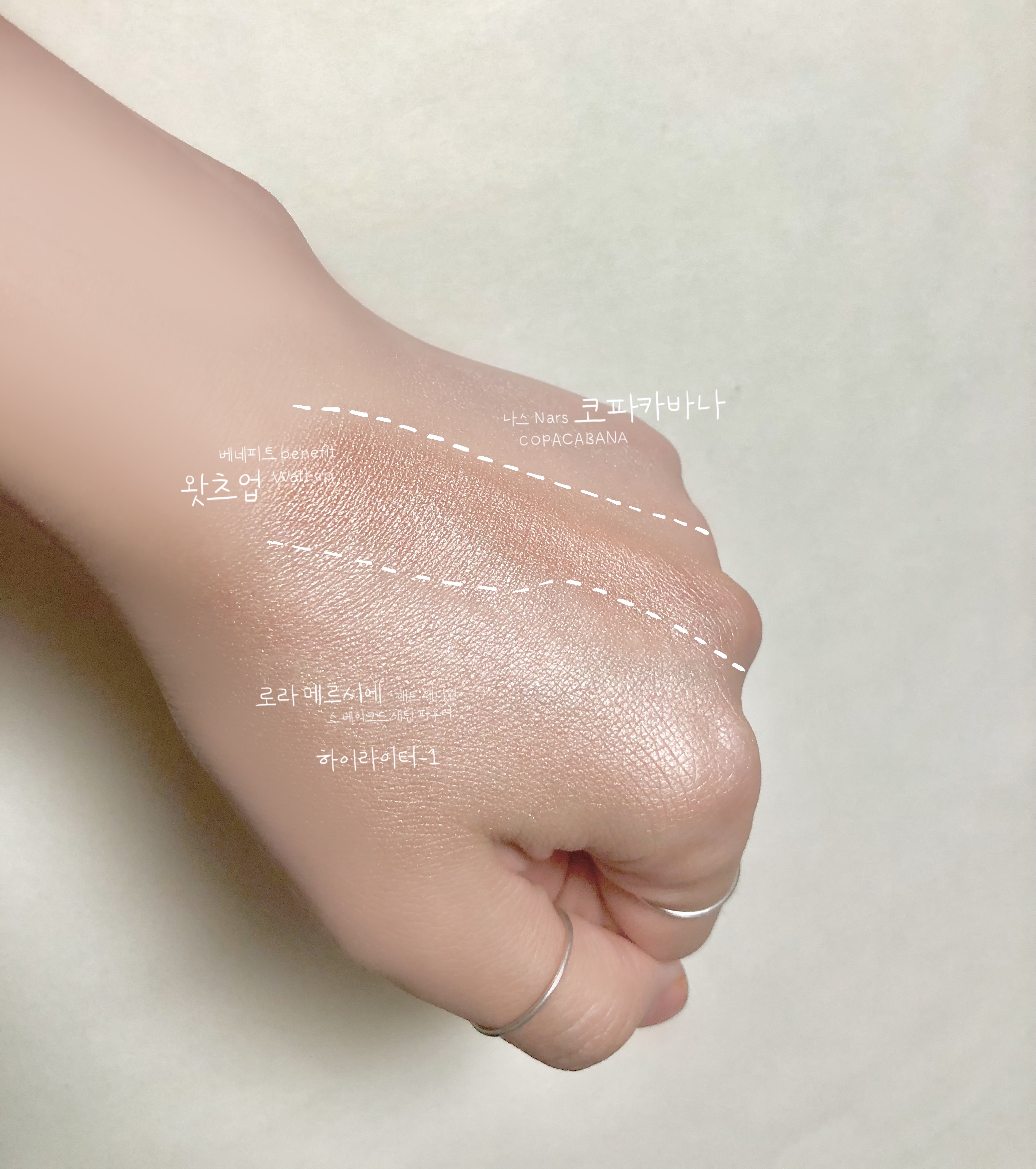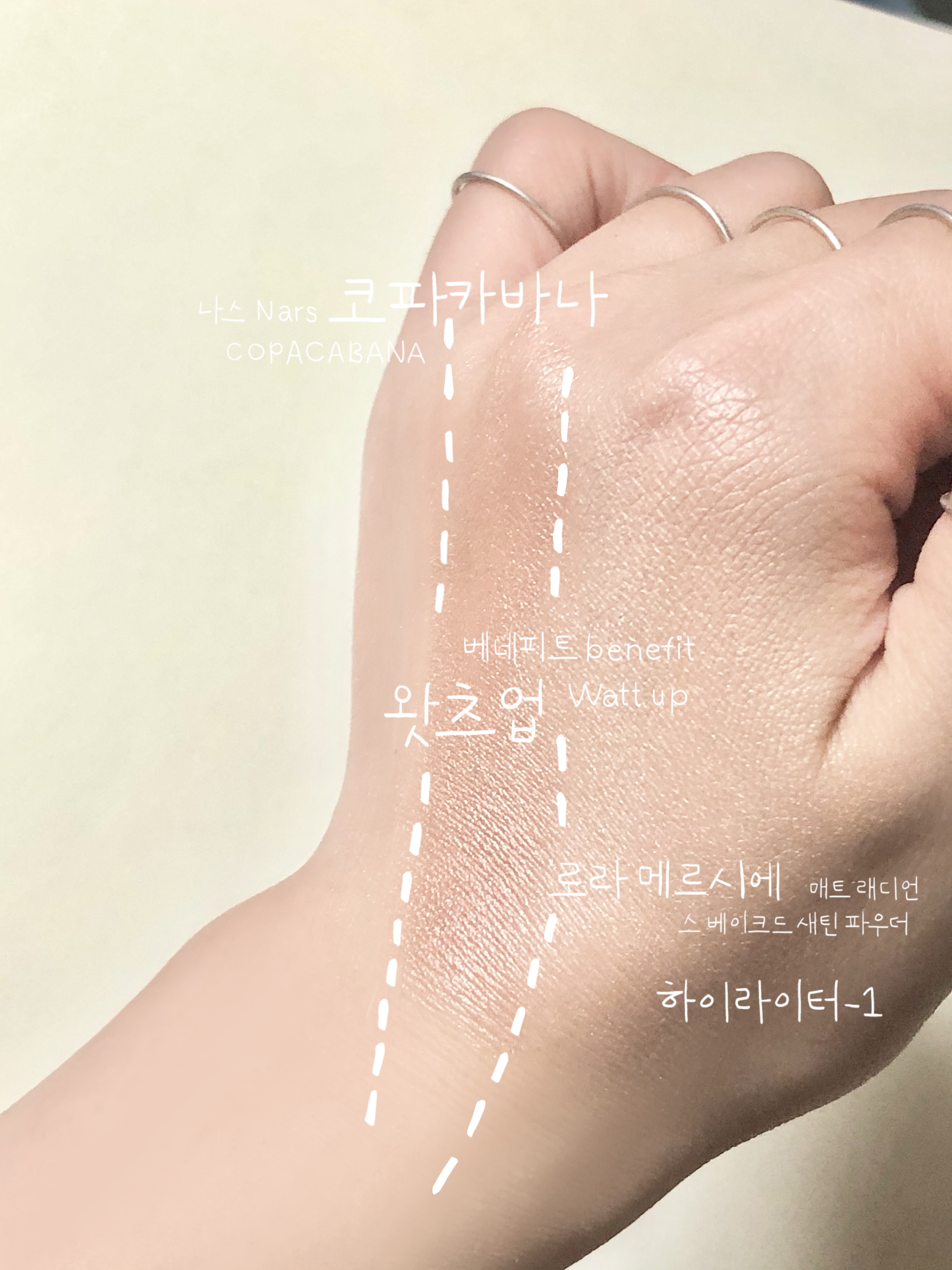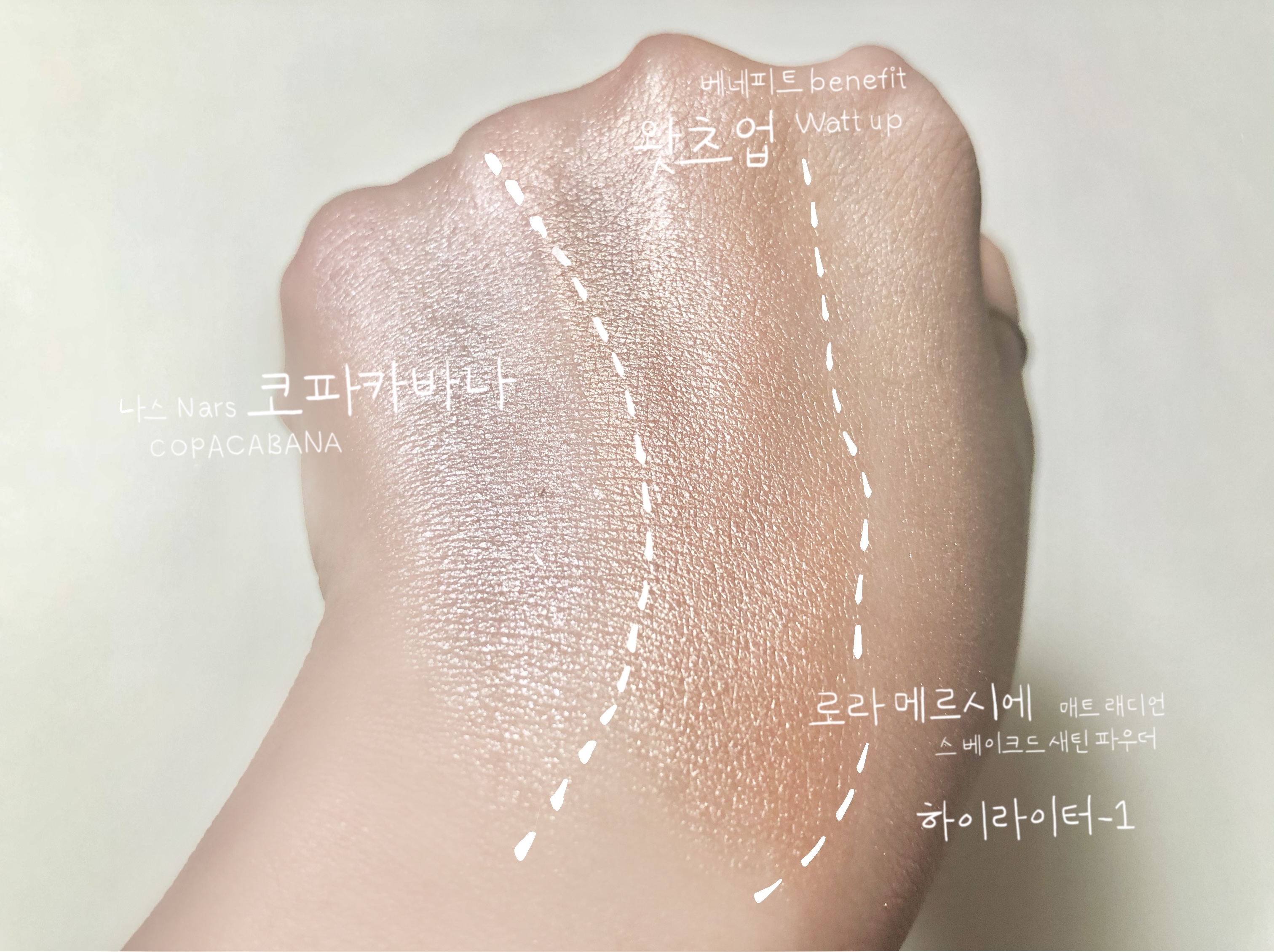 그럼 지금부터 세 가지 자연스러운 하이라이터, 유명 브랜드 맥, 나스, 로라 메르시에를 대표하는 하이라이터를 비교 발색해보겠습니다.