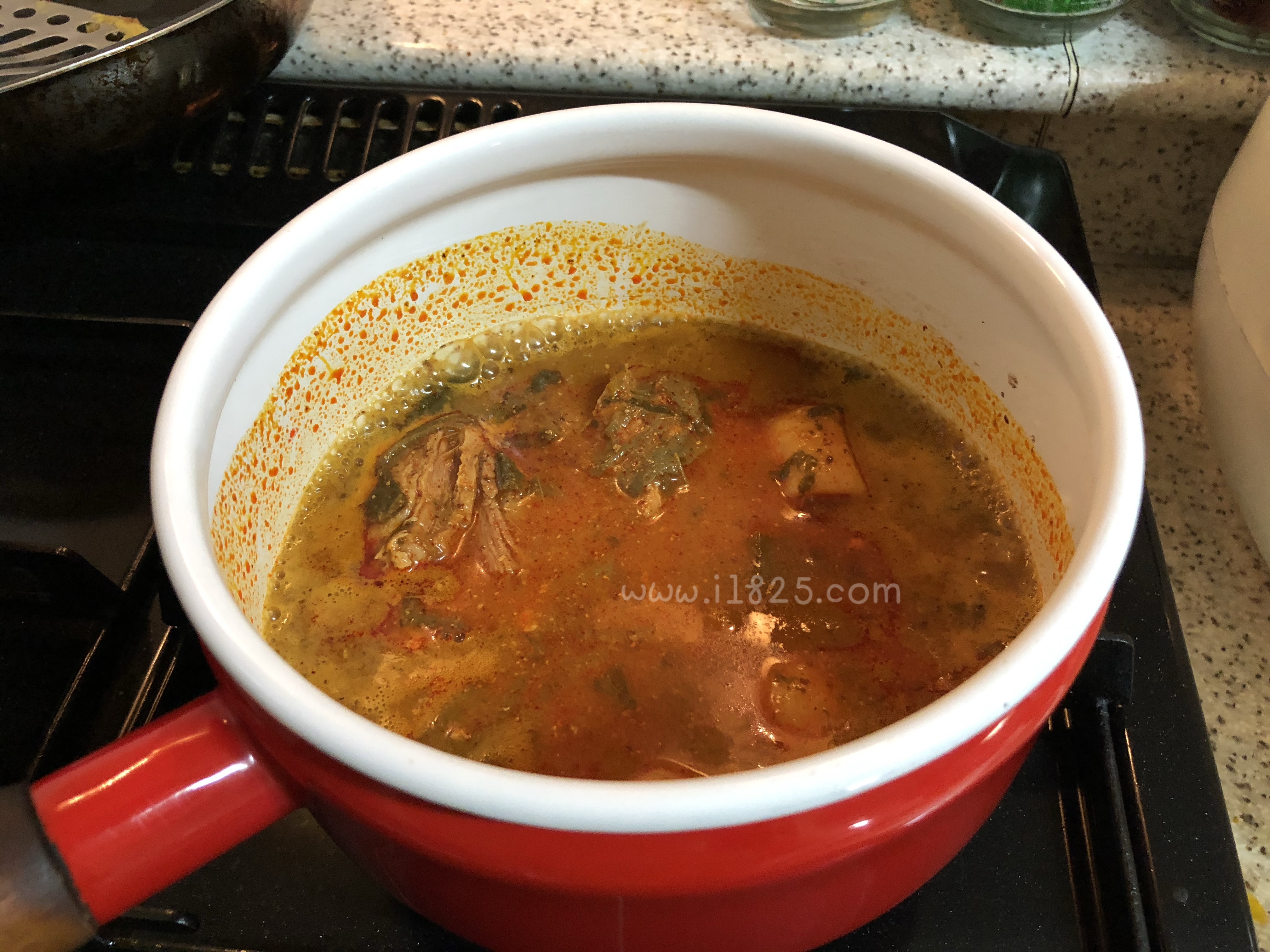 - 직접 우려낸 따끈한 육수(돼지뼈를 직접 우려내 고춧가루와 마늘로 감칠맛을 살려낸 육수)입니다.