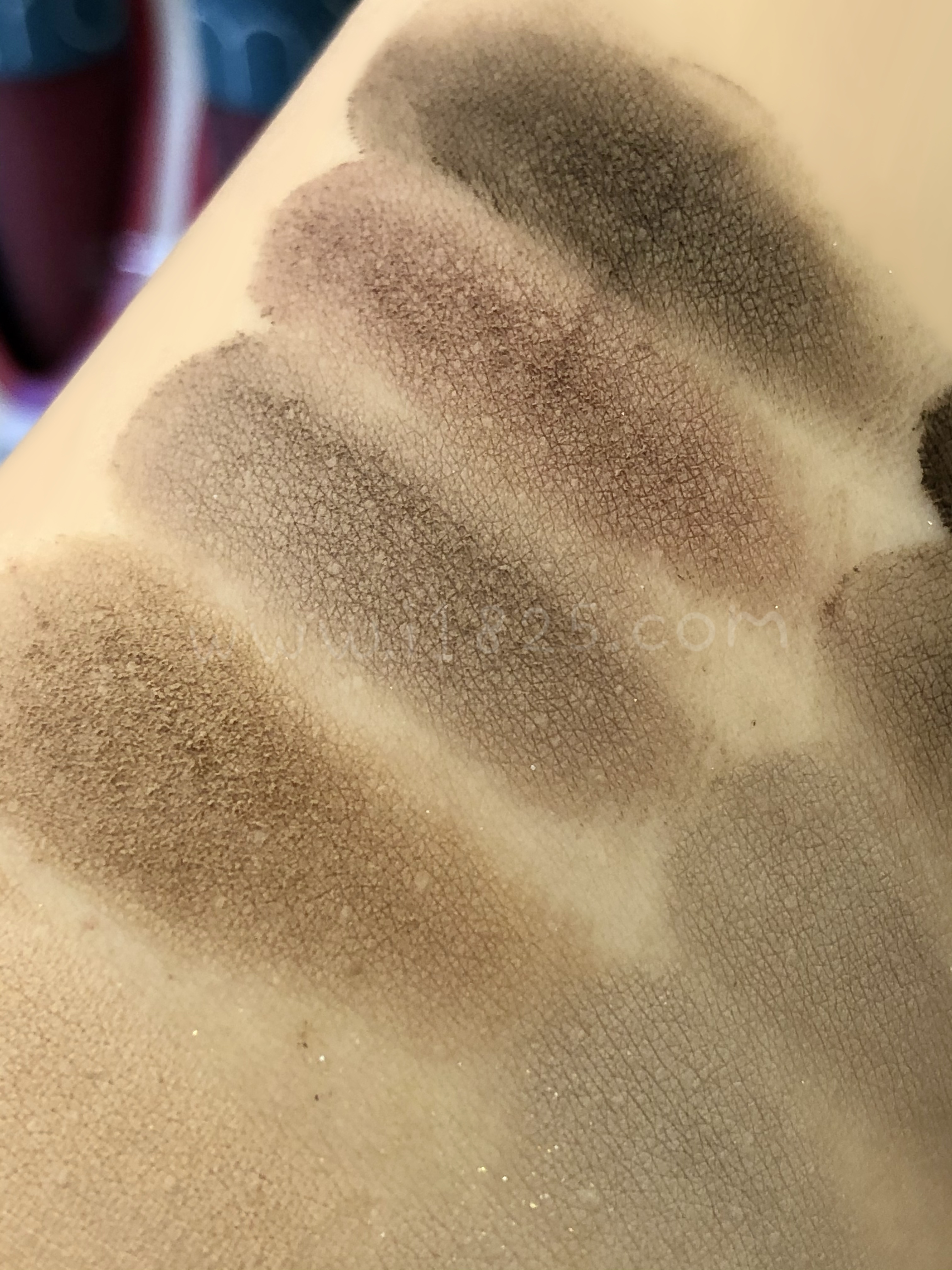 그냥 잿빛 그레이에서 윗줄은 한 가지 웜톤 컬러 빼고 네 가지 색상은 모두 쿨톤 섀도우로 첫째 줄 5번 섀도우 DUSTY LAND와 둘째 줄 5번 섀도우 SOFT BLACK은 거의 같은 느낌을 주는 컬러입니다.