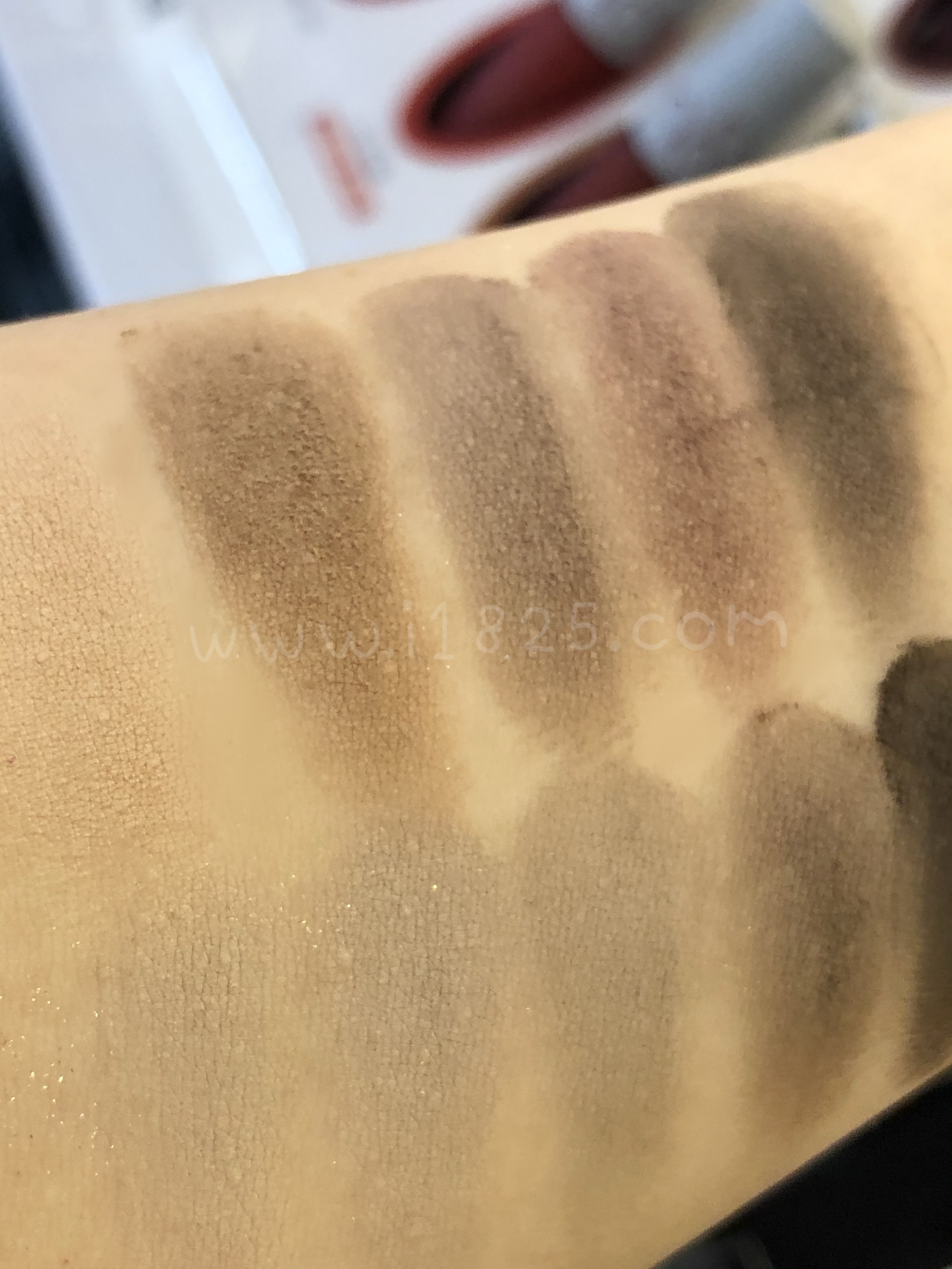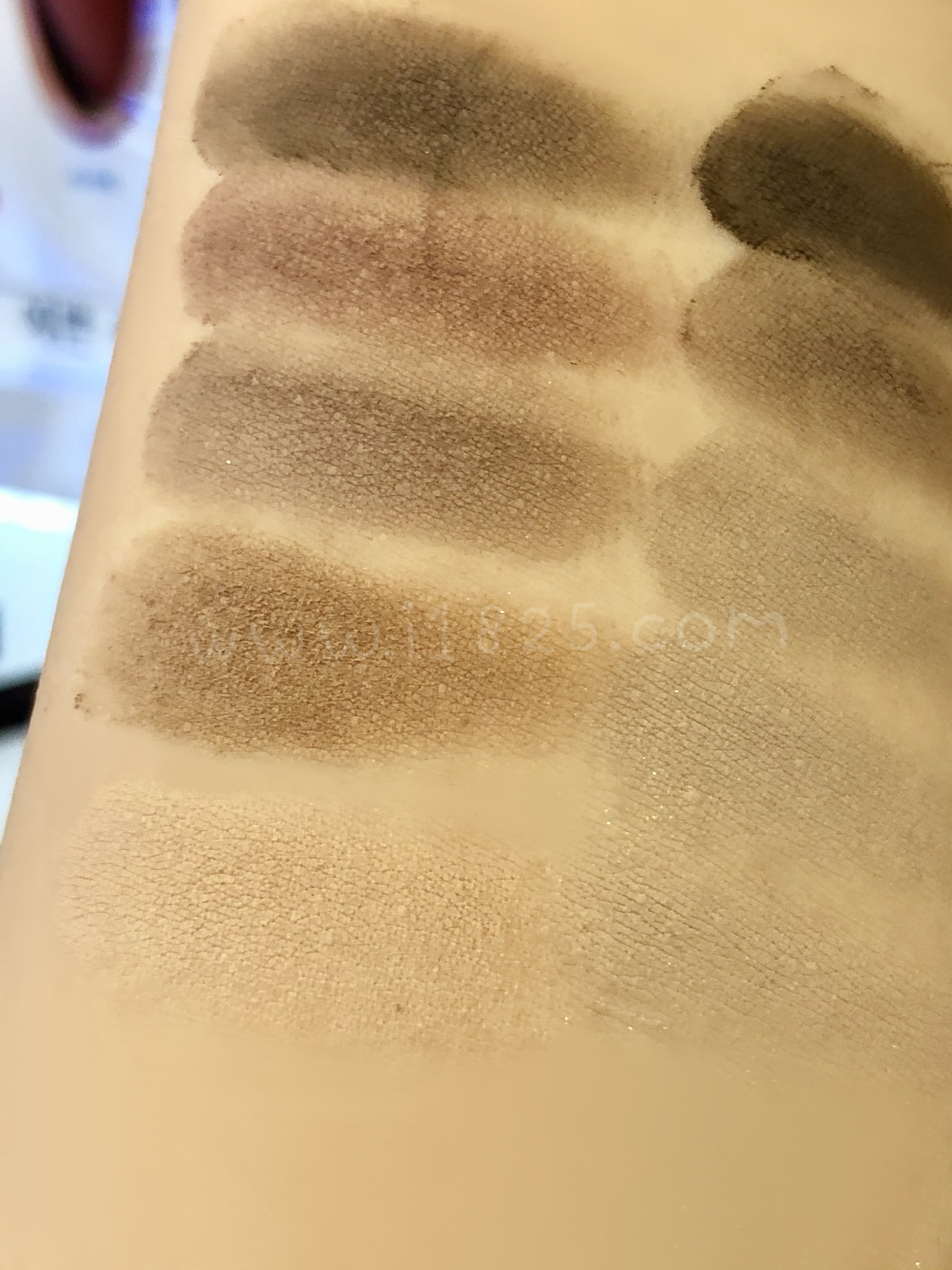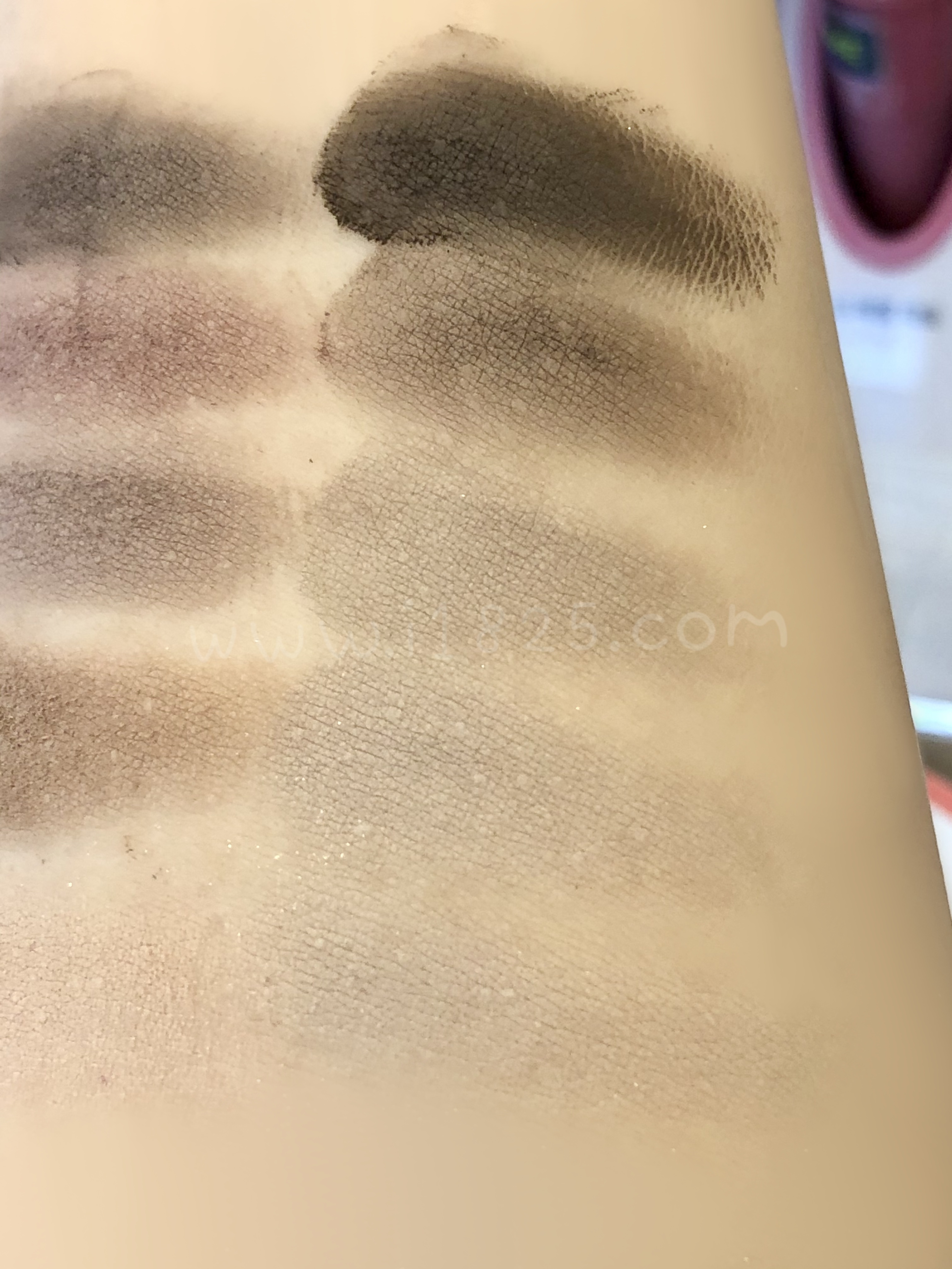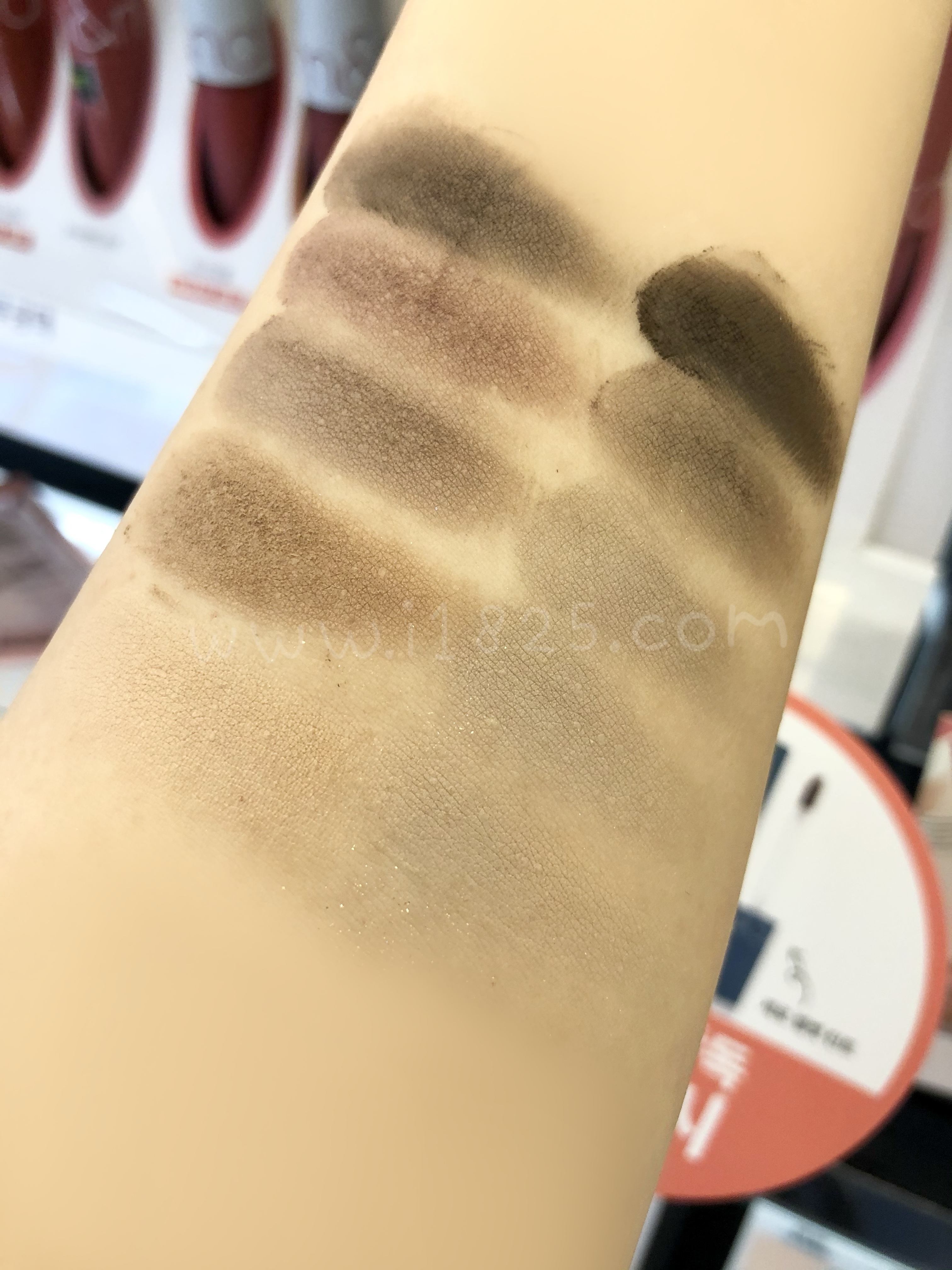 첫째 줄 5번 섀도우 DUSTY LAND, 둘째 줄의 4번 섀도우 TAUPE BROWN의 컬러는 헤어라인 또는 너무 진하지 않은 아이라인으로 활용할 수 있을 만큼의 어두운 명도를 가졌어요.