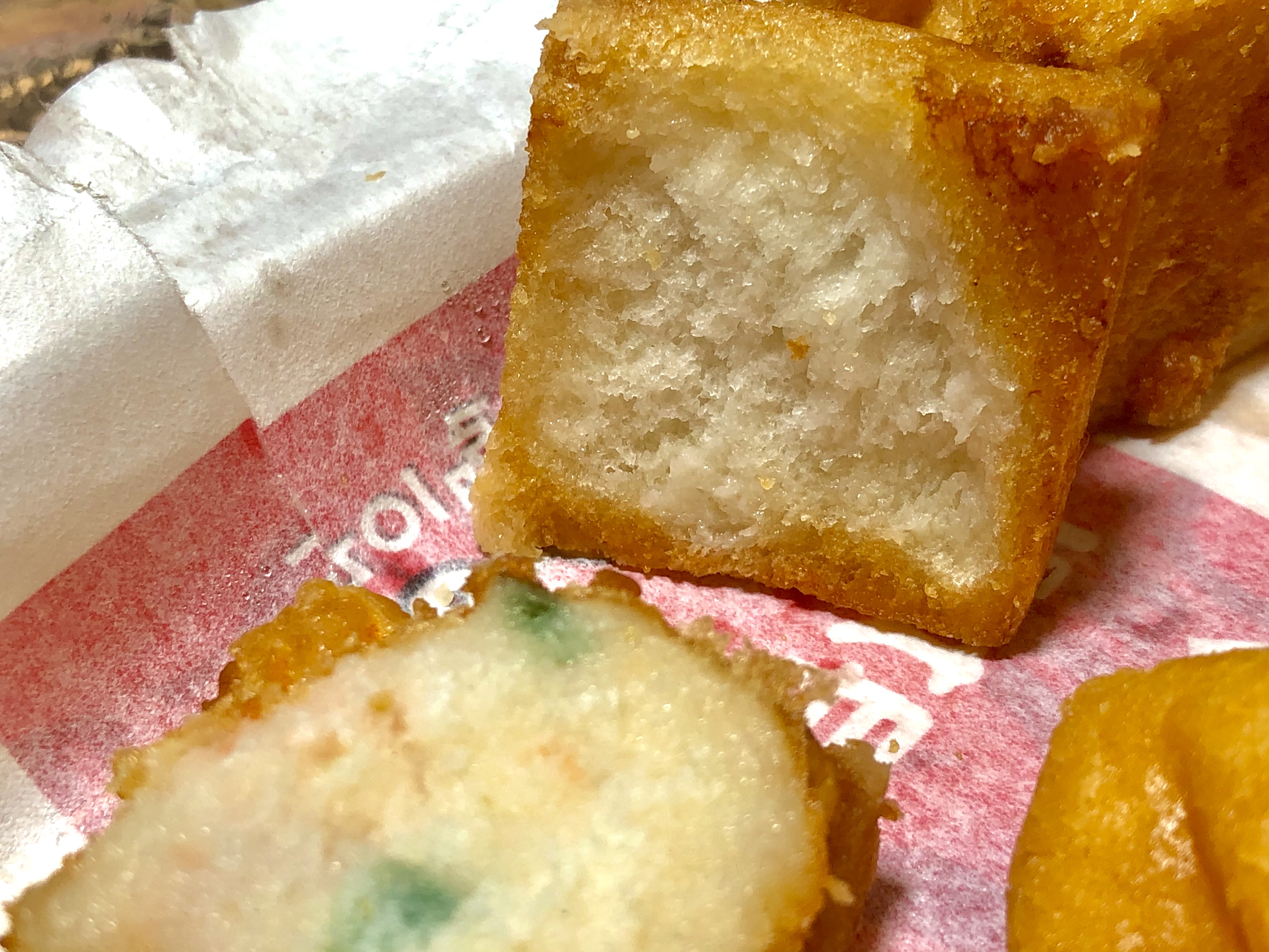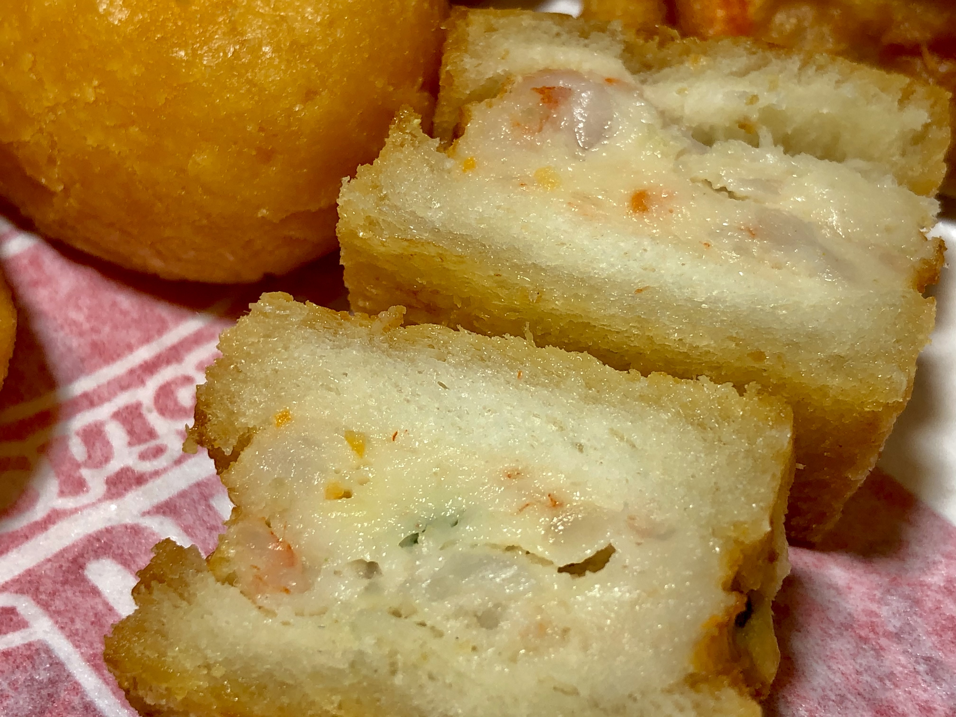 귀엽게 사각형으로 자른 식빵에 새우를 넣고 속을 샌드위치 마냥 넣어서 기름에 바싹하게 튀겨낸 비비큐의 멘보샤입니다. ㅠ