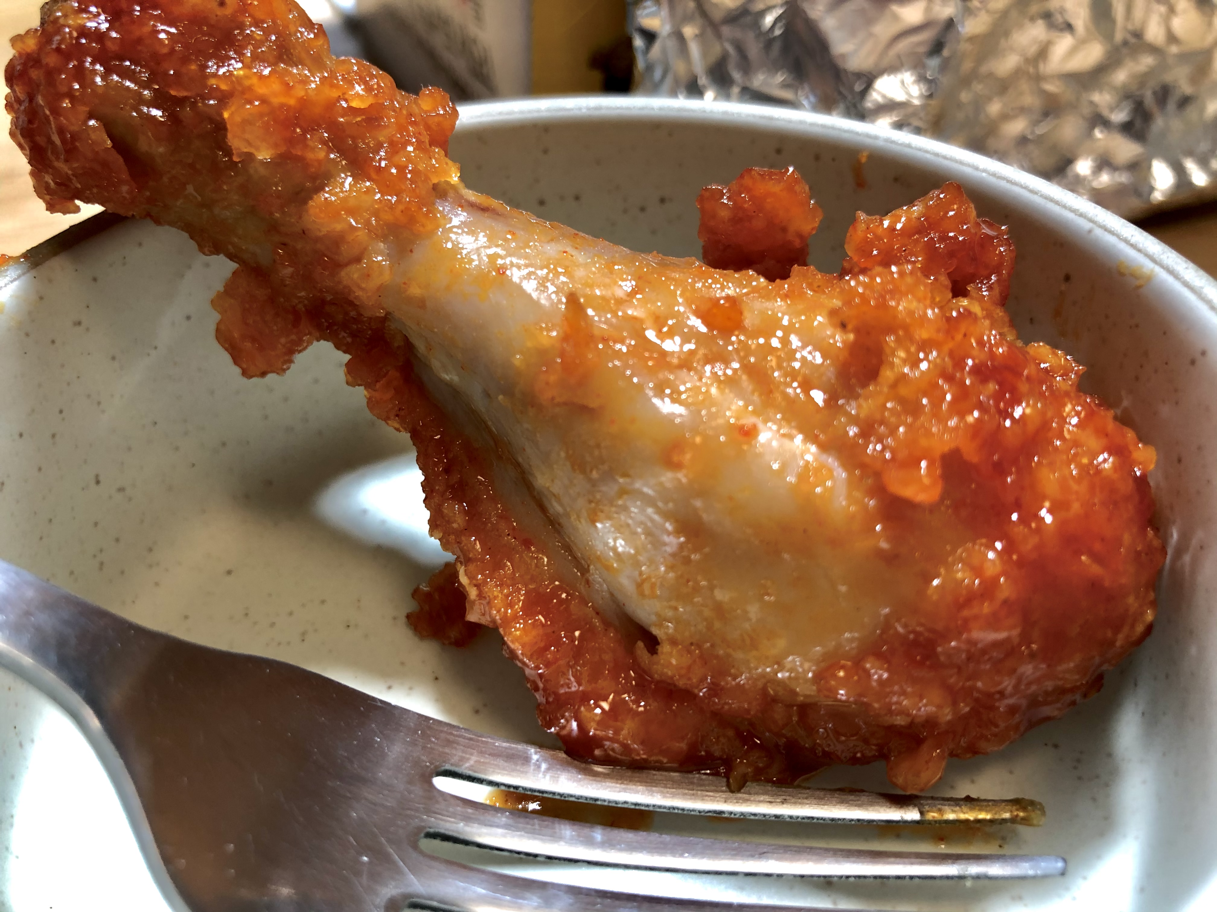 비비큐에는 어떤 비법이 있는 건지 이렇게 따끈하고 끈덕진 소스에 휘감아져 왔는데도 아직 닭껍질이 바삭바삭한 부분이 남아있어요.