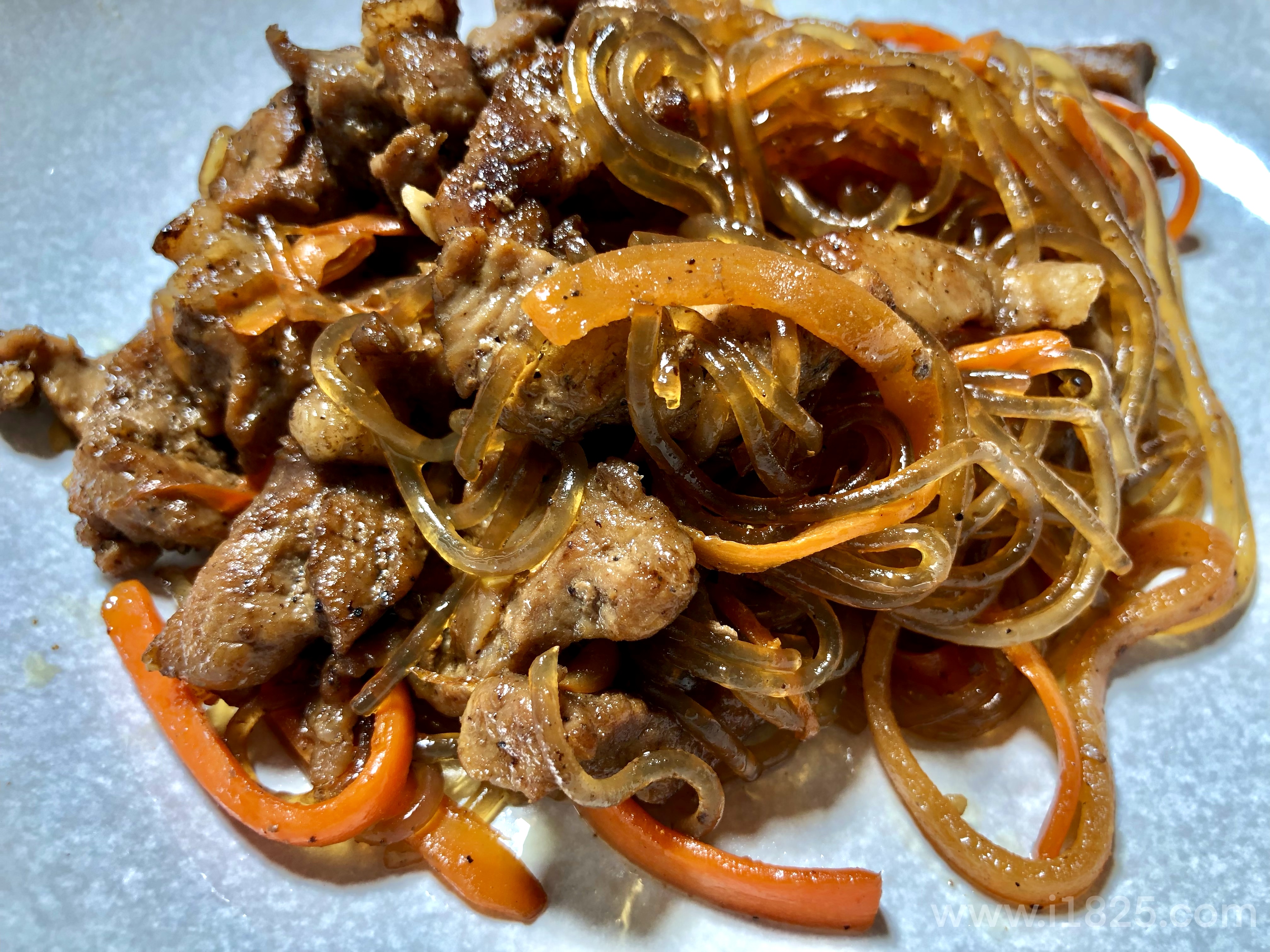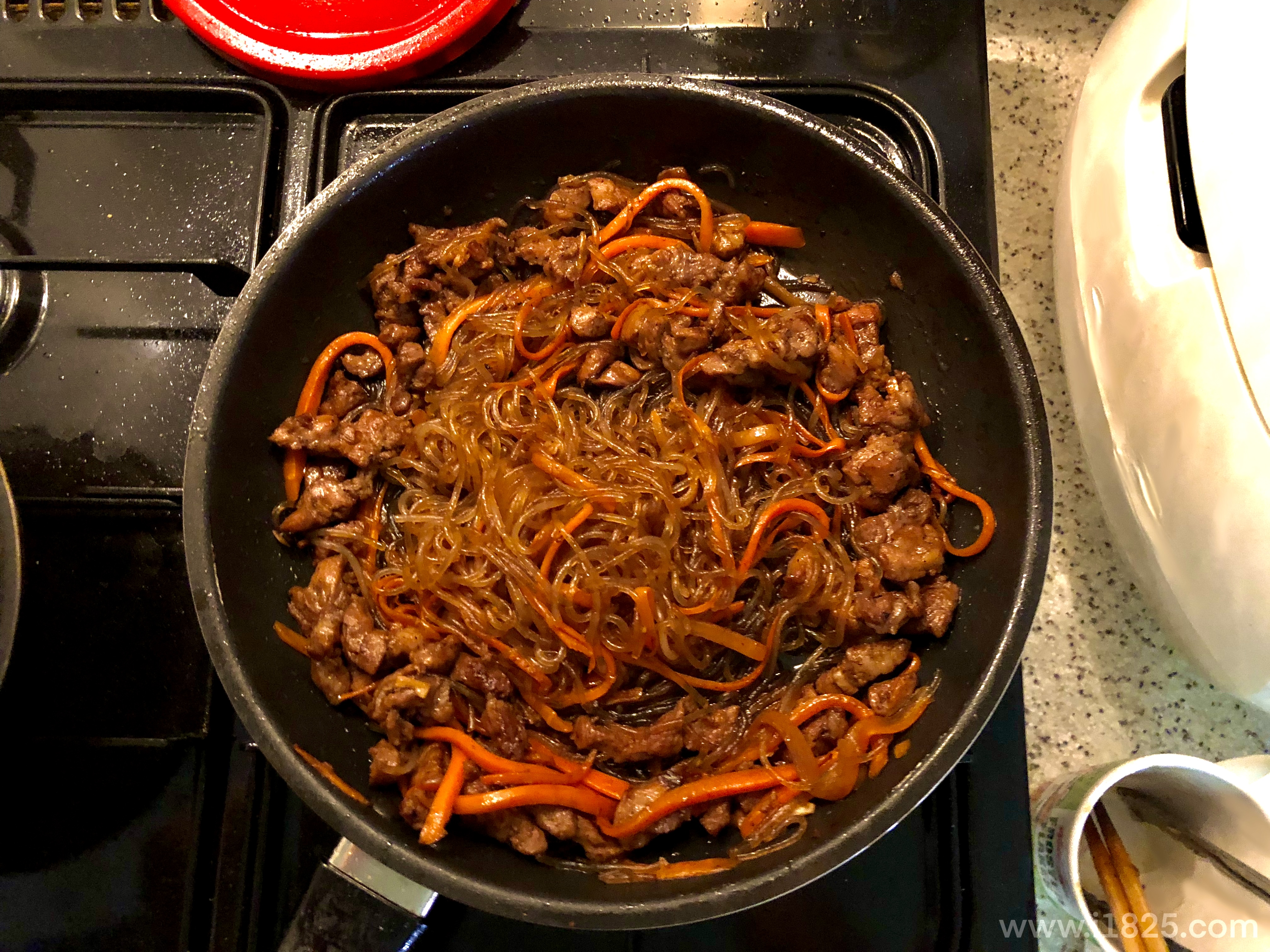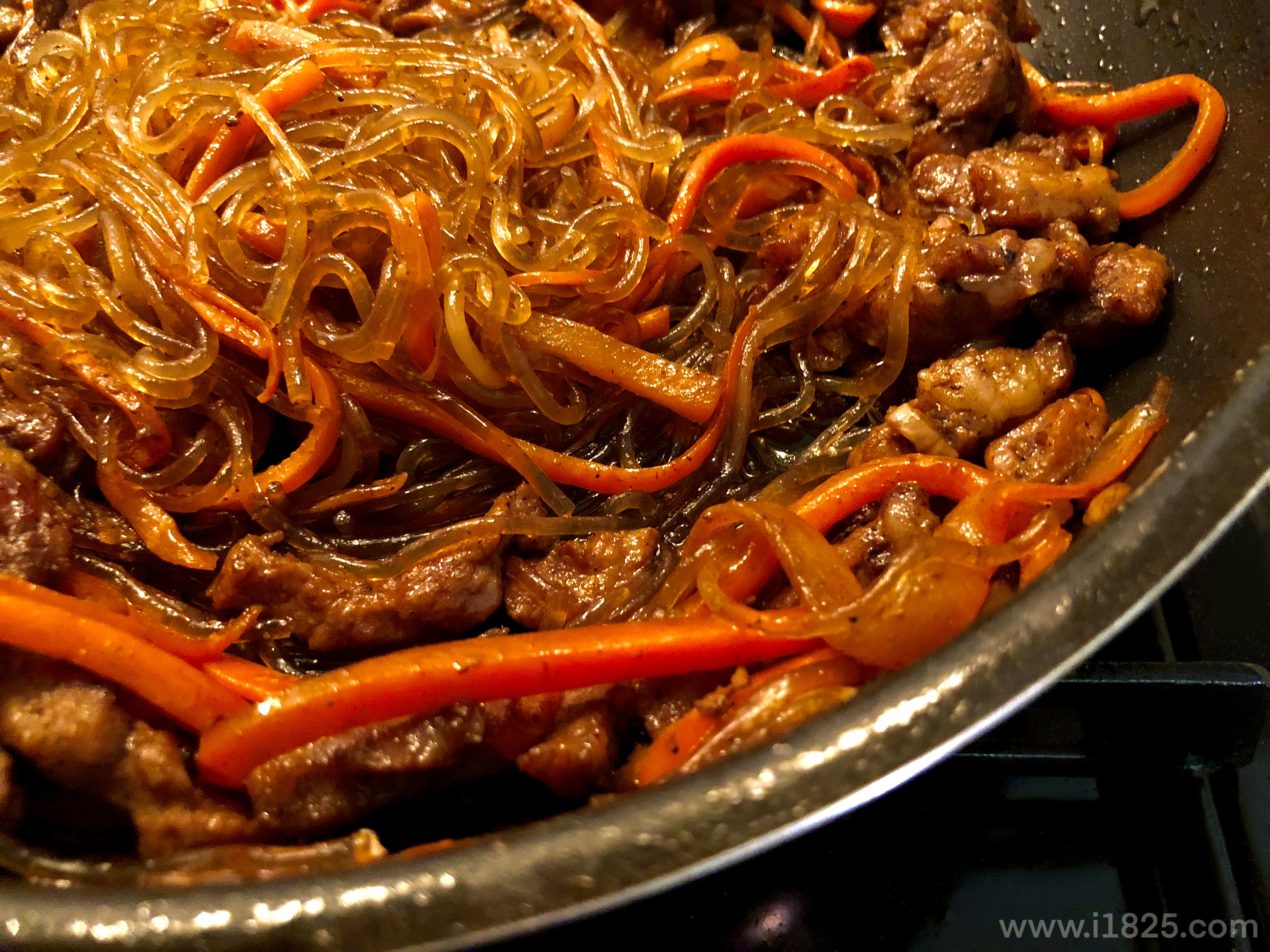 3. 돼지고기와 당근이 어느 정도 익으면 마지막 불려놓은 당면을 넣고 양념을 조금씩 추가하면서 마지막으로 볶아주면 돼지고기 잡채 완성!!입니다.