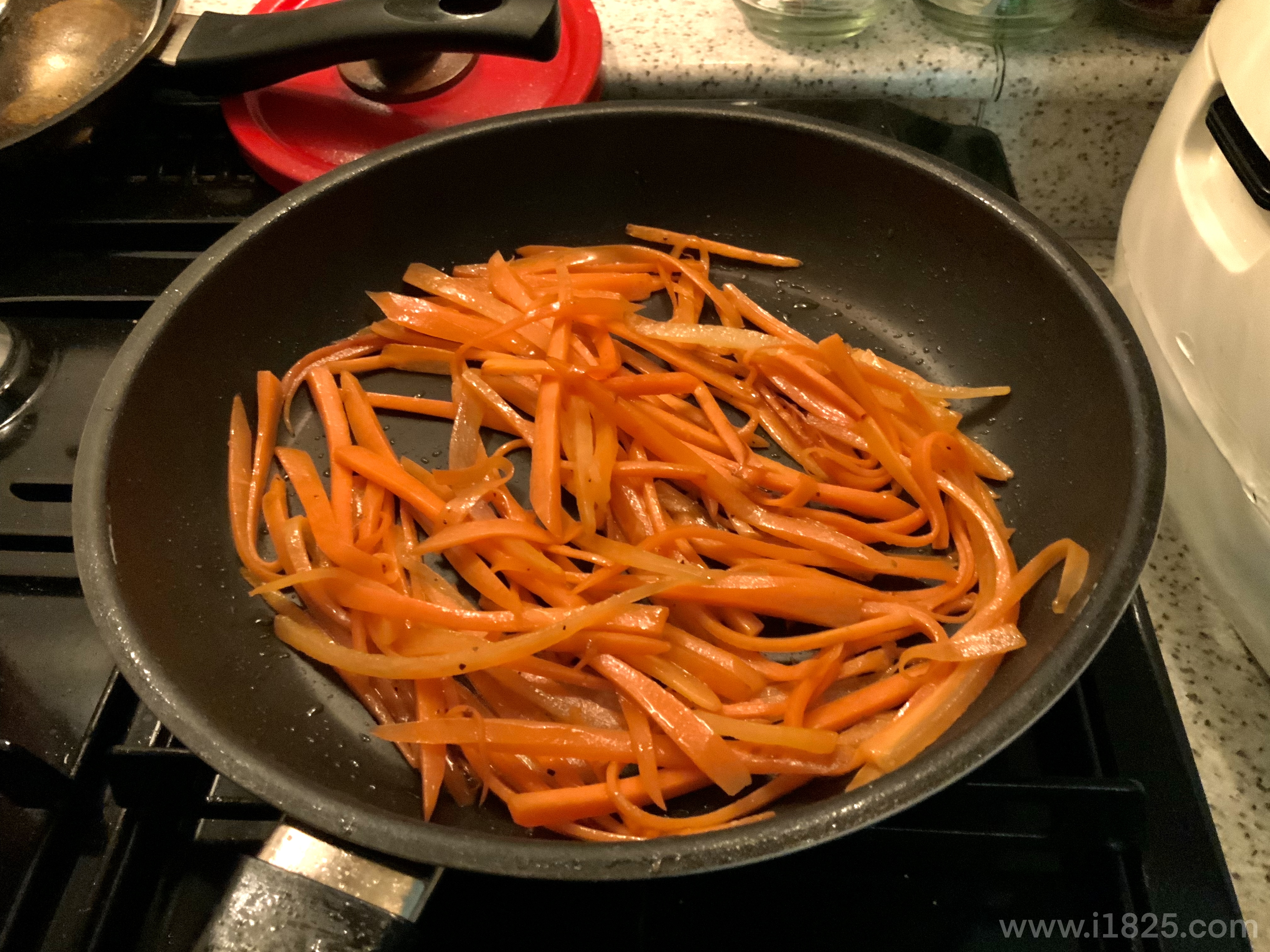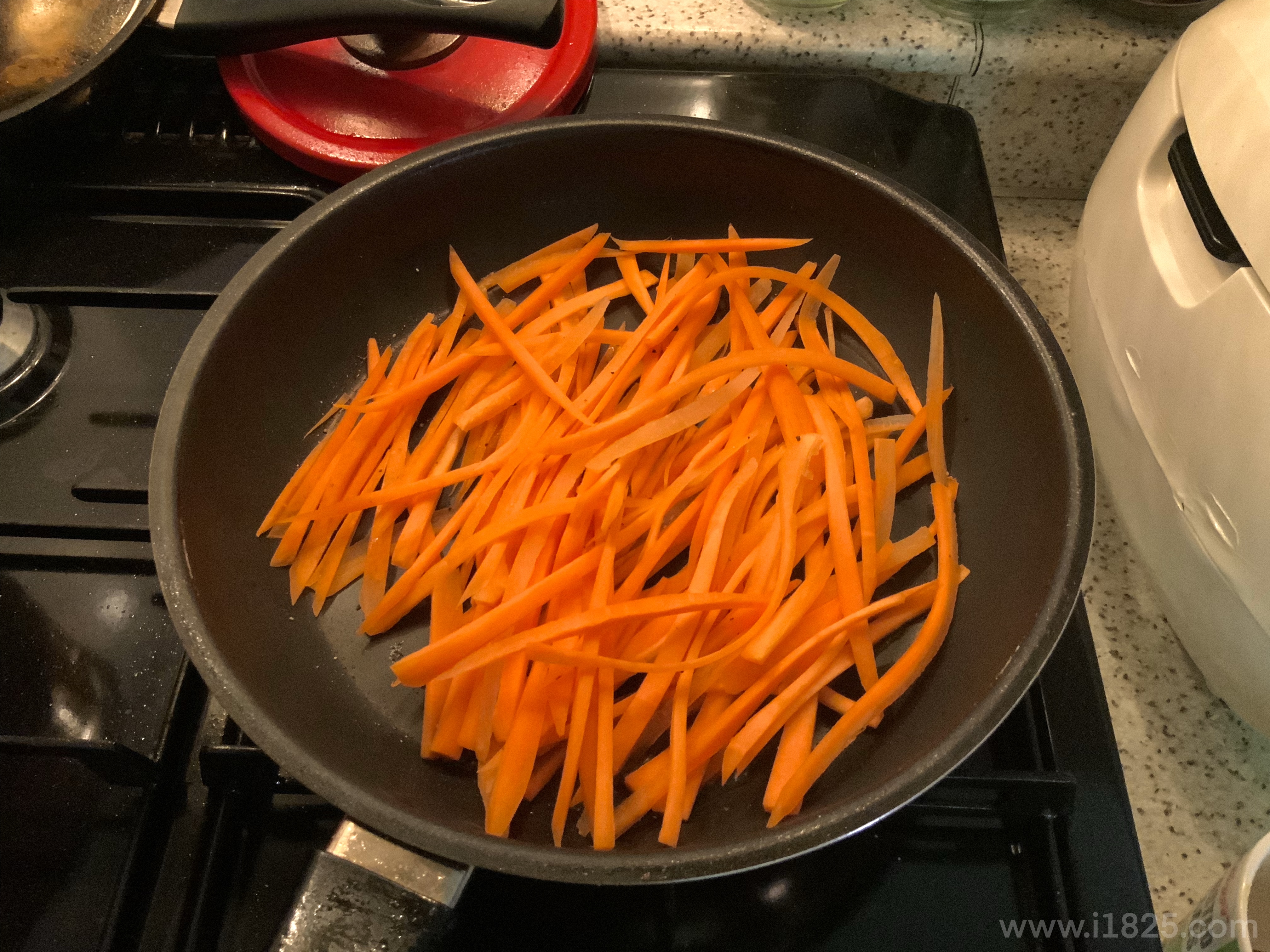 2. 채 썬 당근을 기름을 두른 팬에 당근이 살짝 투명해질 때까지 볶아주세요.