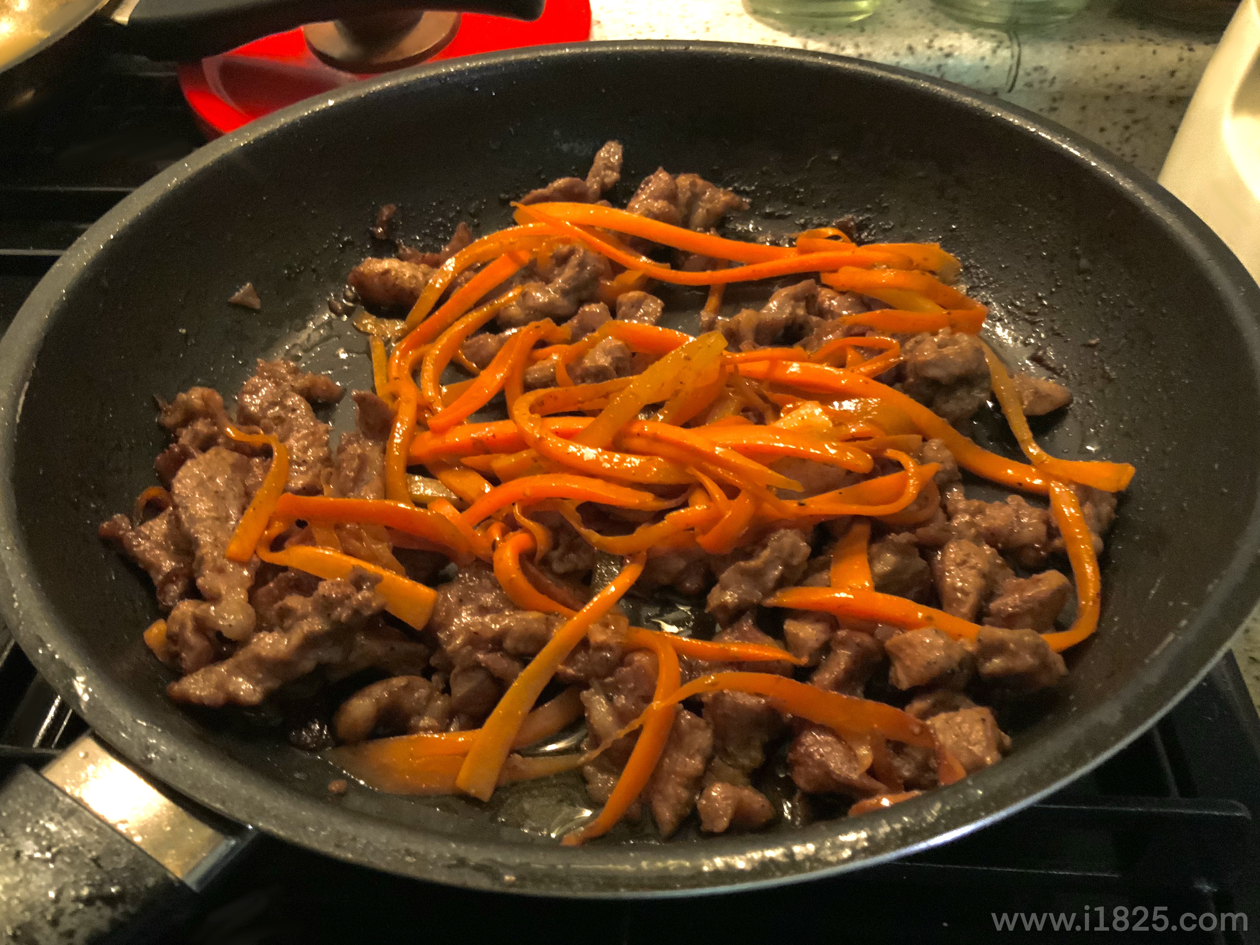 2. 돼지고기가 반 정도 익고 나면 미리 볶아놓은 당근을 넣고 마저 볶아줍니다.