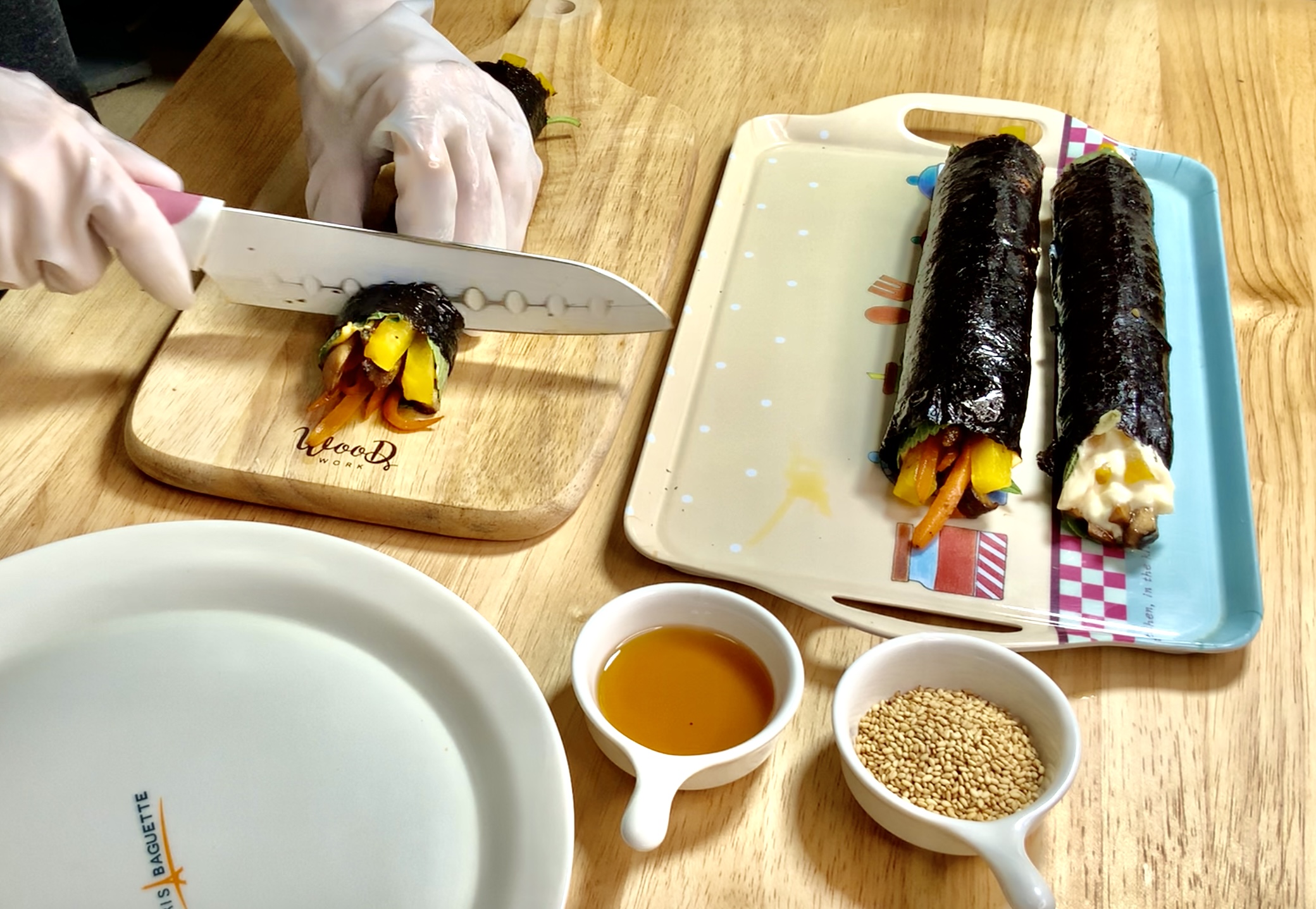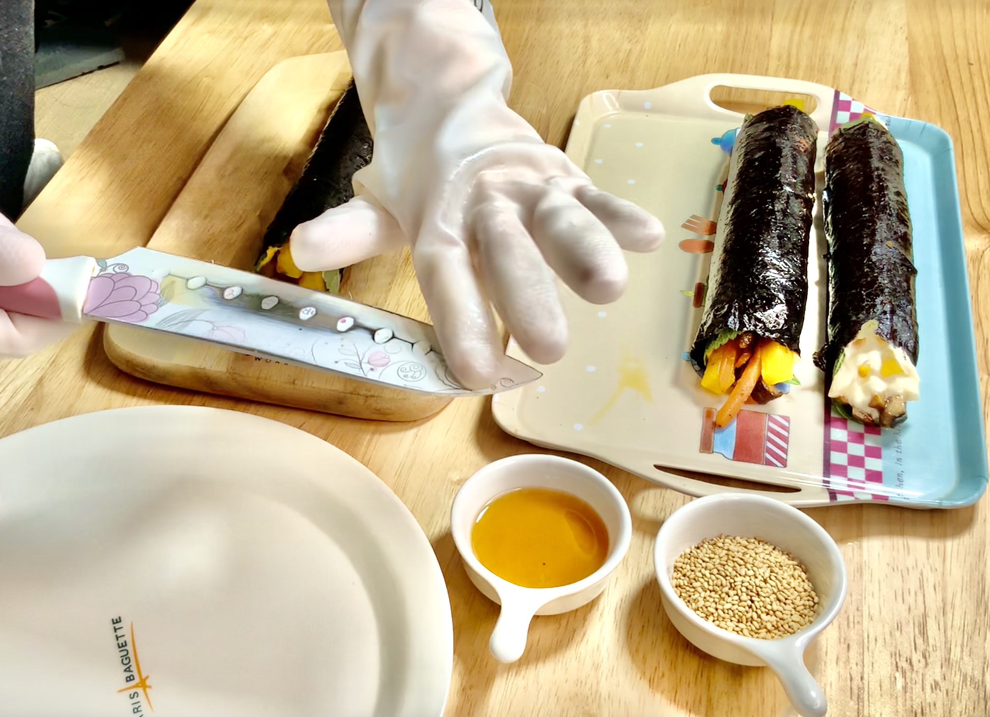 김밥을 조금 흔들듯이 자르니까 훨씬 더 잘 잘리면서 김밥이 터지는 것도 막아주는 것 같아요.