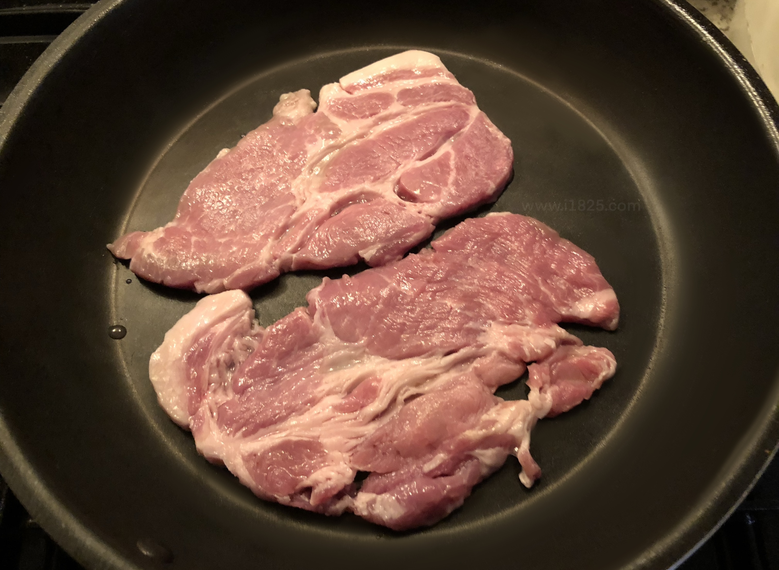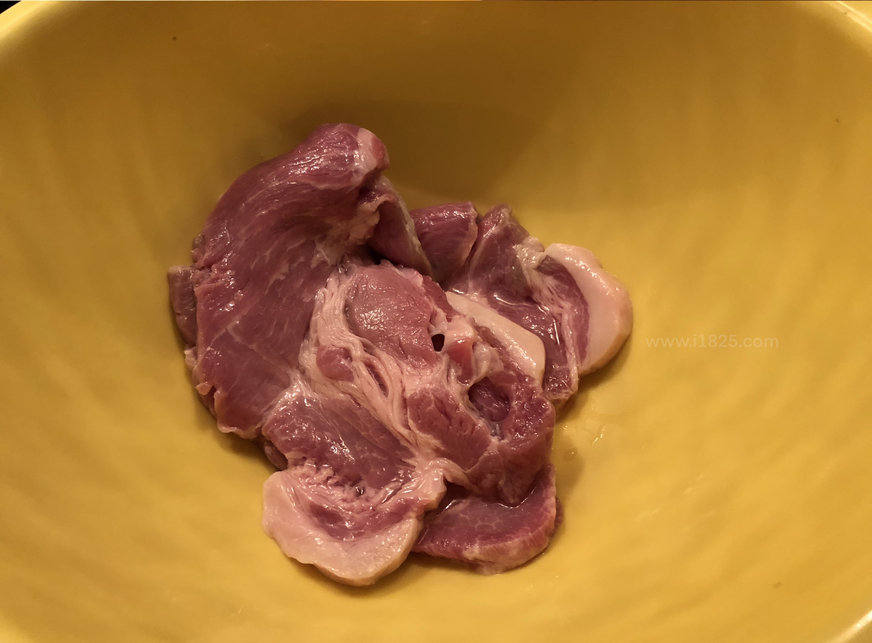 4. 밑간을 해서 준비해 두었던 돼지고기를 드디어!! 꺼내어 간단히 채를 썰고 달궈진 팬 위에 올려줍니다.