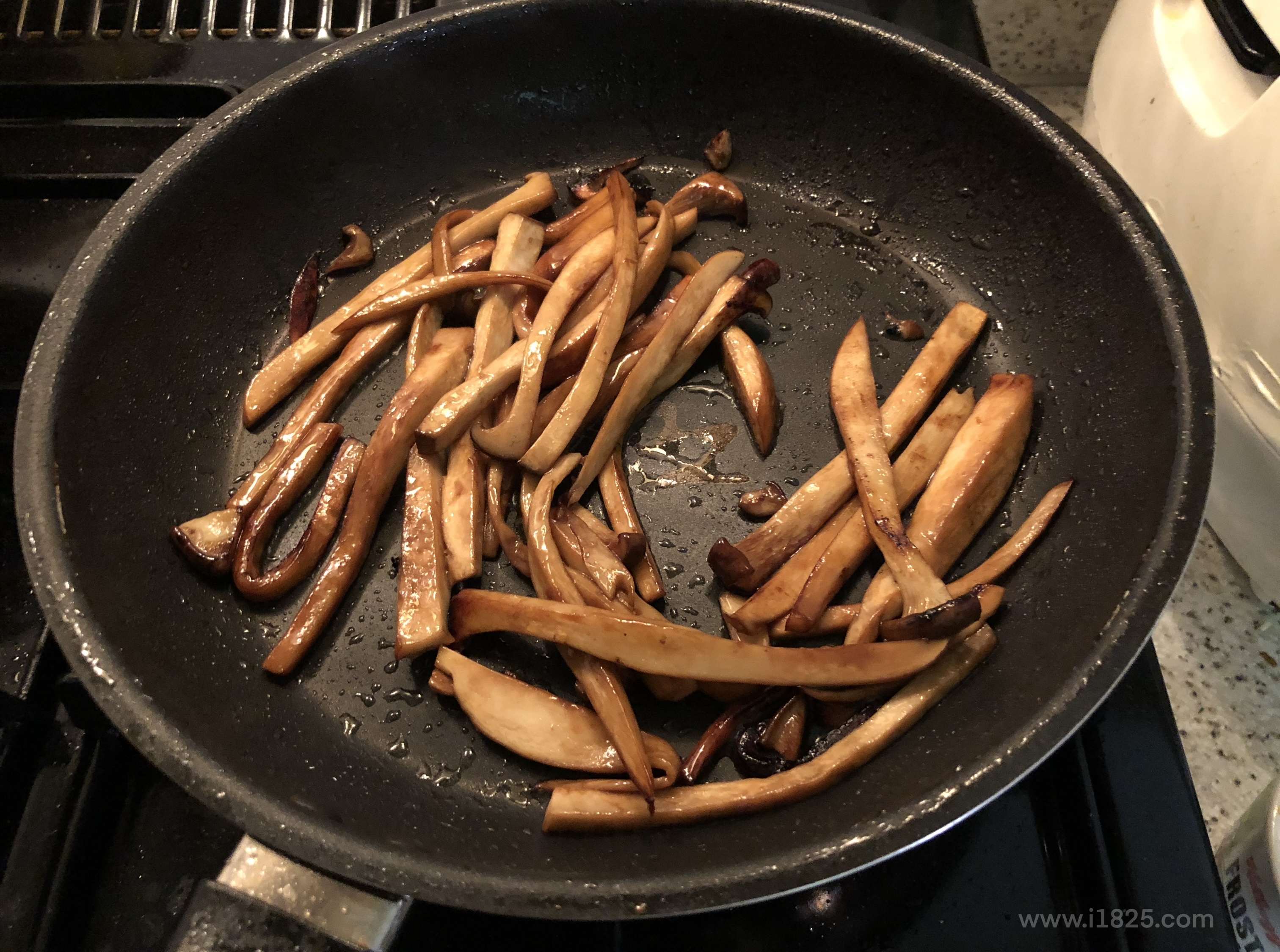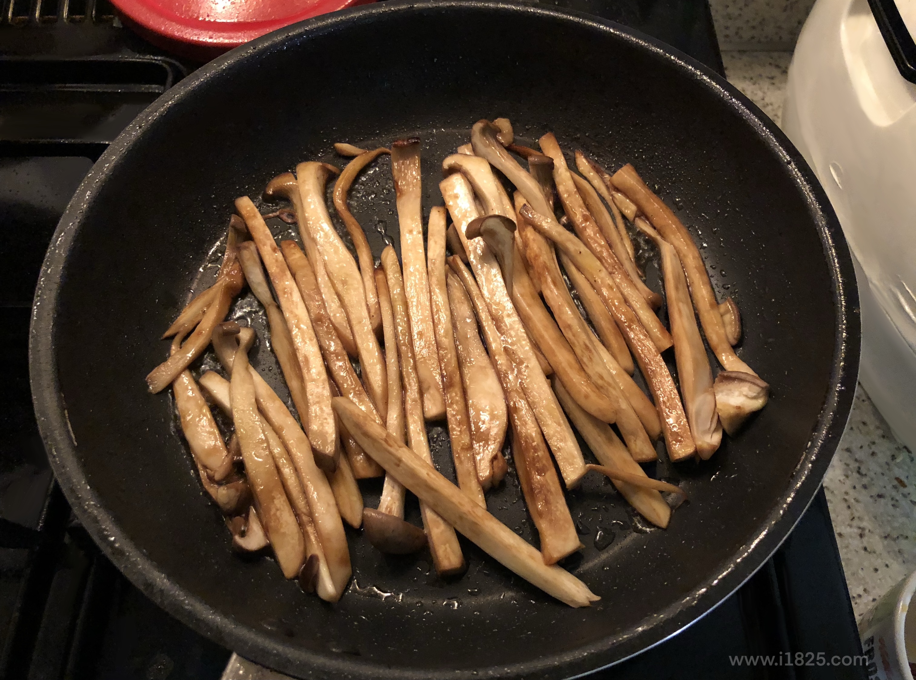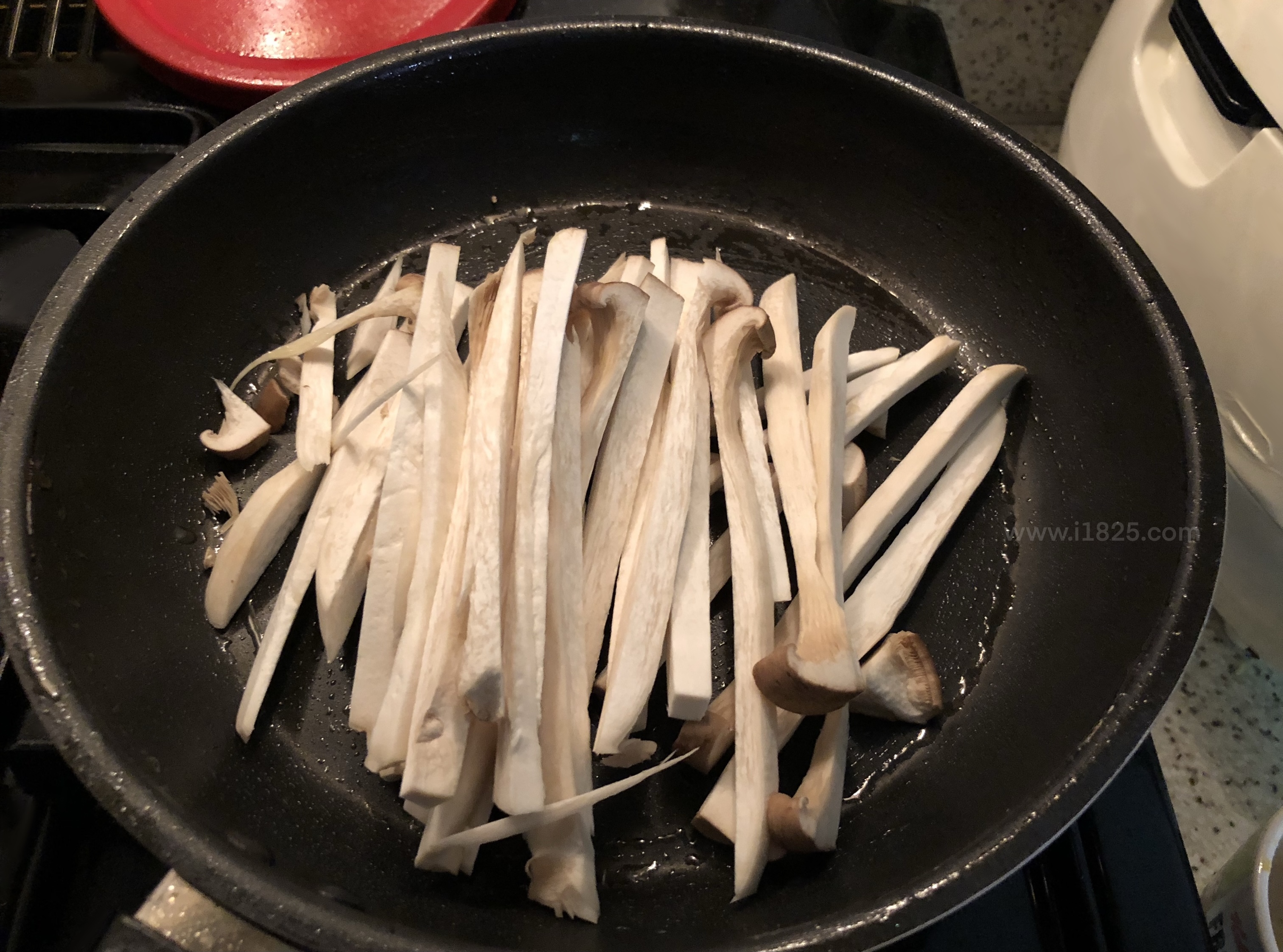 3. 버섯을 채를 썰어 올리브유 두른 달궈진 팬에 노릇하게 볶아줍니다.