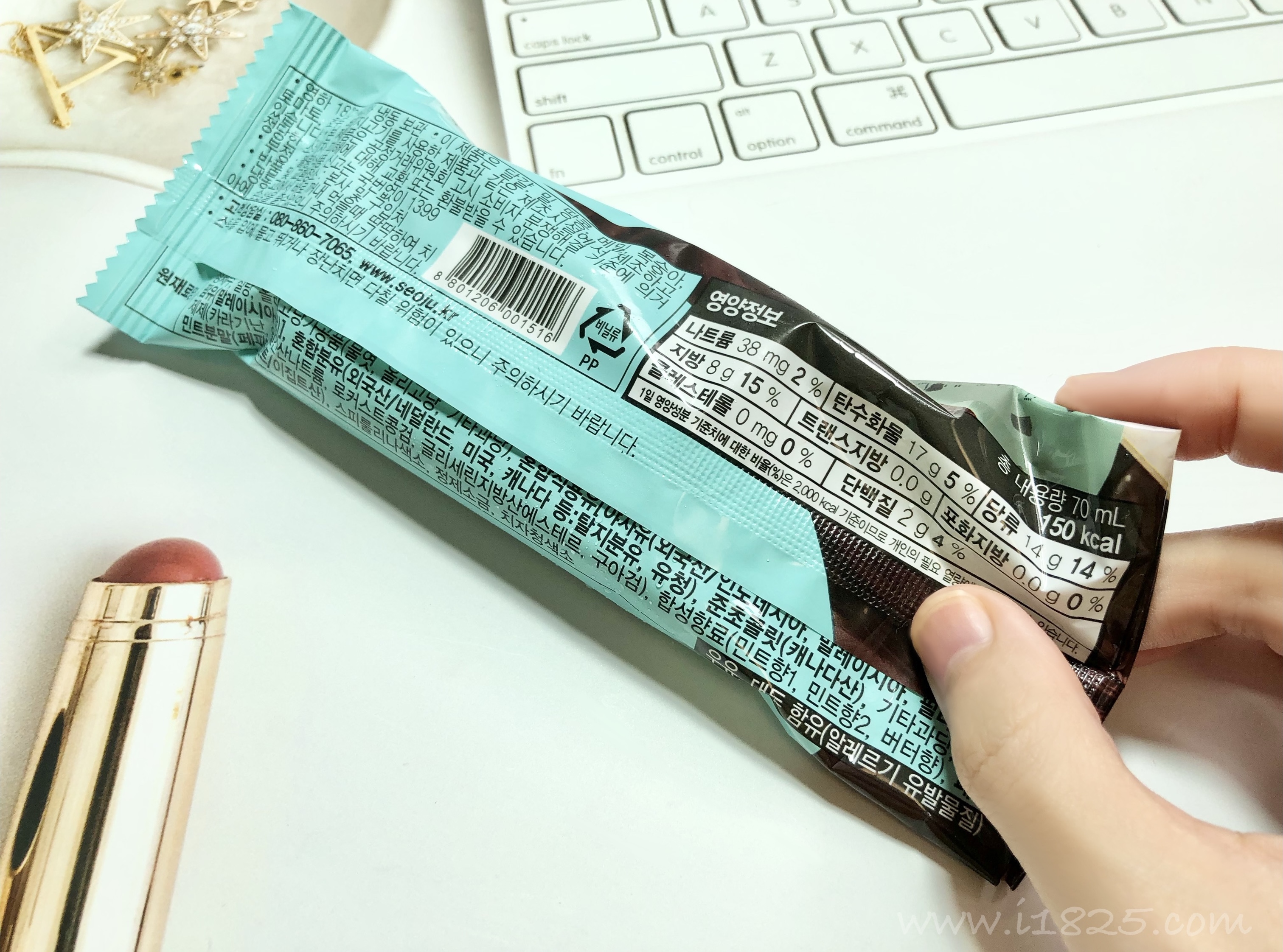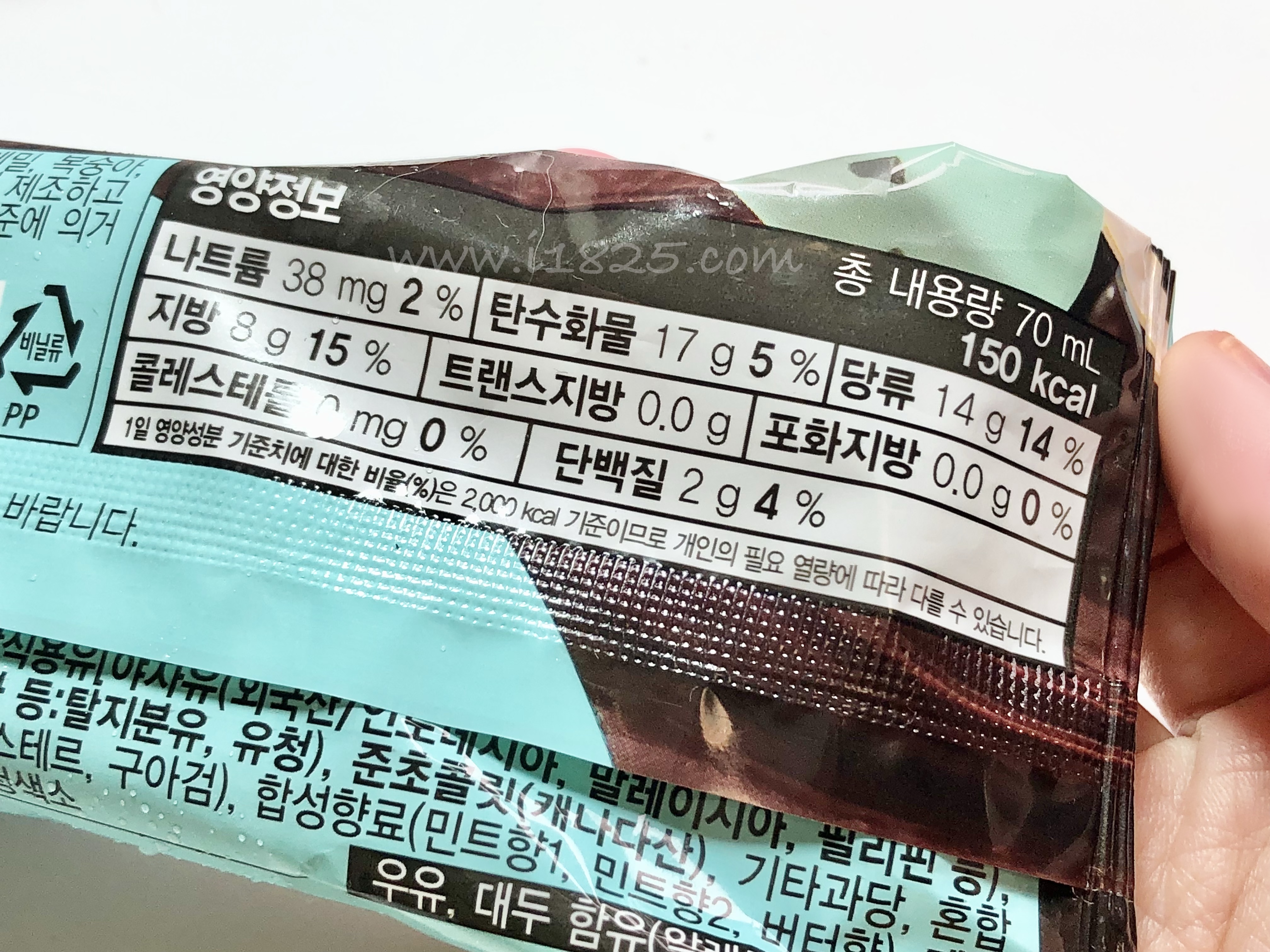 | 정제수, 설탕, 올리고당가공품(물엿, 올리고당, 기타과당), 혼합식용유(야쟈유: 외국산/인도네시아, 말레이시아, 필리핀 등), 팜유(말레이시아산), 혼합분유(외국산/네덜란드, 미국, 캐나다 등: 탈지분유, 유청), 합성향료(캐나다산), 기타과당, 혼합제제(카라기난, 알긴산나트륨, 로커스트콩검, 글릿린지방산 에스테르, 구아검), 민트분말(페파민트/ 이집트산), 스피룰리나 색소, 정제소금, 치자청색소송 |