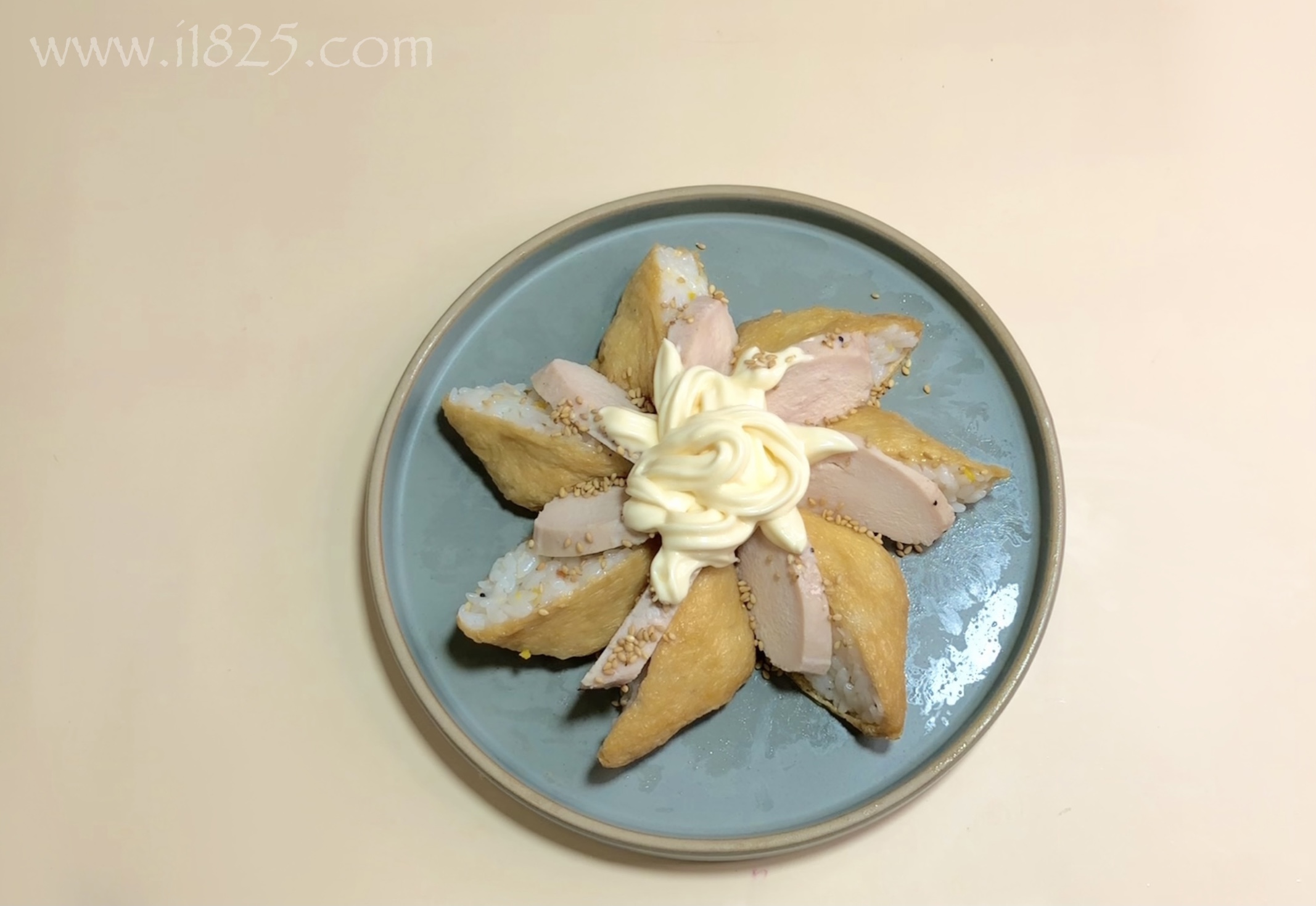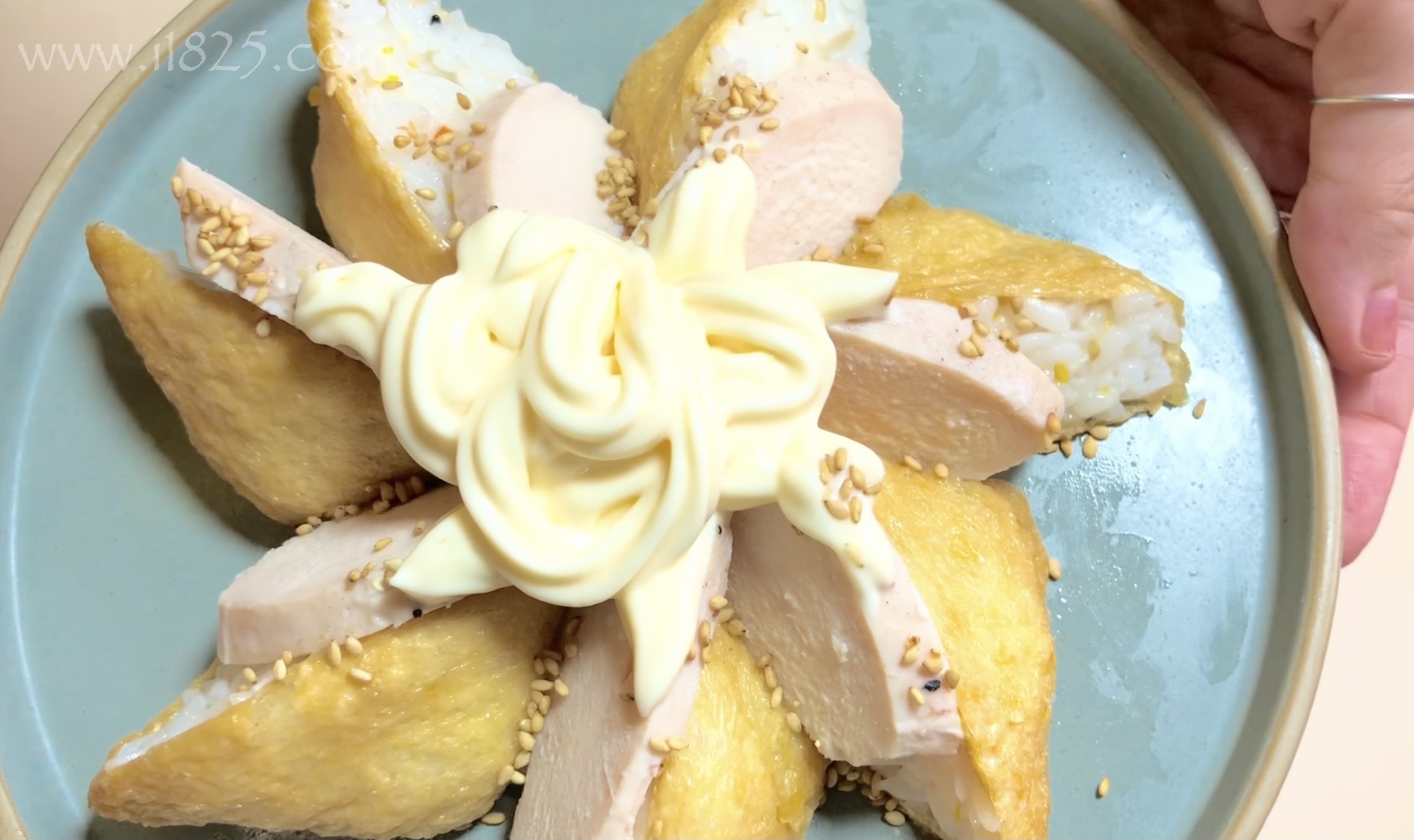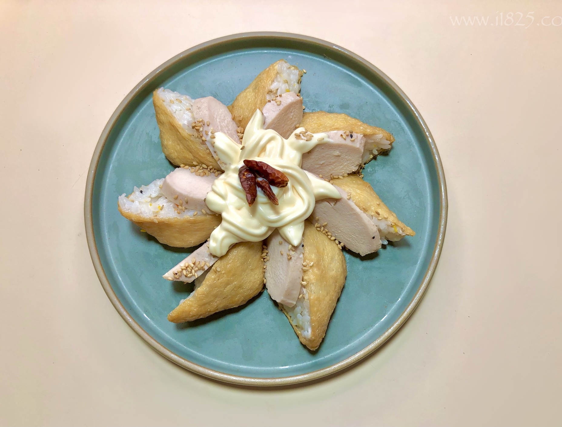 페퍼론치노홀 3개를 데코의 마무리로 마요네즈 중앙에 톡톡톡 올리면 이제 완전히 초간단 유부초밥 만들기가 완성되었습니다!