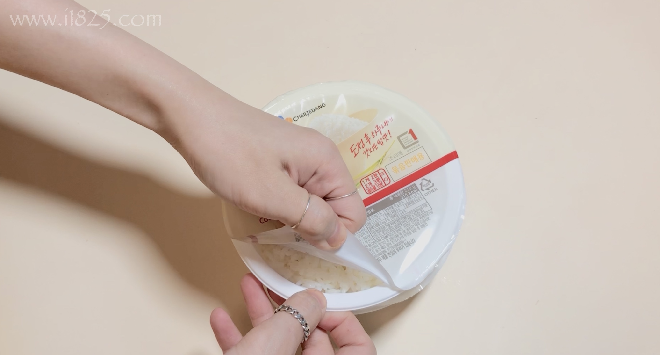 그 시간동안 햇반을 개봉한 후 전자레인지에 4분 동안 돌립니다.