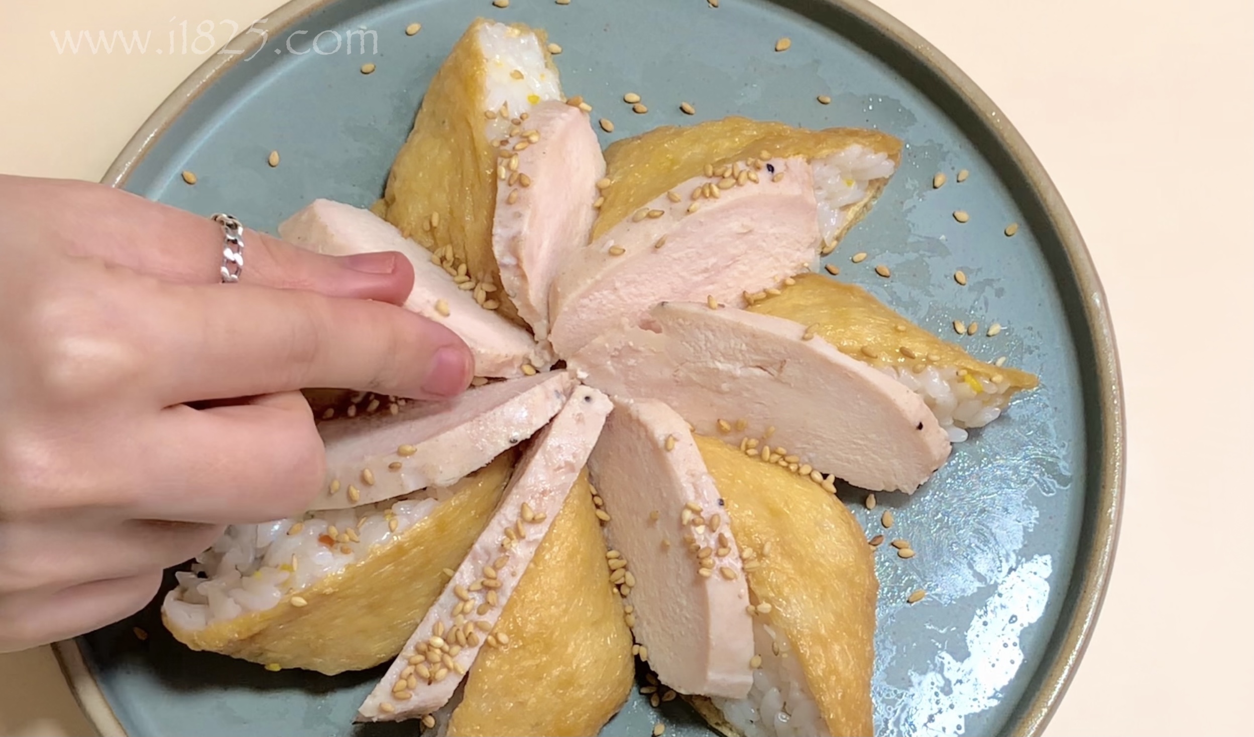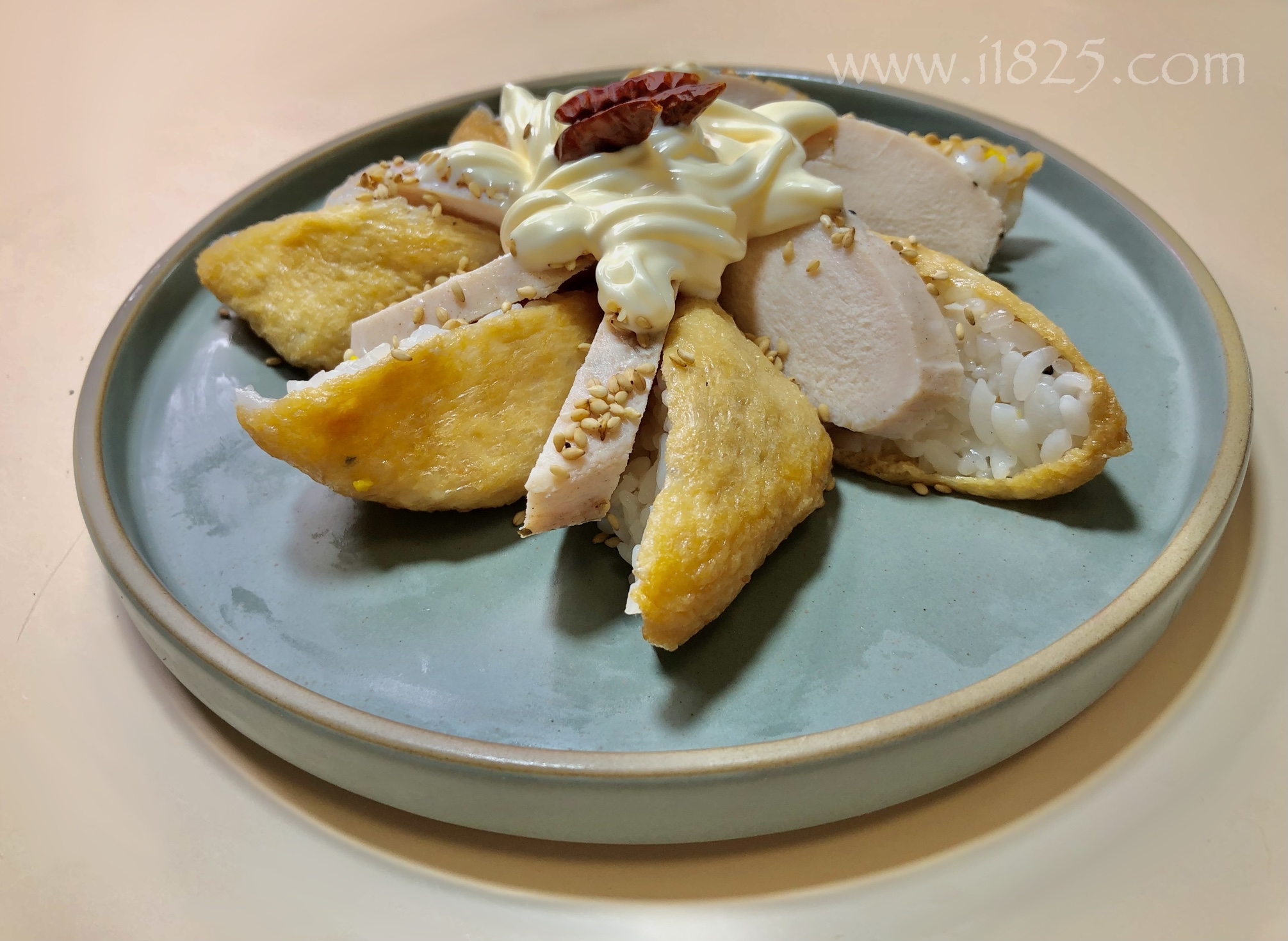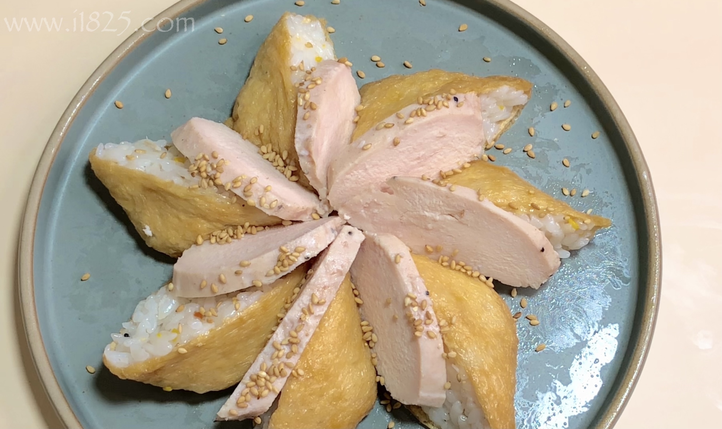 뭔가 접시에 완성한 유부초밥을 놓고 보니 뭔가 부족한 느낌이 들어서 데코용 재료를 찾다가 함께먹으면 좋을 데워먹는닭가슴살 파우치를 사용했어요.